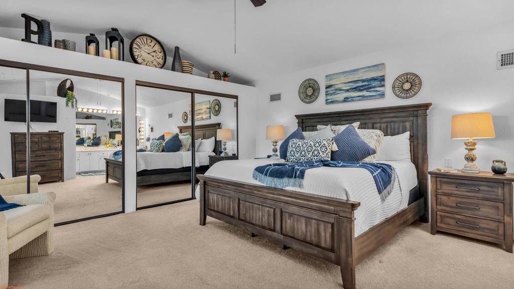 Stunning Location with Breathtaking Mountain Views!Just a short stroll away from the clubhouse for drinks and dining, as well as the golf shop, gym, and card room. You're only a stone's throw from the pool, community mailbox, and have easy access to the street.This condo features two master suites--one upstairs and one downstairs. The upstairs bedroom is enormous, offering spectacular views, while the downstairs suite provides convenience for those who prefer to avoid stairs and stay close to the living area. The vanity and shower area have been beautifully remodeled.The living room and patio are perfect for hosting gatherings and showcase lovely westerly views. Throughout the condo, new dual-pane windows allow abundant sunlight while keeping dust and heat at bay. The new aluminum wood patio cover is both sturdy and low-maintenance. This space serves as an ideal home away from home or a permanent residence.Woodhaven features a clubhouse complete with a golf shop, lounge and dining area, card room, gym, and library, along with opportunities for golf, tennis, and pickleball.