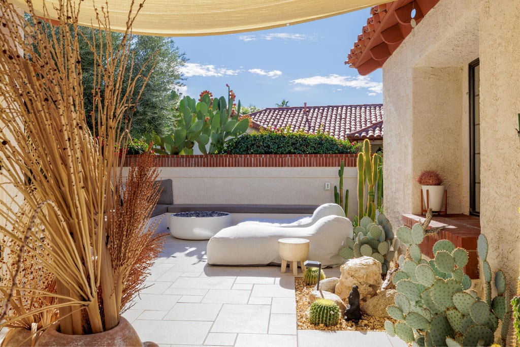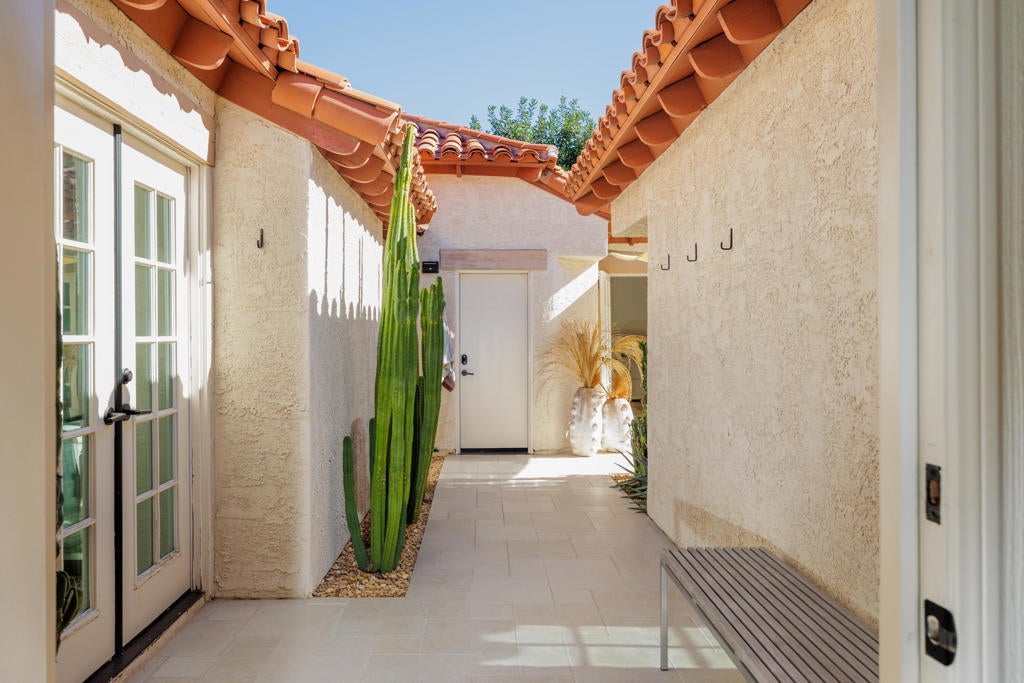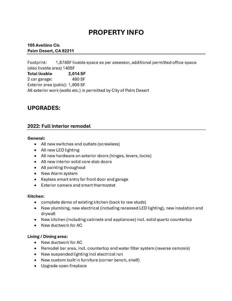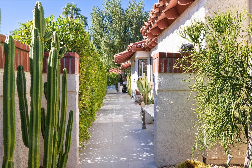 Turnkey European Modern Designer Home | Fully Furnished | Exceptional Outdoor LivingRare opportunity to own a beautifully curated home by a renowned European architect and designer couple, blending Austrian precision, Scandinavian minimalism, and Mediterranean warmth into a refined international aesthetic.Set behind a gated front courtyard, the home immediately offers a sense of privacy and serenity. This thoughtfully designed 3-bedroom, 3-bath + den residence was completely remodeled in 2022 with luxury finishes, custom details, and exceptional craftsmanship. Extensive upgrades include newer AC and ductwork, updated electrical runs, switches, and outlets.The chef's kitchen was rebuilt from the studs with newer plumbing, electrical, custom cabinetry, premium appliances, and solid quartz countertops. A remodeled wet bar includes reverse osmosis water filtration and custom lighting. All bathrooms feature newer vanities, plumbing, water closets, shower systems, doors, bathtub trims, and ventilation. The casita/office (converted 3rd-car garage) was fully rebuilt with recessed AC, newer electrical, and insulation.High-end furnishings include a custom natural-wood dining table and built-in pieces in the living room, dining room, and primary suite. The primary bedroom features a dramatic floor-to-ceiling driftwood and mirror barn door.Outdoor living is equally impressive, with multiple furnished patios for dining, lounging, and entertaining, surrounded by curated, high-end landscaping. A mature olive tree anchors the space with true Mediterranean character.Offered fully furnished, this turnkey home delivers elevated design, seamless indoor-outdoor living, and an exceptional lifestyle. The renovations are extensive and too many to list. See attached floor plan and list of features/renovations. Enjoy a resort-style experience with extensive services and amenities included in your HOA dues: 24-hour guard-gated entry, tennis & pickleball courts, fitness center, and community pools. Located minutes from El Paseo, fine dining, and world-class retail. Close to the Acrisure Arena--home of the Coachella Valley Firebirds and a venue for major concerts and events. The privately owned Desert Falls Country Club offers pay-as-you-play or membership options.