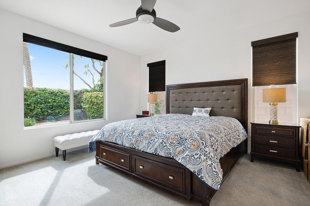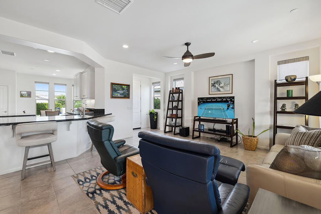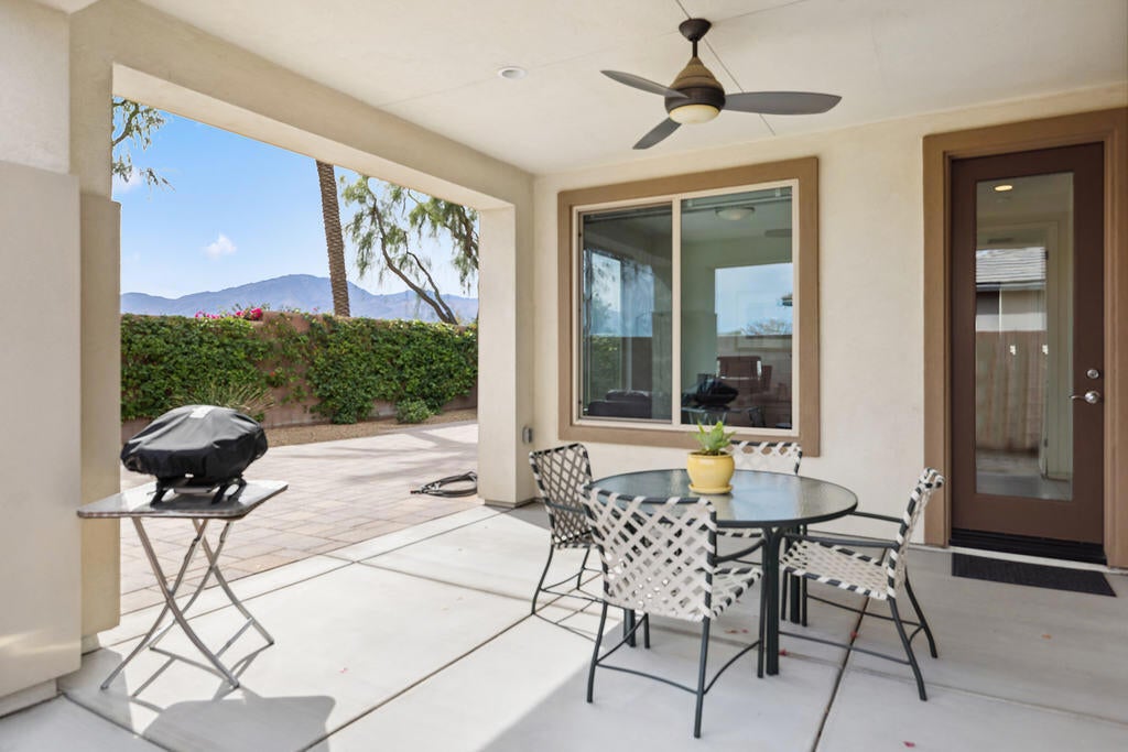 Located behind the guard gates, Trilogy at the Polo Club is an active adult community (55+). This well-located Monaco floor plan features a large courtyard entry finished in pavers, perennial flower beds and Ficus for privacy. This well-maintained home features unobstructed Santa Rosa mountain views from the Great Room, Den and Primary Bedroom. The front courtyard and kitchen capture views of the San Bernardino mountains. The large south facing backyard is finished in pavers & planters including a covered patio with ceiling fan and gas BBQ connection. Enjoy the palm trees illuminated at night with no homes behind to obstruct the mountain views. The Polo Club venue includes June Hill's Table restaurant & bar, coffee bar, resort pool, lap pool, jacuzzi, tennis & pickle ball courts, card room, golf simulator, billiards, fitness center, banquet facilities and artisan studio. The Polo Club homes are designed by Bassenian Lagoni architects with contemporary elevations, sited on curve linear streets, beautiful lake, illuminated walking trails and pocket parks featuring a putting green, bocce ball court, chess game among others. The Monaco floor plans include an entry foyer with side window and coat closet. The Great Room includes a ceiling fan and dining space, and adjacent flexible den with unobstructed mountain views. LED ceiling can lights are throughout the house. Designer electronic shades in the Great Room and Den. The Primary bedroom enjoys unobstructed mountain views, a ceiling fan and ensuite bathroom with dual vanity with quartz top and walk in closet. The Secondary bedroom includes a ceiling fan and adjacent bathroom with tub/shower. The kitchen includes granite counter tops with an island, under cabinet lighting and separate breakfast room with curved linear windows overlooking the front courtyard. The kitchen is equipped with upgraded GE appliances. The laundry room includes side by side washer & dryer with upper cabinets. A tankless hot water heater is in the 2-car garage with plenty room for storage. The flooring is porcelain tile throughout with carpeting in the bedrooms.