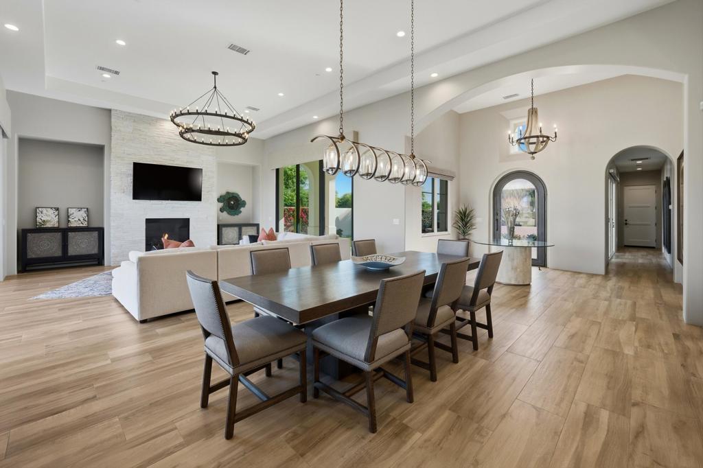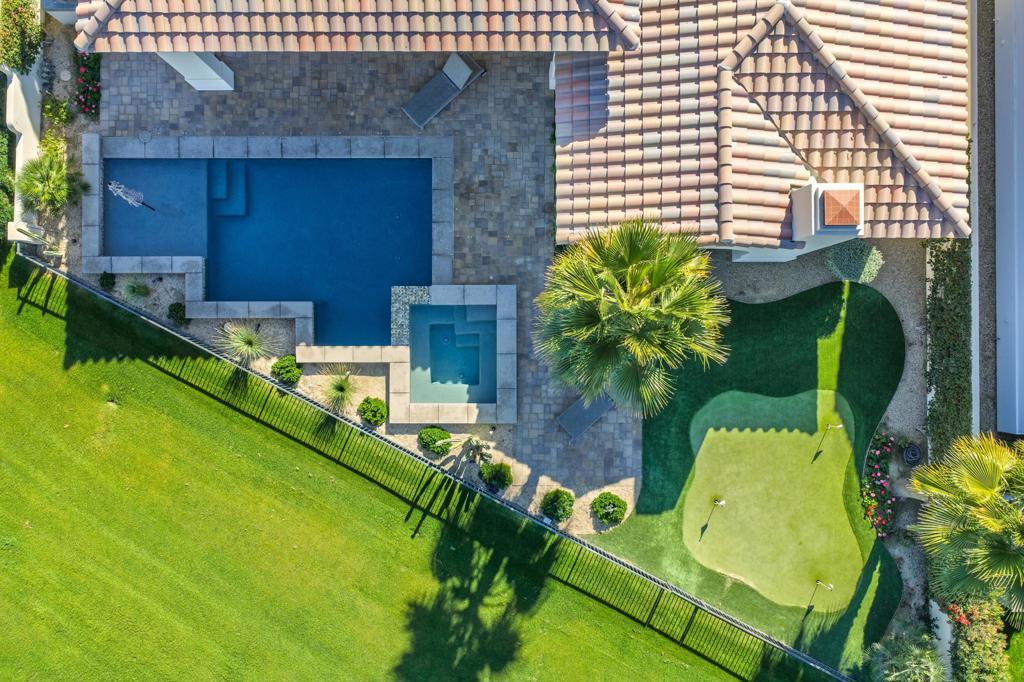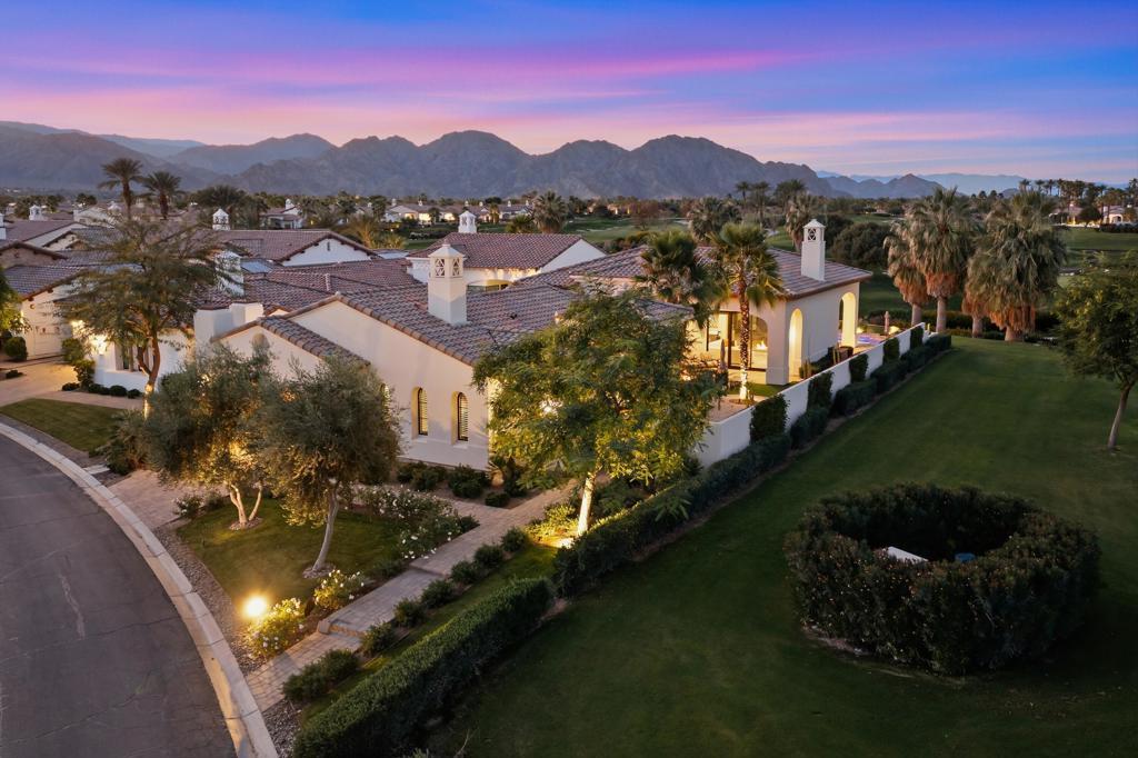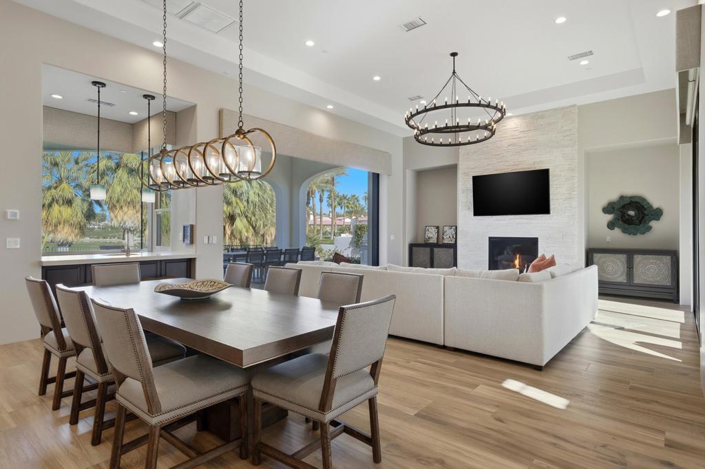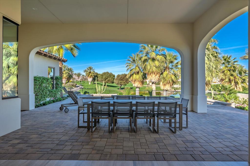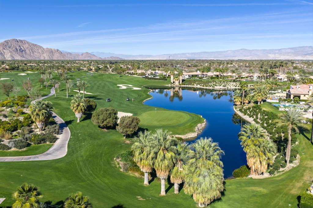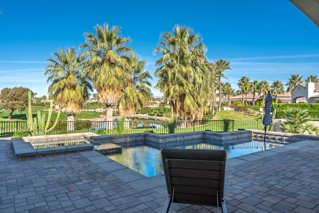 Set on a coveted end lot bordered by a lush greenbelt, this exceptional residence offers remarkable privacy and sweeping desert beauty from nearly every angle. Thoughtfully positioned to capture lake views, the 5th green, and the 6th fairway of the Rees Jones designed course. The home is further framed by dramatic vistas of the Santa Rosa and Coral Mountains, visible from both the courtyard and the backyard. The outdoor living spaces are truly special. A private courtyard welcomes you with a cozy fire pit that is perfect for evenings under the stars while the backyard is designed for both relaxation and play, featuring a personal putting green and serene golf course views that stretch into the distance. The expansive open space creates a quiet backdrop, reinforcing the home's relaxed, resort-style atmosphere. Inside, the 4-bed, 5-bath home is designer furnished, blending comfort with refined style. Wood-look ceramic tile flooring runs throughout the main living areas, adding warmth and continuity to the interior spaces. The great room is anchored by a striking stacked-stone fireplace, creating a natural focal point and an inviting atmosphere for entertaining or quiet nights in. Every detail has been curated to complement the home's surroundings, allowing the outdoor views to take center stage while maintaining a sophisticated, modern feel inside. This is a rare opportunity to own a private, view-oriented retreat where indoor and outdoor living come together seamlessly. Come live the life you've always imagined.