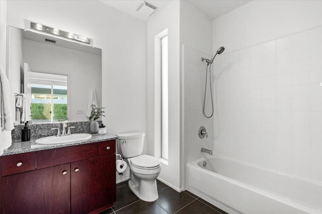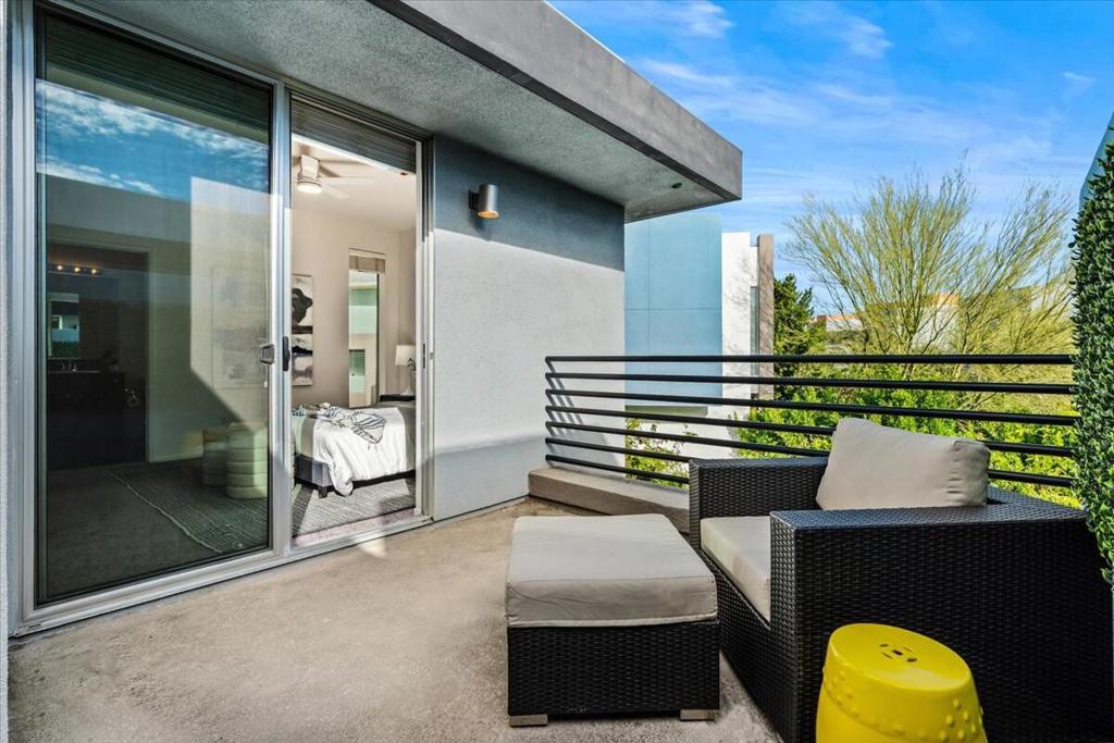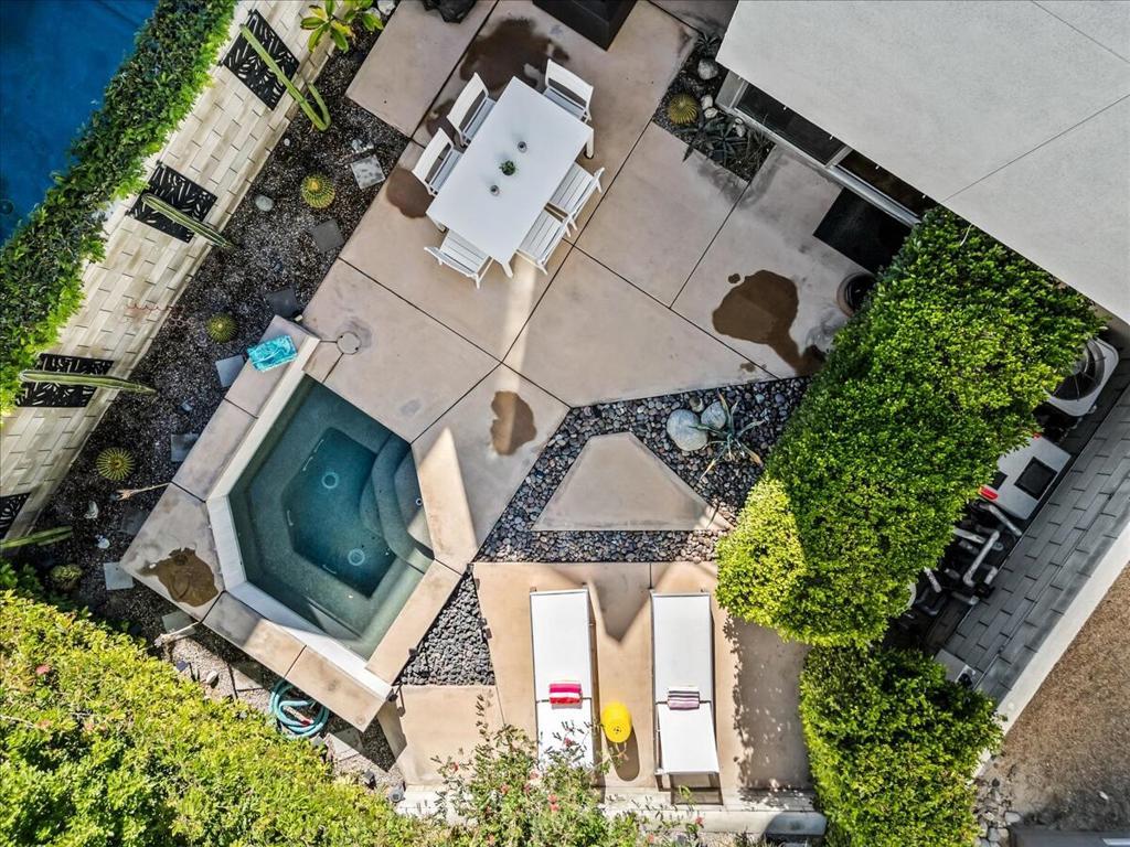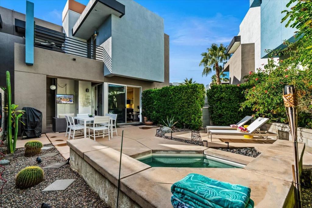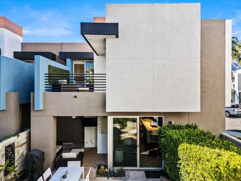 Welcome to 250 Enterprise Way, a beautifully staged Model A residence situated within the gated Palermo community of Palm Springs.This is the largest and most sought-after floor plan in the neighborhood, featuring two bedrooms, a spacious loft, two and a half bathrooms, and 1,387 square feet of bright, open living space designed for contemporary desert living.Positioned as a private end unit with the front entrance facing south, the home boasts an expansive backyard retreat equipped with a private sparkling pebble-tec spa, complete with newly installed pumps, ideal for indulging in the Palm Springs lifestyle. An outdoor misting system encircles the entire patio, creating a tranquil setting conducive to entertaining, relaxing, and enjoying warm summer evenings under the stars.Inside, high ceilings and abundant natural light cultivate an airy and welcoming atmosphere throughout. The home has undergone thoughtful renovations, including a remodeled kitchen, brand-new carpeting, and a refreshing interior paint palette that harmonizes the space aesthetically. The open living and dining areas seamlessly flow into one another, rendering the home both stylish and comfortable.Paid solar (6kw), a paid soft water system, and a newer air conditioning system enhance the home's efficiency. The upstairs loft offers flexible utilization as a home office, media space, or guest retreat, providing some of the most exceptional mountain views within the residence.A one-car garage, rare additional driveway parking, and proximity to guest parking enhance the home's everyday convenience.Located directly across from the clubhouse, Palermo is renowned for its contemporary architecture, resort-style ambiance, and prime Palm Springs location.This presents an exceptional opportunity to acquire one of Palermo's most desirable layouts and truly experience the Palm Springs lifestyle.