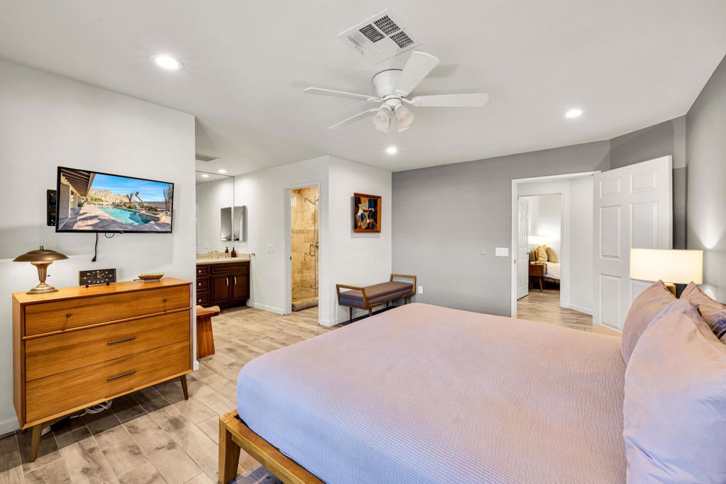 Welcome to this luxurious retreat surrounded by the Santa Rosa Mountains. Peacefully situated at the very top of The Upper Cove. Walk across the street to Bear Creek Trailhead. This home is one of the most unique vacation destinations in the desert. Privacy and Comfort. You and your guests can Relax or lap swim in heated saltwater pool. Enjoy the spa under the massive star studded evening sky. This beautiful home has an open floor plan with all 3 bedrooms with baths nicely situated for privacy. Fully equipped kitchen and dining areas for great entertaining. The property also offers RV parking w/hook up. Maximum Privacy. La Quinta has become a vacation destination for all who love hiking, golf, tennis, pickleball, dining, shopping and great weather. Desirable location is close to Old Town La Quinta and also the World Renown La Quinta Resort and Spa. Available Feb 3 to March 28 This home is available for Monthly Rental. Make this your destination in the desert. Not available July and August, 2025