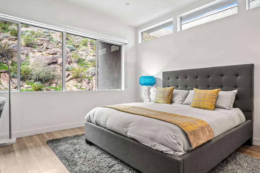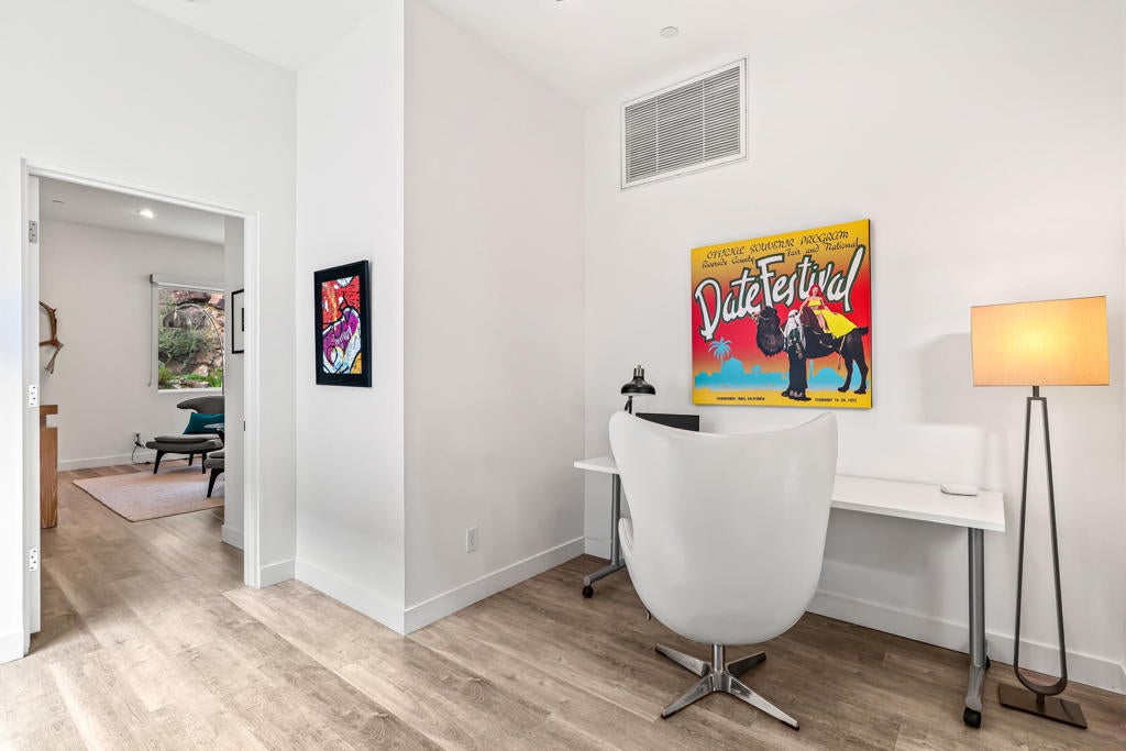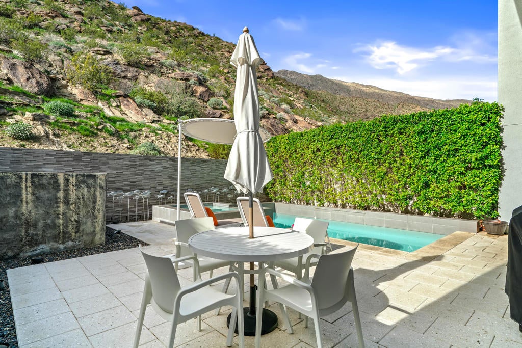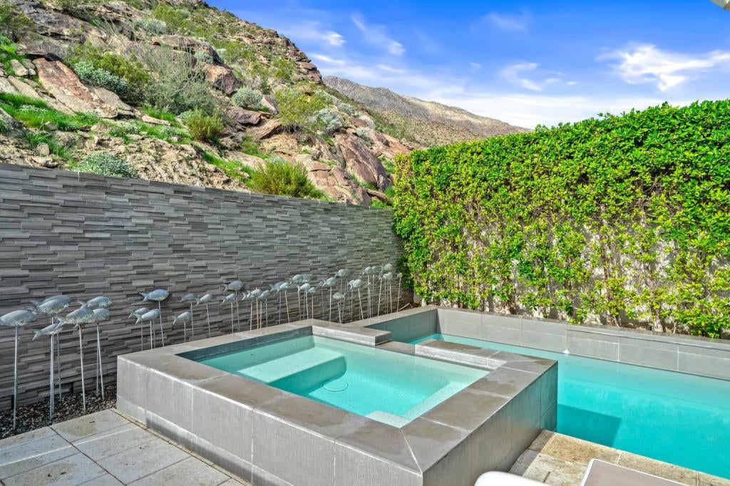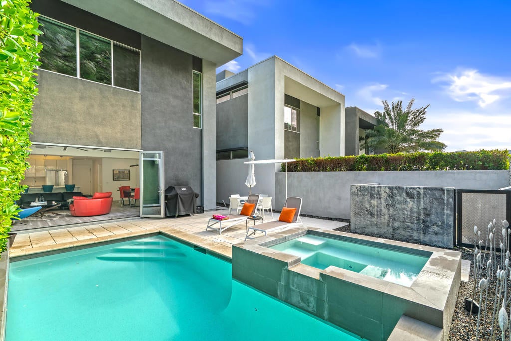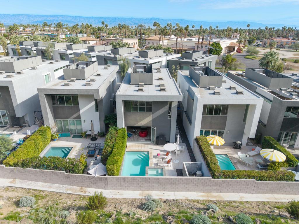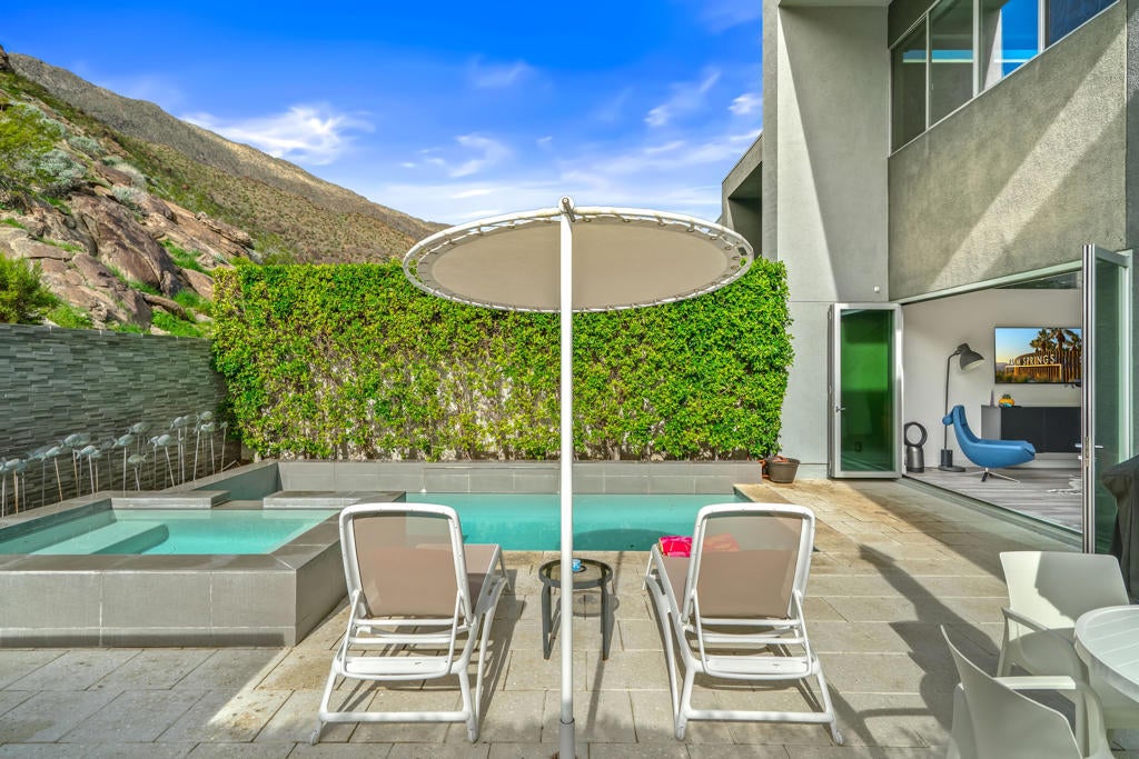 Best value at the Dakota! Nestled within the prestigious Dakota gated enclave in South Palm Springs on fee simple land, this gem offers the epitome of contemporary luxury living. With 38 single-family homes built in 2017 in a prime location near downtown with its restaurants, shops and entertainment as well as hiking trails, this property is sure to tug at your heartstrings. This home features nearly 1900 square feet of grand living space on two levels boasting two spacious bedrooms, each with its own en-suite spa-like bathroom, as well as a versatile den area perfect for a home office. The clean and modern design features luxury vinyl plank floors in the main living areas, Porcelanosa tile in the bathrooms, multiple clerestory windows with custom designer window treatments and beautiful natural light. The chef's kitchen offers Viking appliances, elegant Caesar stone countertops, and Hans Grohe fixtures. The living space seamlessly extends to the outdoors through La Cantina bi-fold doors, leading to a private backyard oasis. Here, you'll find upgraded pavers and finishes, a refreshing sparkling pool with a soothing water feature, a raised spa framing dramatic & breathtaking vistas of the San Jacinto mountains. Additional highlights include a 2-car garage with an epoxy finish, a powder room and built-in sound system. Looking for an easy move-in? this nicely furnished property can be purchased turnkey outside of escrow. Call for private viewing and experience Palm Springs lifestyle at its finest!