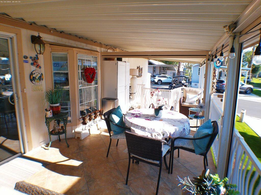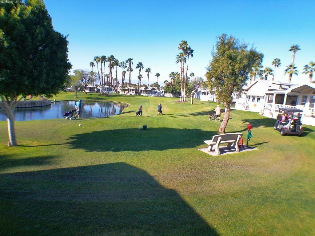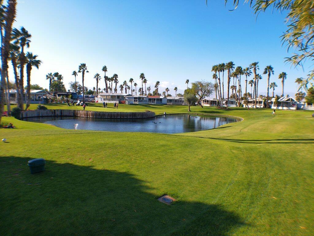Located on the 6th Tee Box. Views of Golf Course, Pond, Fountain and Mountains in Background. Awesome Sunsets from your wrap around deck which offers auto roll down screens. Built in electric fireplace, corion counter tops, W/D in shed. Covered Patio, bright and Aire inside the Park Model.