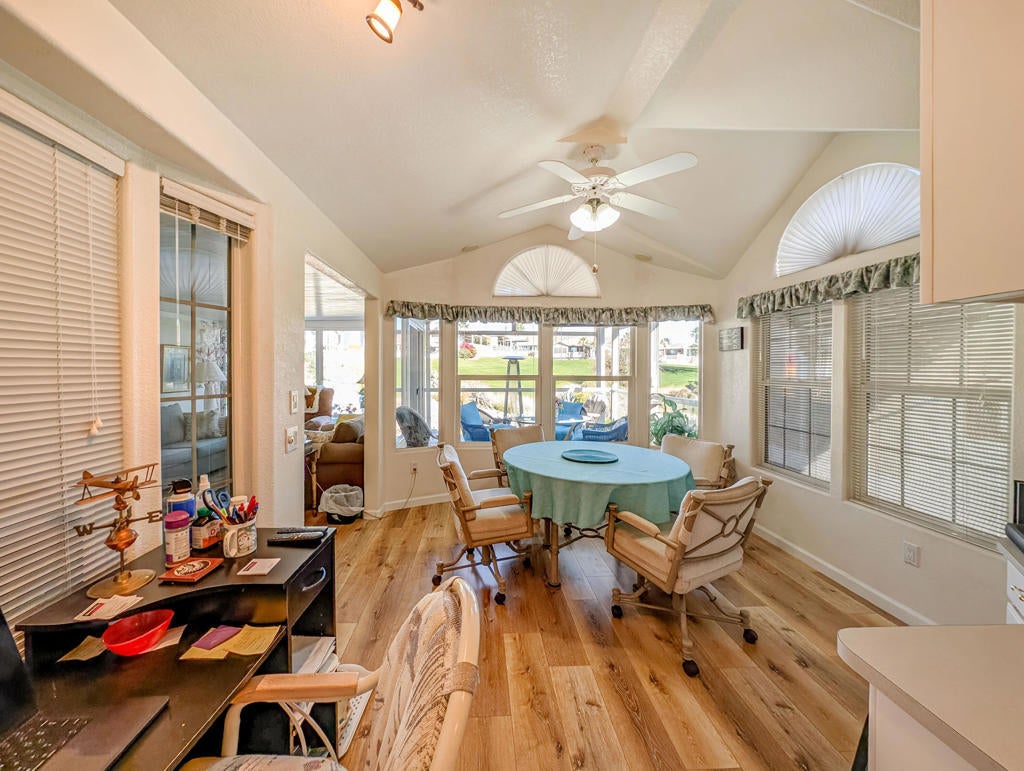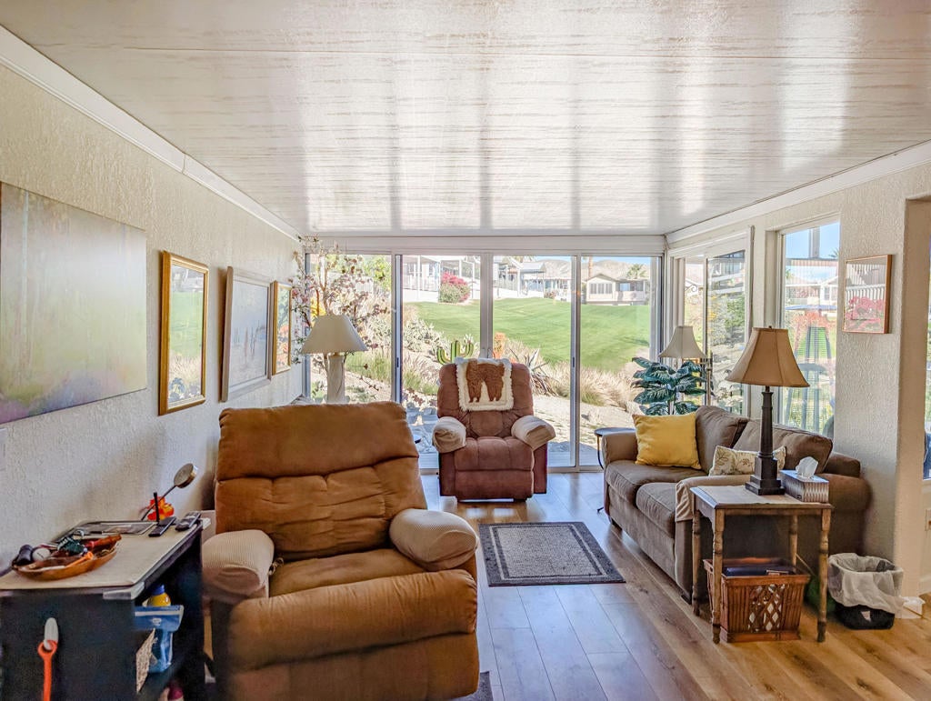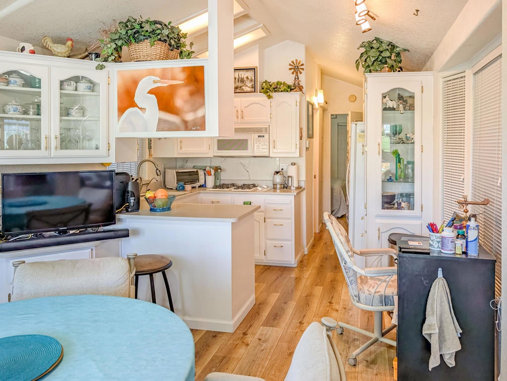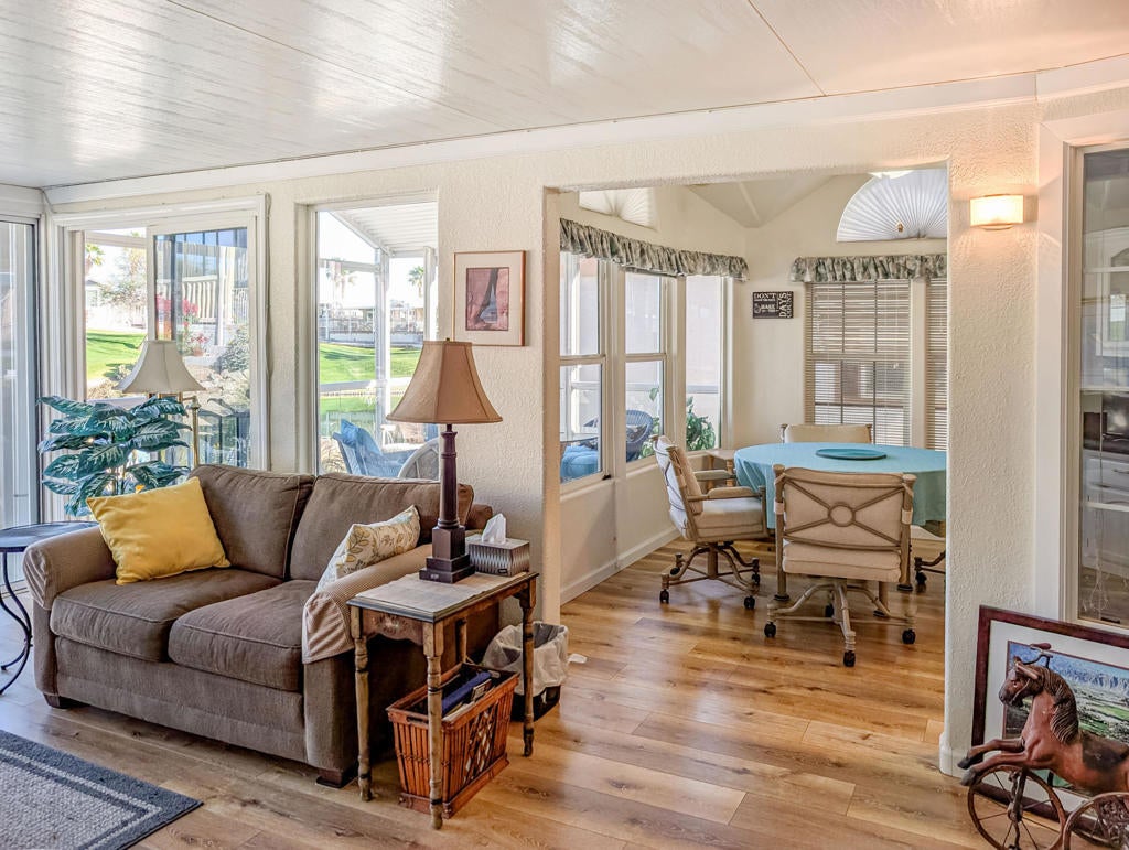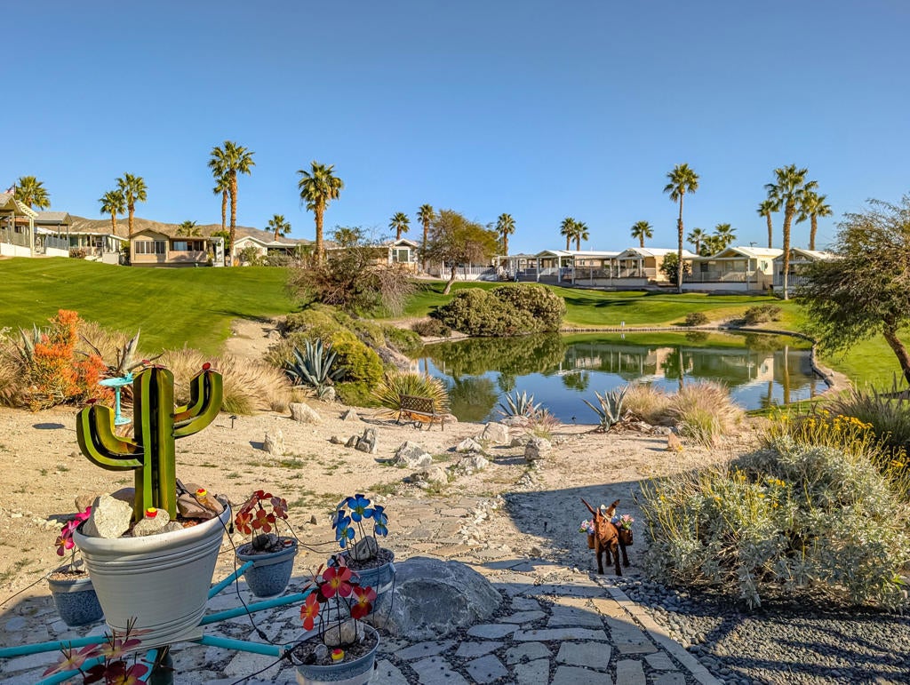 Enjoy stunning views from the 9th hole of the golf course in this attractive ~800 sq. ft. 2-bedroom, 11/2-bath 2002 Hallmark Park Model home. The spacious California room features wall-to-wall sliding doors that seamlessly connect to the outdoor tiled, wind protected deck and overlook the paver stone courtyard, out to the scenic 9th hole and water feature, enjoy the cool evenings with outdoor heater. Recent upgrades include new flooring, fresh interior paint, a new hot water tank, reverse osmosis drinking filter, tiled walk-in shower, and more. You'll also find plenty of storage in the large shed, plus paved parking for two vehicles. Located within the premier 55+ Caliente Springs Resort, this property gives you access to outstanding amenities: mineral hot spring-fed pool and spas, a modern fitness center, a 9-hole golf course, 8 pickleball courts, tennis courts, laundry facilities, a library, and a lively, welcoming community. Don't miss your chance to tour this upgraded home--you may find it's just what you've been looking for! Please note: the lot is leased with a space rent of $950.