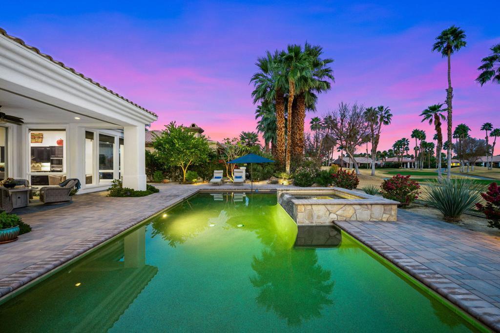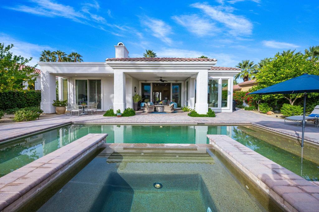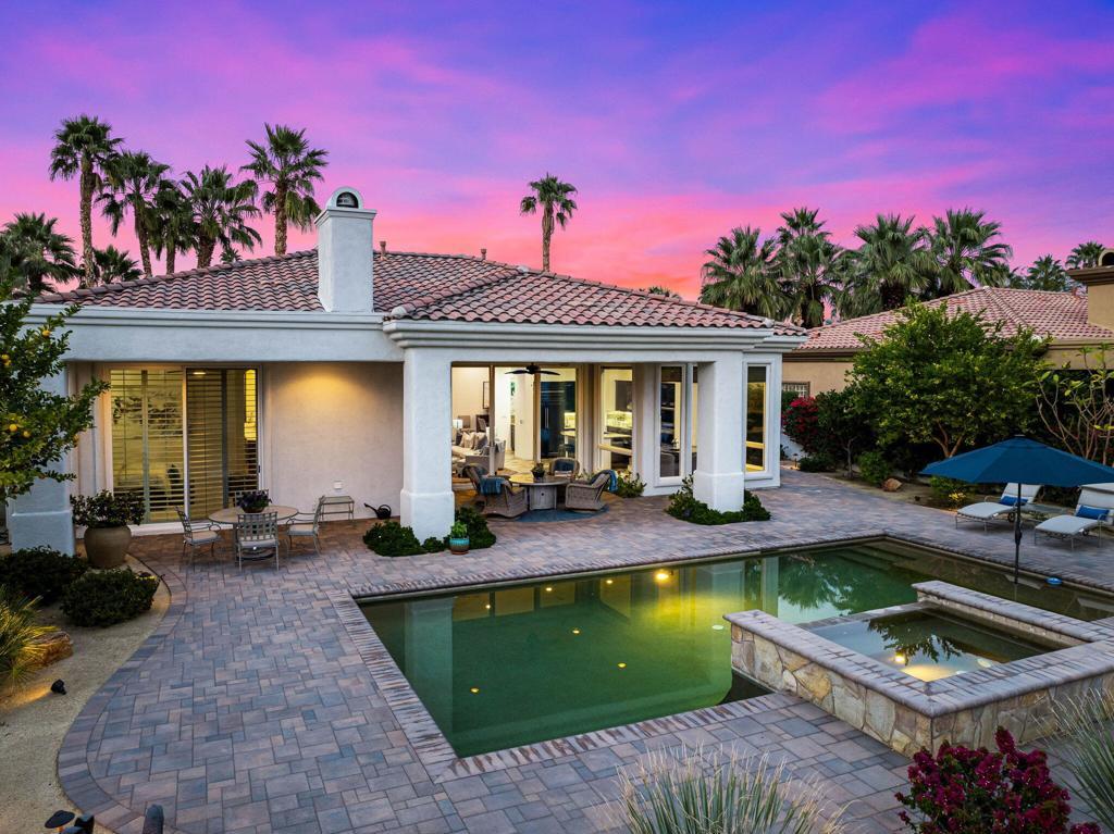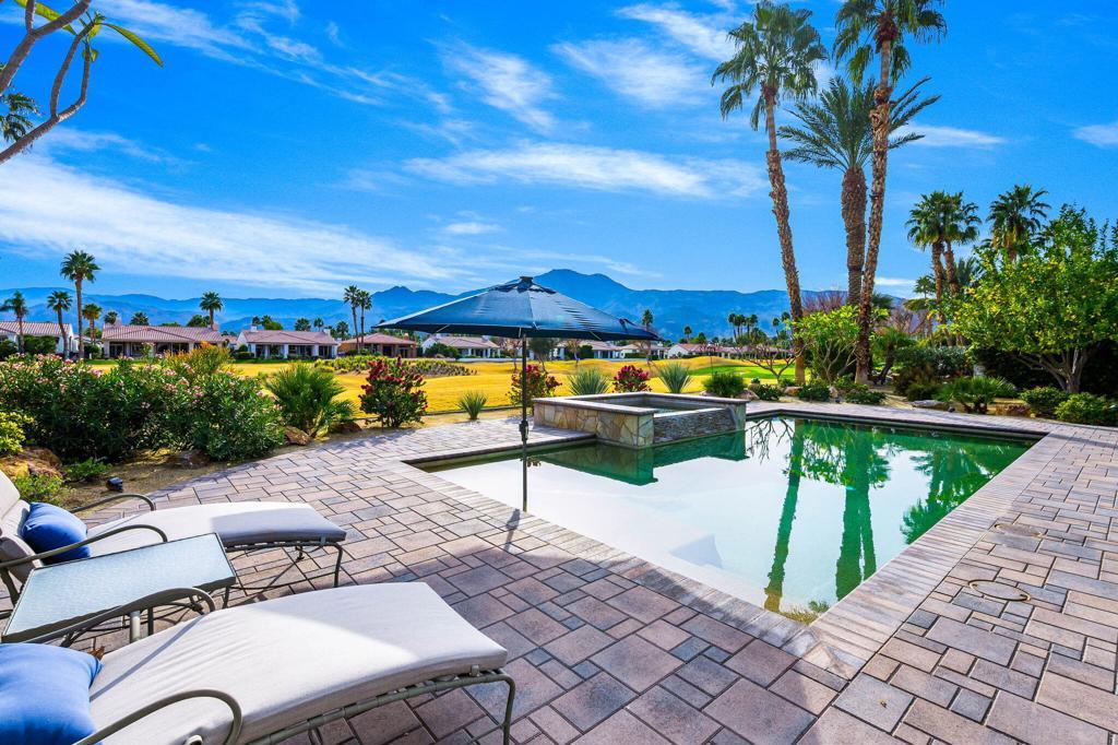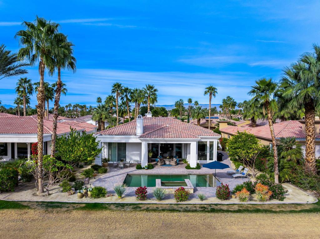 Fabulous South-facing Eagle Bend Plan 1 home with panoramic mountain views, perfectly positioned on the 17th hole of the signature Jack Nicklaus Tournament Course at world-renowned PGA West. Located on the quiet and highly desirable Bellerive Street, this exceptional residence offers 3,102 sq ft of luxury living and is loaded with premium amenities. The open floor plan features soaring ceilings and is flooded with beautiful southern light, making it ideal for entertaining and seamless indoor/outdoor living. The oversized lot showcases stunning mountain views, a private pool and spa, and overlooks the tees of a par-3 hole. The main home includes two spacious bedrooms with ensuite bathrooms, plus a powder room. A detached casita serves as the third bedroom and offers a private living area with a sofa sleeper, perfect for extended-stay guests. Upgrades include new kitchen countertops and backsplash, refinished cabinetry, high-end stainless steel Wolf and Sub-Zero appliances, custom fireplaces, a designer accent wall in the living room, new exterior pavers, a tankless water heater, and a mini-split system in the garage, among many others. Offered furnished, this home truly has it all--luxury, privacy, views, and location.