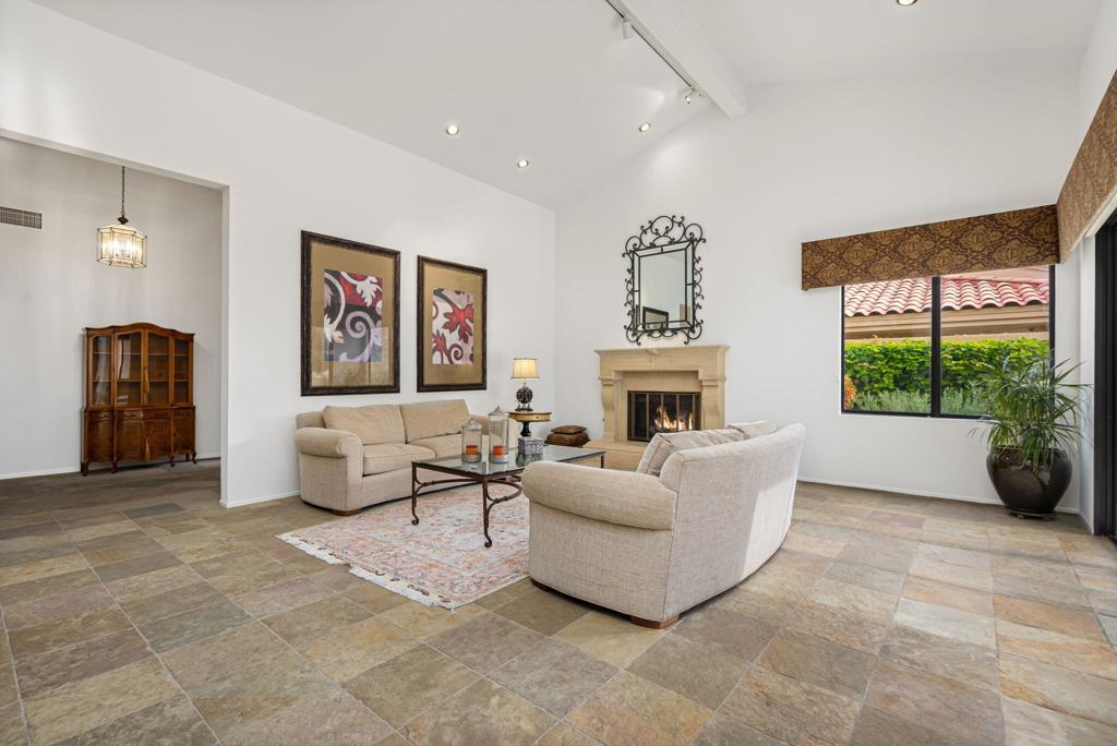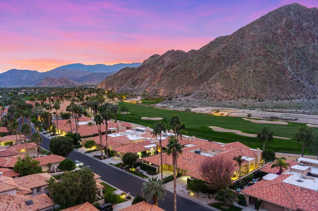 Behind the Arnold Palmer Private Gate at PGA West sits this well-appointed Legends 40 Plan on the highly desired Riviera street with unobstructed western mountain views looking onto the #14 Fairway of the Palmer Private Course. Enter the Private courtyard leading to this great end-unit townhouse. Step inside the welcoming foyer overlooking the atrium that brings excellent light into this home. The large family room with a gas fireplace offers great mountain views through the walls of glass. The carpeting has been removed and replaced with a stone-and-luxury vinyl combination. The kitchen is a cook's dream, featuring warm wood cabinetry, plenty of storage, a walk-in pantry, granite slab counters, a prep island, and a bar counter for additional seating. The kitchen overlooks the morning/bonus room, creating a great social setting and offering excellent mountain views. The primary bedroom has a spa-like bathroom with a soaking tub, double vanities, a walk-in shower, and a spacious walk-in closet. Your friends and family will enjoy the two guest rooms, each with an en suite. The wrap-around patio, with space for outdoor dining or relaxing, offers enough room for a private pool if desired, even though you are only steps away from the community pool & spa. The two-car garage is a tandem garage that can accommodate 2 cars plus a cart, and there is a separate golf cart garage.PGA West features 3 Private and 3 Public courses, tennis, pickleball, three clubhouses, restaurants, and more. HOAs include building, landscaping, irrigation water/equipment, exterior paint, roof, cable, internet, trash, and 24-hour guarded gated security.