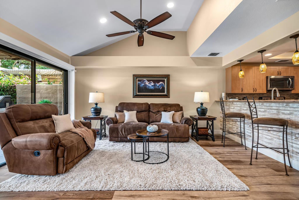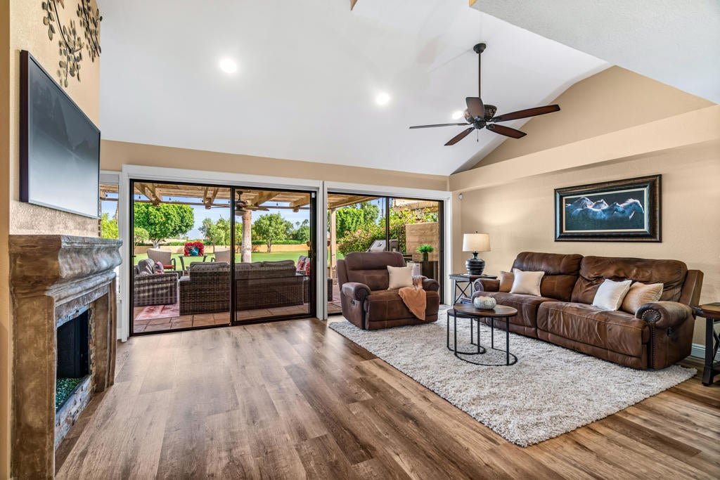 HUGE PRICE REDUCTION!!! SELLER SAYS SELL NOW - RIGHT NOW!Step into your dream home! This beautifully renovated condo offers modern luxury and comfort in every corner. The updated kitchen features refreshed cabinets, new appliances, and granite slab surfaces, perfect for entertaining. Personal design touches include electric blinds in the living room, recessed LED lighting in living room & kitchen, custom sculpted fireplace, and extra storage added in in the powder room.The open floor plan connects seamlessly to the spacious living area, where guests can relax and enjoy scenic views of the golf course.With 1,892 sq. ft. of living space, with additional sitting and office space in the upstairs master this home boasts two generously-sized bedrooms, a large 'flex' room that can be used as a den/bedroom/office/dining room, new flooring throughout, and a formal dining room with an adjacent cozy sitting area--perfect for winding down with your favorite beverage. The rear patio features a French drain and refurbished patio slab. New skylight brings in extra natural light and more custom cabinetry added in the garage.Located in the exclusive Woodhaven Country Club, residents can enjoy an 18-hole golf course, a full clubhouse, dining options, a fitness center, tennis and pickleball courts, and four pools and spas--heated during the winter months.Plus, with shopping and dining just a short walk away, this centrally located desert paradise offers the perfect blend of convenience and resort-style living. Your dream home awaits!