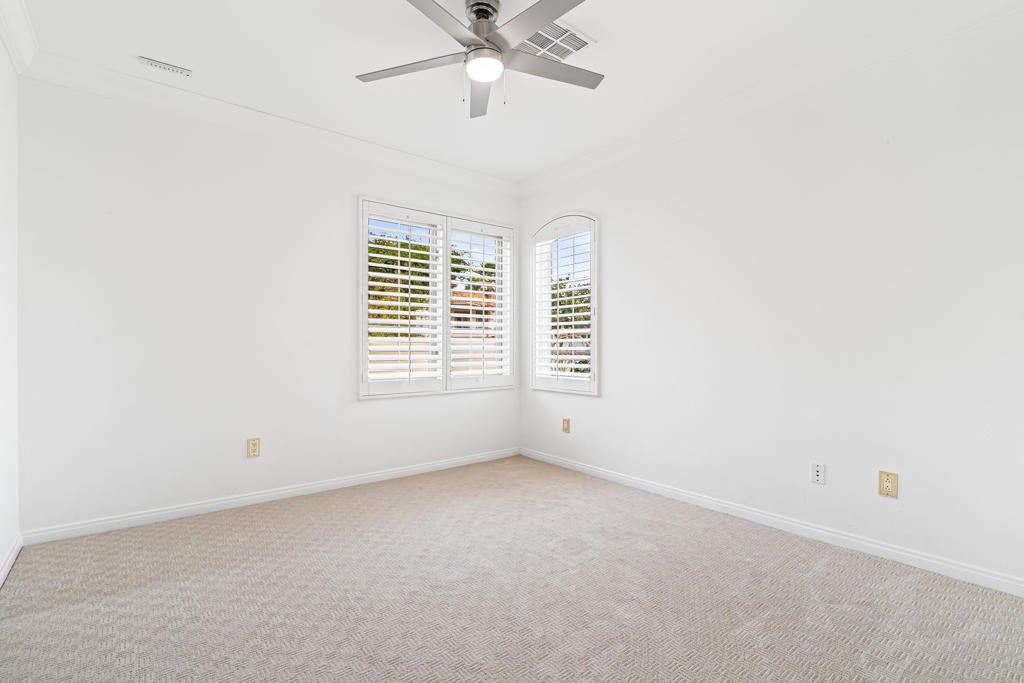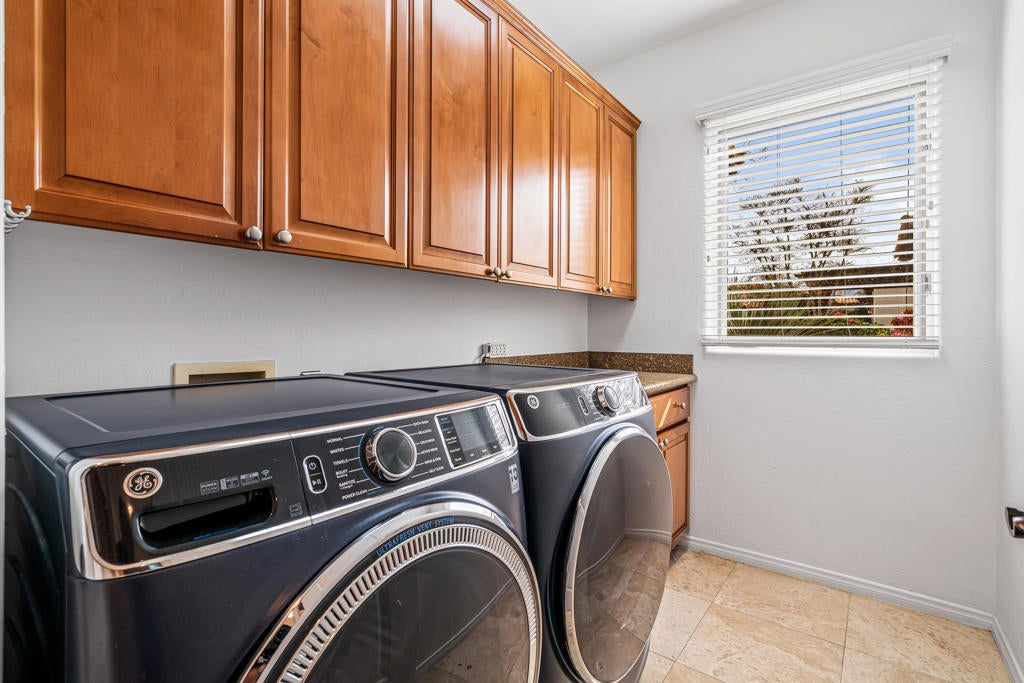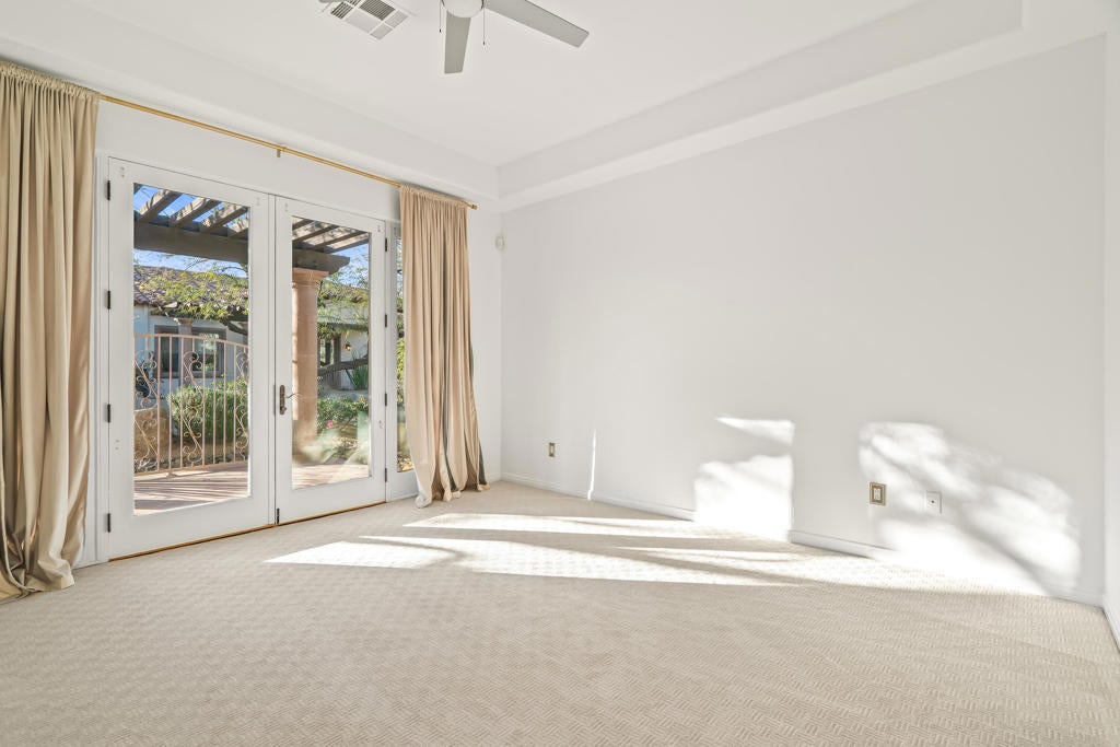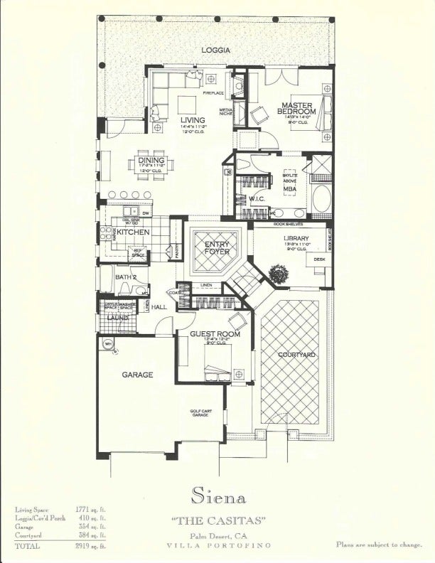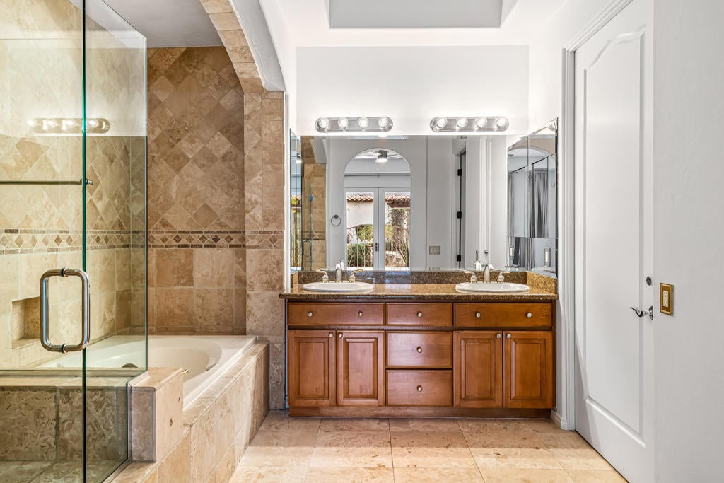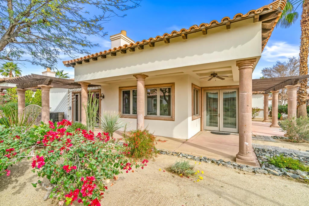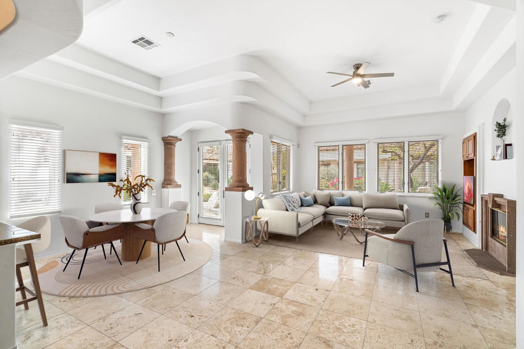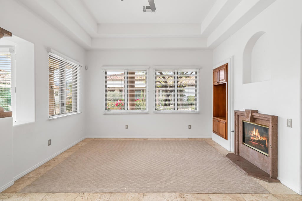 Welcome to Villa Portofino, a premier 55+ community in the heart of Palm Desert. This desirable Siena floor plan offers two bedrooms, two bathrooms, a den, living and dining rooms, fireplace, wet bar, and a wrap around patio. The home includes an attached two-car garage plus space for a golf cart.Elegant details include tray ceilings in the entry foyer, living room, and dining room; custom solid maple cabinetry throughout; and eight-foot Italian-design solid core interior doors. Travertine stone flooring highlights the entry, hallways, kitchen, dining room, bathrooms, and laundry room, with brand-new carpet recently installed in all remaining living areas.European-finished interior and exterior walls, custom stone accents, and classic Old World clay tile roofing enhance the home's timeless appeal. Eight-foot French doors and windows feature aluminum-clad exteriors, and energy-efficient Low-E insulated glass designed for desert living. Spa-inspired bathrooms showcase imported stone surrounds, including a primary bath with separate tub and walk-in shower.Additional features include R-38 ceiling insulation and insulated exterior, interior, and garage walls for enhanced temperature and sound control.Villa Portofino residents enjoy a 30,000-square-foot clubhouse with five-star resort amenities, including concierge services, movie theater, fitness center, bistro, pool, yoga studio, library, card and meeting rooms, and more. Ideally located near Eisenhower Medical Center, El Paseo shopping and dining, The McCallum Theatre, Whole Foods, Bristol Farms, and world-class restaurants.