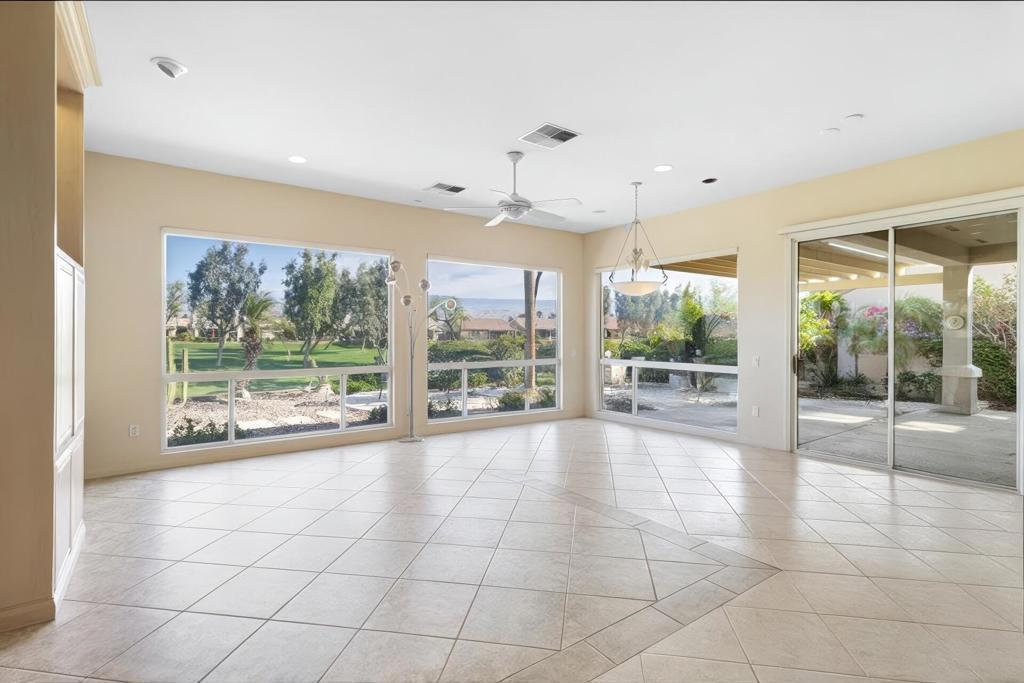 Must Sell! All offers will be entertained. On the Golf Course with Fabulous Views of the 4th Green and 5th Tee. Views of 3 Mountain Ranges-San Jainto,San Gorgonio and Chocolate Mountains. Open floorplan with floor to ceiling windows showcasing the Golf Course. Chef's Kitchen features Built in Double Oven, Granite Counters, Pullout Drawers and Reverse Osmosis Water System. Good Size Master Bedroom with Large En-Suite Bath. Bath includes Large Tub, Shower, and Large Walk-In Closet. Great Separtion of Bedrooms. Guest Bedrooms are on other side of home from Master. Ceiling Speakers in Family Room, Living Room, Master and Patio. 4 seat professional bar with ice machine ,2 beverage coolers and sink. Diamond Cut ceramic Tile, Custom Entertainment Center, Central Vacuum, and Circulating Hot Water, Alumnawood Pergola, Misting System with compressor, Mini Split in Garage. Rear yard facing Golf Course has entensive decking. Very convenient easy acces to shoppping using Varner Gate. All offers will be entertained.