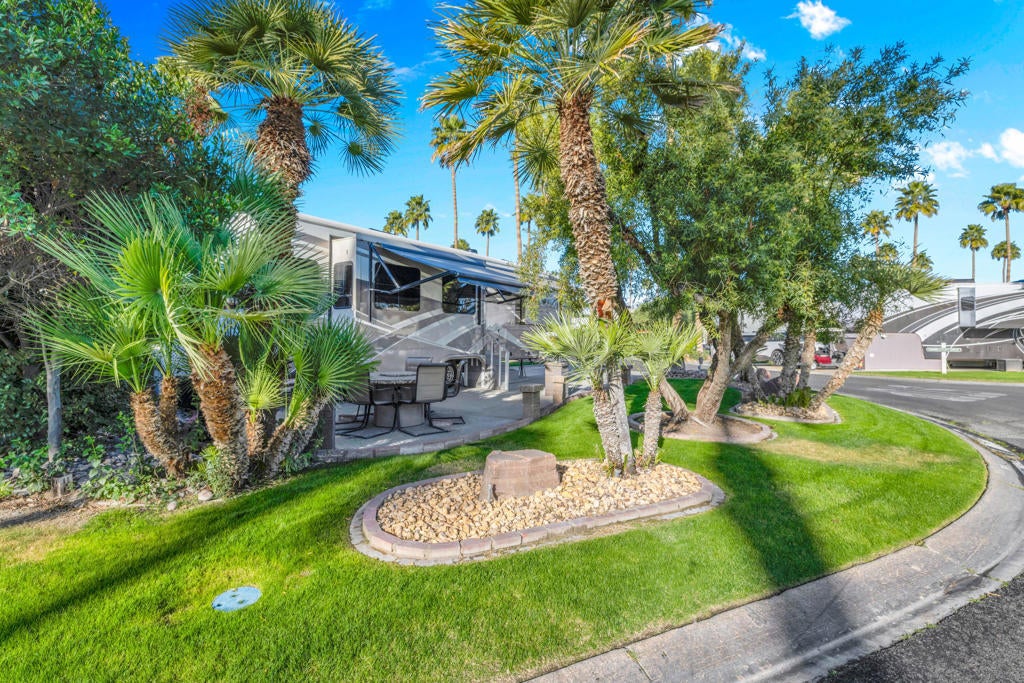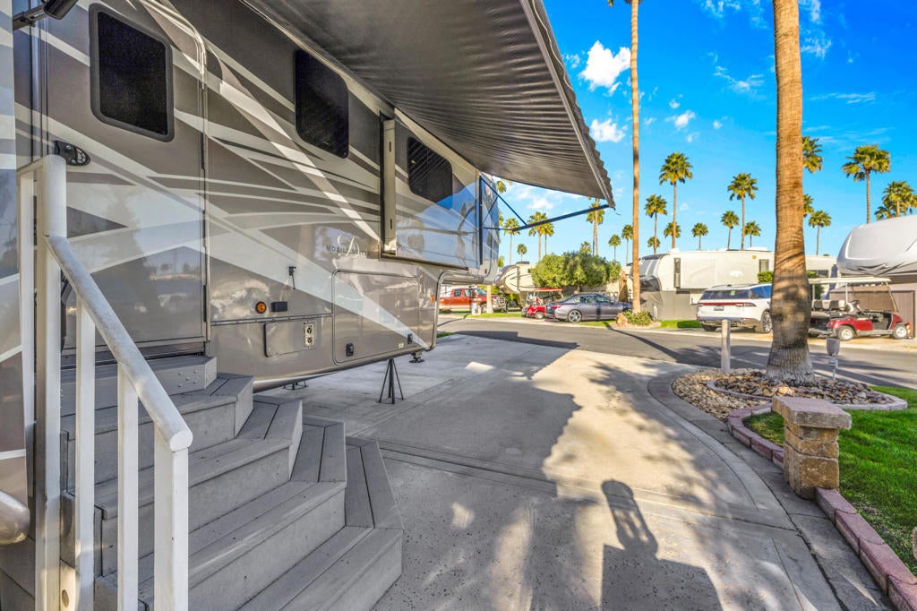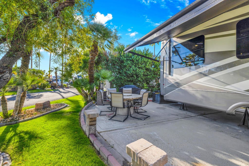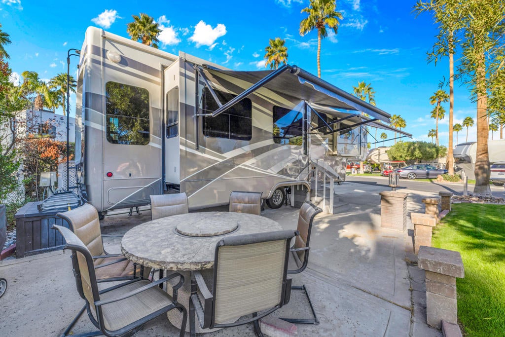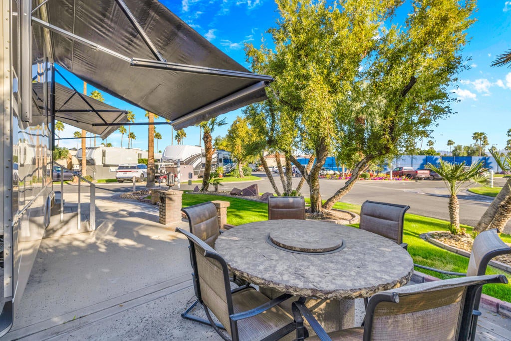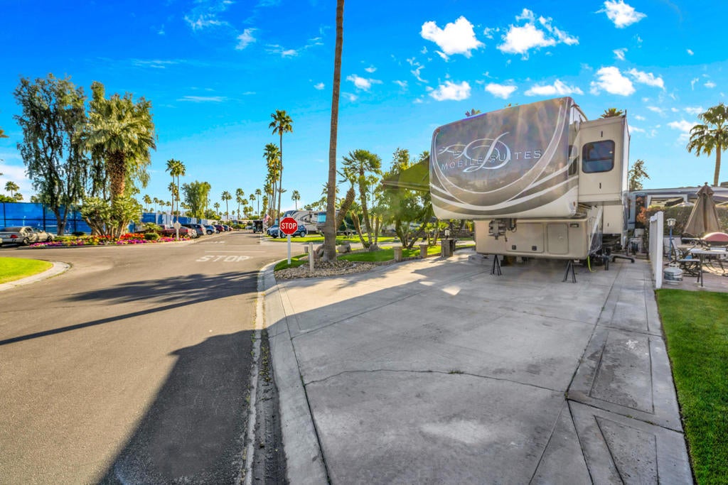 Beautiful corner lot and RV package ideally located just steps from the La Palma Clubhouse. This premium lot features mature landscaping and a spacious outdoor living setup, perfect for relaxing or entertaining. Enjoy evenings around the firepit table with seating for six, along with a BBQ and DeckBox for convenient outdoor storage.Included in the sale is a 2018 DRV Mobile Suites in pristine condition, offering quality craftsmanship and comfort throughout. The RV has been exceptionally well maintained and features brand new recliners, making it truly move-in ready.This is a rare opportunity to own a turnkey lot and RV combo in a prime location -- priced to sell and ready for immediate enjoyment.Outdoor Resorts Palm Springs is a Five Star RV Resort Community combining luxury with affordability. It is a guard gated resort that sits on 137 beautifully landscaped acres with 27 holes of executive golf, 10 tennis courts, 13 pickleball courts, 8 swimming pools, a fully equipped fitness center, sports bar, beauty salon/barber shop, full-service restaurant, 2 club houses, activities, special events and so much more.