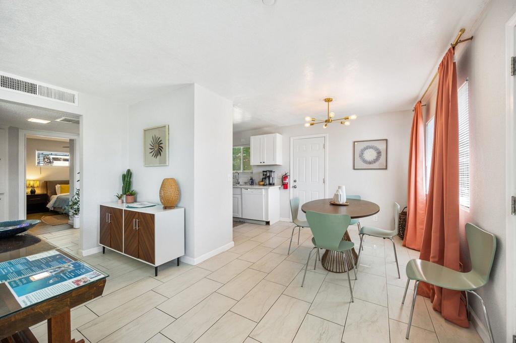 Welcome to your tranquil oasis at 13215 Deodar Avenue in Desert Hot Springs, CA. Nestled above The Spa Zone, this charming remodeled mid century home features 2 bedrooms and 1 bathroom, spanning 968 square feet of well-designed living space on a generous 0.17-acre lot. Offered Turnkey furnished!As you step inside, you'll be greeted by a tastefully updated kitchen with newer cabinetry . The modern aesthetic continues contemporary laminate flooring and enhanced lighting, creating an inviting atmosphere. Recently painted walls, updated baseboards, and new panel doors contribute to a polished and contemporary look.The bathroom has been completely remodeled with a new shower/tub combination, elegant tile work, and an updated vanity and fixtures. Enjoy year-round comfort with a newly installed central heating and air conditioning system. Updated dual pane windows and sliders throughout with an attached 2 car garage and laundry area.The backyard invites you to relax under a covered patio, where you can soak in partial views of the San Gorgonio Mountains, dine al fresco and enjoy your private hot tub. The front yard is beautifully landscaped with desert-friendly plants and a welcoming walkway that enhances the home's curb appeal.Nestled in a peaceful neighborhood, this property provides easy access to local shopping and dining options, as well as the vibrant attractions of the Coachella Valley. Its convenient proximity to Palm Springs Airport adds to the appeal of this serene retreat. For more information or to schedule a private tour, please contact your local real estate expert. Home is an active short term rental, appointment required, do not disturb occupants. Thank you! Now available for long term lease, also for sale. Landlord maintains Gardener, tenant to pay all utilities and maintain hot tub