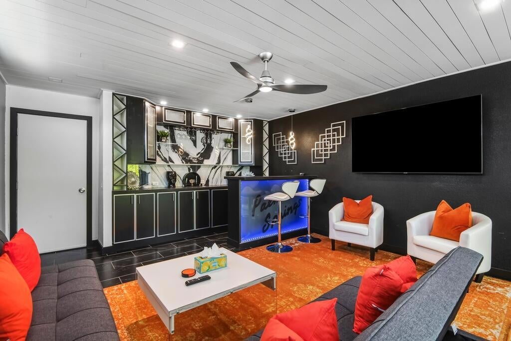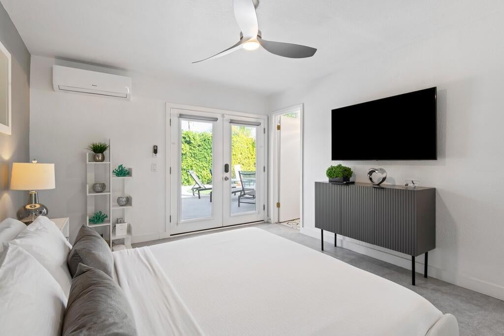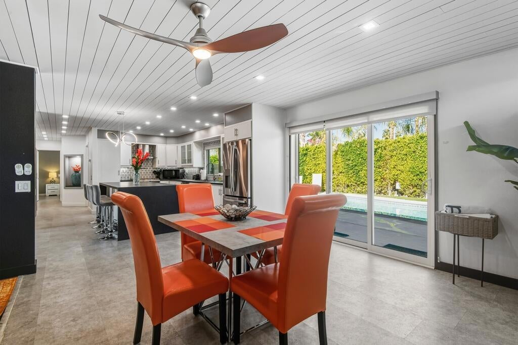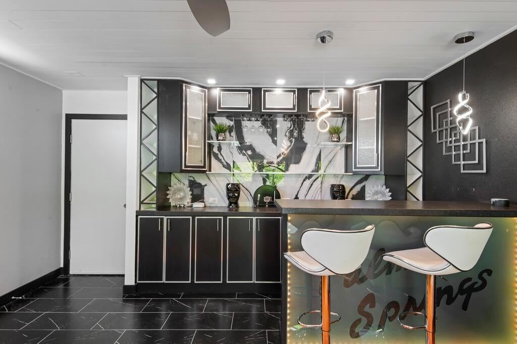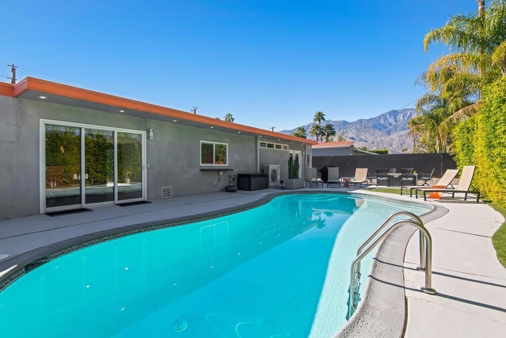Discover your dream home in this beautifully renovated, 3-bedroom, 2-bath pool oasis. Featuring exceptional curb appeal, mountain views, an attached 2-car garage, and a spacious semi-circle driveway, this house is ready to welcome you. Step inside through double glass doors into a formal entryway with built-in shelving, leading to a modern kitchen with a central island, bar seating, custom tile backsplash, white cabinetry, and stainless steel appliances. The open floor plan seamlessly connects the kitchen to a dining area with access to the backyard and a large living room, complete with an entertainer's built-in dry bar featuring Palm Springs signage. Retreat to the luxurious primary suite at the end of the hall, offering double glass doors to the backyard and a spa-like ensuite with dual sinks, custom tile floors, 3D tile walls, and a walk-in shower. The additional two bedrooms and a full hall bathroom, all boasting custom tile finishes, provide comfort and style. The entertainer's backyard is your personal paradise, with a deep in-ground heated pool (newer pool pump with Smart auto-fill technology), a custom built-in firepit, a heavy-duty aluminum frame pergola with a private screen for relaxation, a combination of concrete and turf, and breathtaking mountain views. Conveniently located near shopping, dining, parks, golf, and all the best of Palm Springs, this masterpiece is waiting for you to tour and make it your own. Don't miss the chance to claim this stunning home!