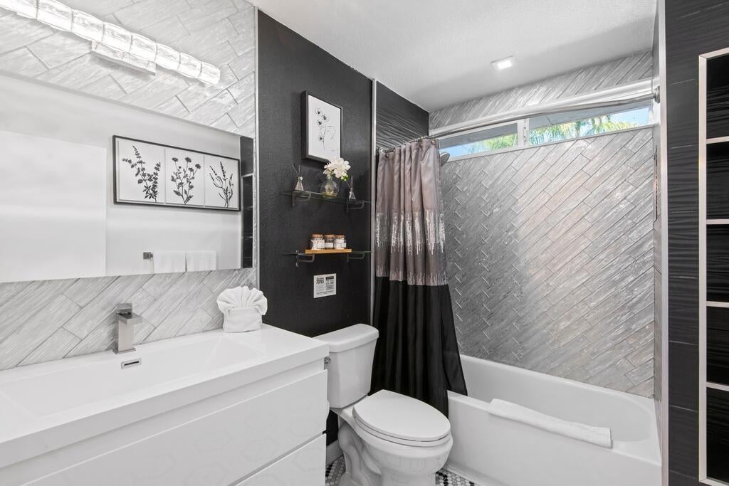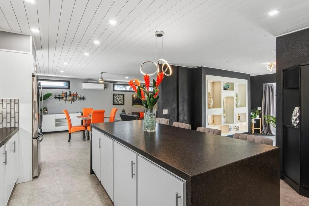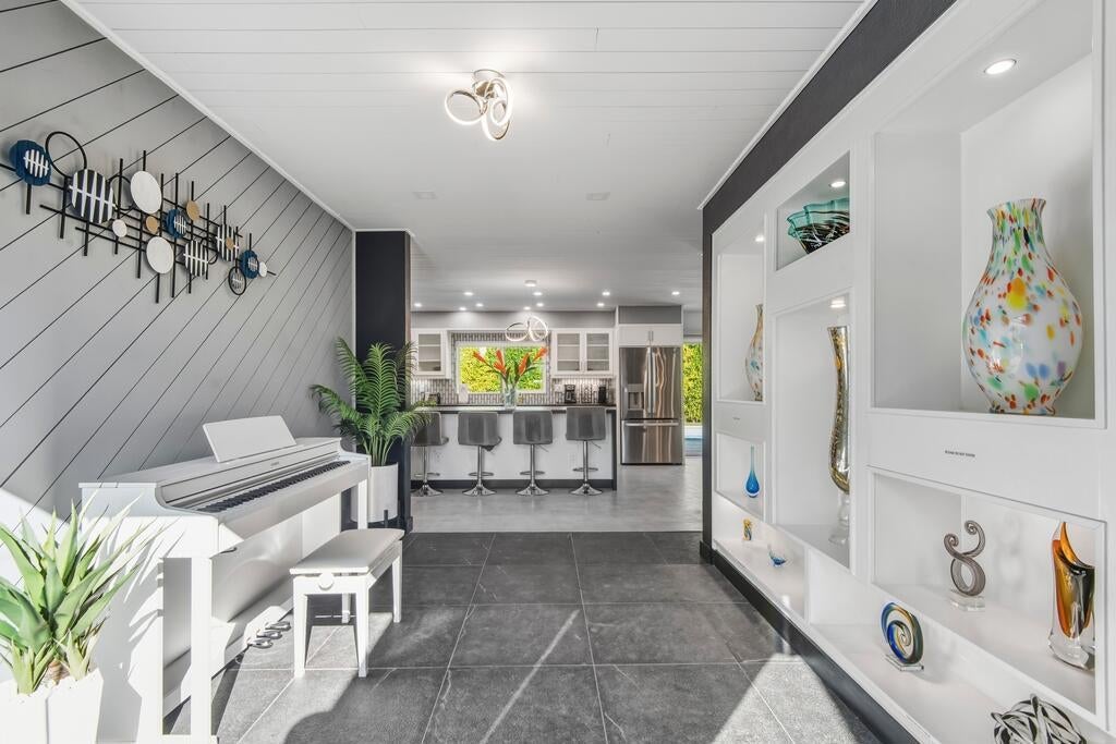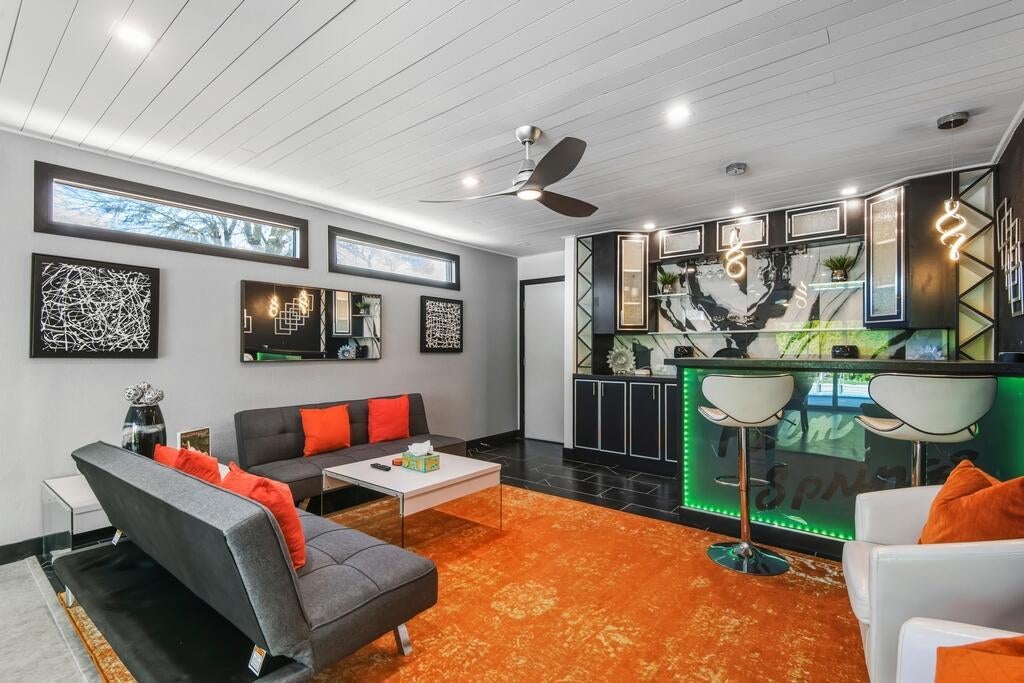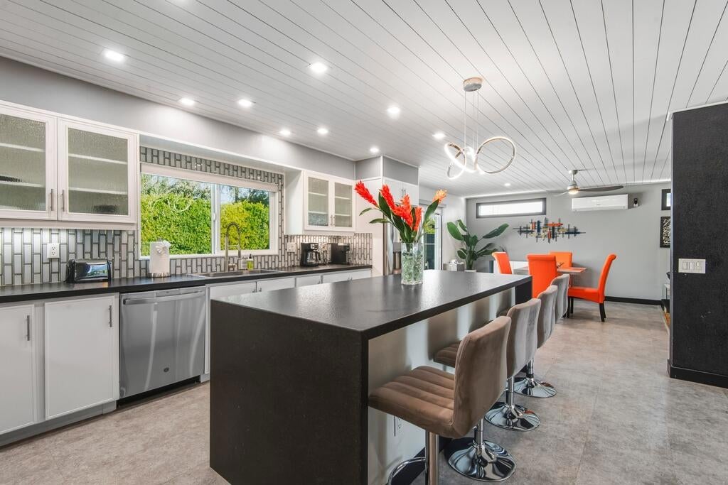 Discover your dream home in this beautifully renovated, 3-bedroom, 2-bath pool oasis. Featuring exceptional curb appeal, mountain views, an attached 2-car garage, and a spacious semi-circle driveway, this house is ready to welcome you. Step inside through double glass doors into a formal entryway with built-in shelving, leading to a modern kitchen with a central island, bar seating, custom tile backsplash, white cabinetry, and stainless steel appliances. The open floor plan seamlessly connects the kitchen to a dining area with access to the backyard and a large living room, complete with an entertainer's built-in dry bar featuring Palm Springs signage. Retreat to the luxurious primary suite at the end of the hall, offering double glass doors to the backyard and a spa-like ensuite with dual sinks, custom tile floors, 3D tile walls, and a walk-in shower. The additional two bedrooms and a full hall bathroom, all boasting custom tile finishes, provide comfort and style. The entertainer's backyard is your personal paradise, with a deep in-ground heated pool (newer pool pump with Smart auto-fill technology), a custom built-in firepit, a heavy-duty aluminum frame pergola with a private screen for relaxation, a combination of concrete and turf, and breathtaking mountain views. Conveniently located near shopping, dining, parks, golf, and all the best of Palm Springs, this masterpiece is waiting for you to tour and make it your own. Don't miss the chance to claim this stunning home!