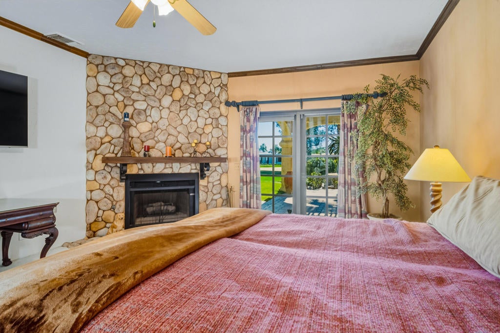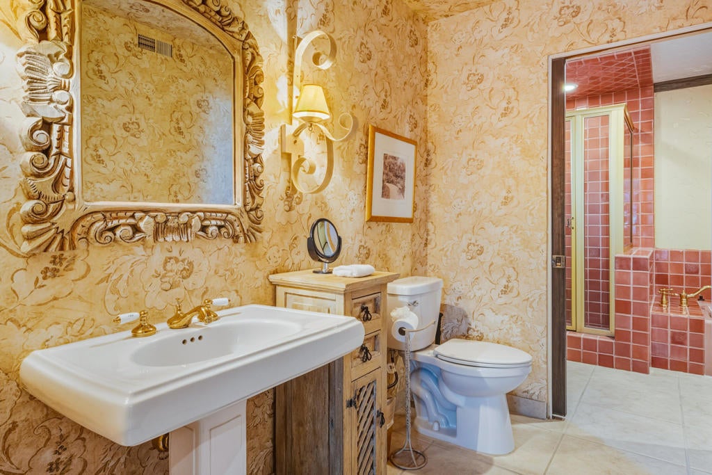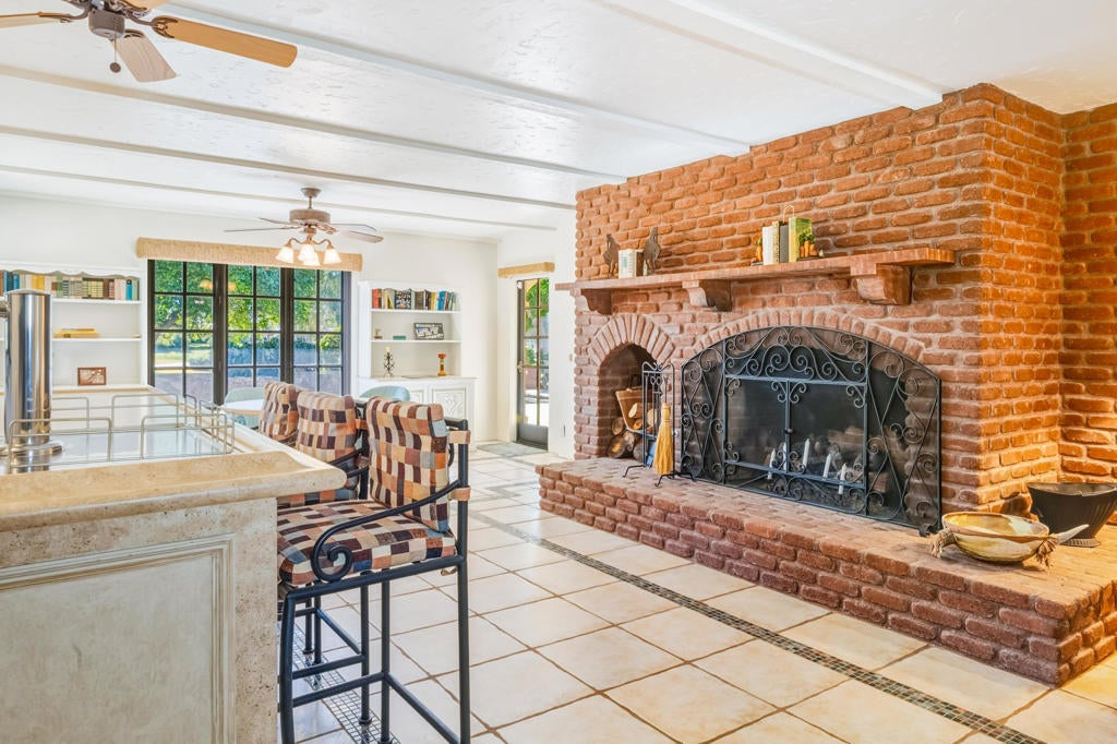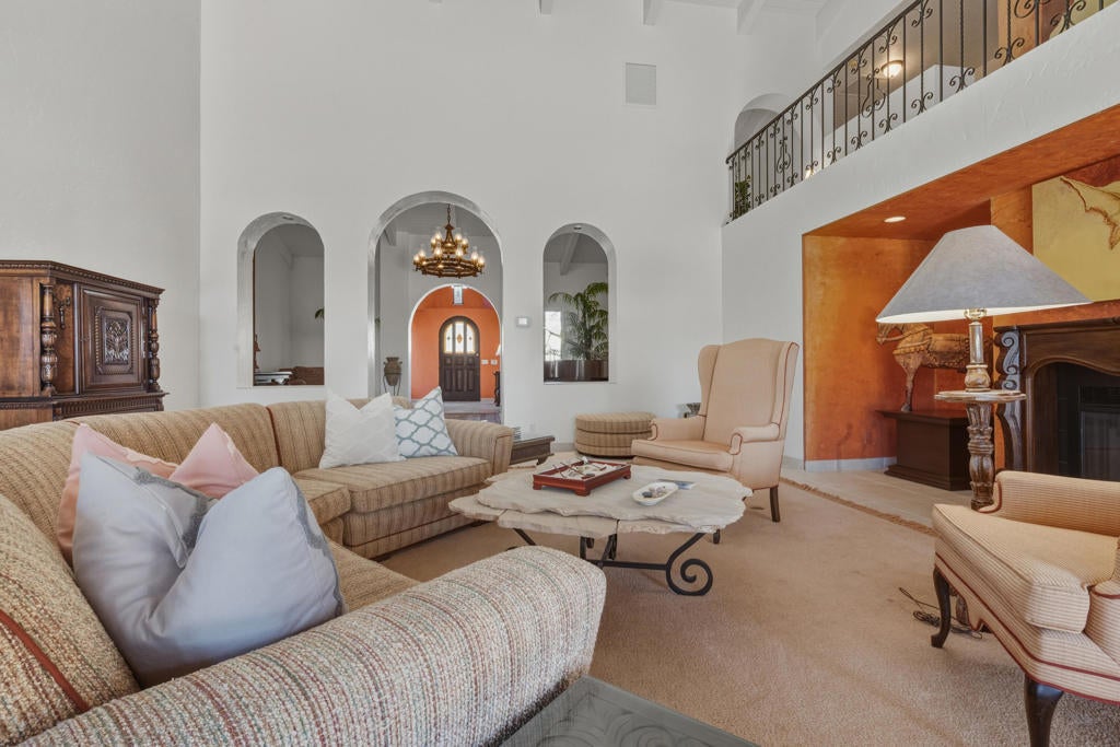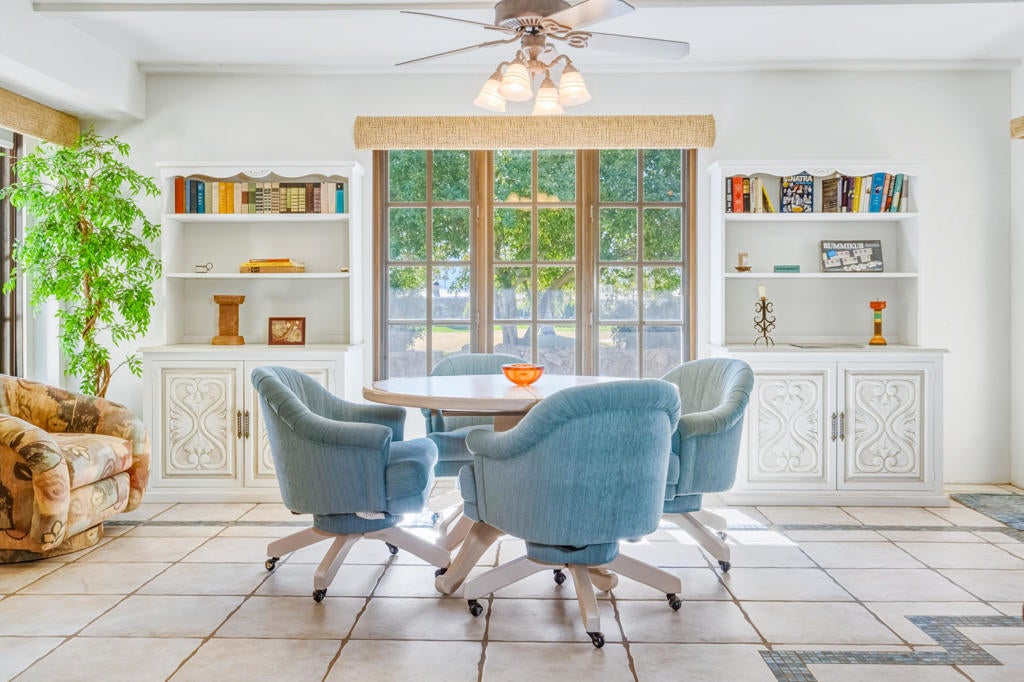 FIXER OPPORTUNITY! Behind the gates of Muirfield Estates at Mission Hills Country Club, where manicured fairways meet dramatic desert skies, this remarkable estate unfolds as a private sanctuary designed for gracious living and unforgettable moments. Set on an expansive 17,424-square-foot lot, the residence spans 5,834 square feet, offering four bedrooms and four-and-a-half baths in a setting that balances elegance, warmth, and quiet grandeur. The heart of the home opens effortlessly to the outdoors, where the southwest-facing backyard captures breathtaking mountain silhouettes and sweeping golf course views. Here, a private pool gazes toward the fairway, artfully positioned to preserve intimacy while embracing the beauty beyond. Days drift by poolside under the sun, and evenings glow with soft desert light as the mountains blush at sunset. Inside, soaring ceilings and carefully placed fireplaces create a sense of timeless luxury. The living room, with its dramatic vaulted ceiling and fireplace, feels both expansive and welcoming--ideal for intimate evenings or lively gatherings. The formal dining room, generously scaled for a ten-seat table, sets the stage for long dinners filled with conversation and candlelight. Morning coffee becomes a ritual in the breakfast room, where golf course views frame the start of each day. A richly appointed den with built-in bar and brick fireplace invites relaxed evenings, storytelling, and cocktails shared among friends. The spacious kitchen, designed to serve both everyday life and entertaining with ease, anchors the home with warmth and functionality. The primary suite is a retreat unto itself--an intimate escape featuring a fireplace, a private sitting area, and a luxurious bath that includes a separate spa room, offering a true sense of renewal and indulgence. Upstairs, a second level with two ensuite bedrooms provides privacy and comfort for guests or family, each space thoughtfully designed to feel serene and self-contained. Completing the estate is a four-car garage, generous proportions throughout, and an unmistakable sense of arrival. This is more than a residence--it is a place where mornings are unhurried, evenings are savored, and life unfolds against the timeless beauty of Mission Hills. A rare opportunity to experience privacy, space, and romance in one of the desert's most coveted enclaves.