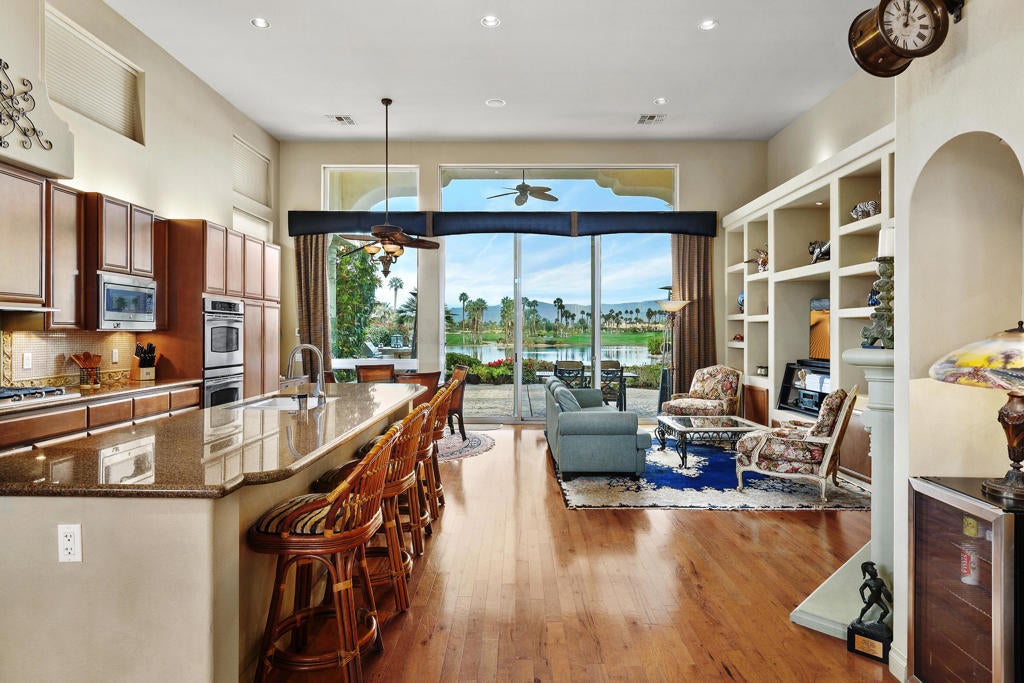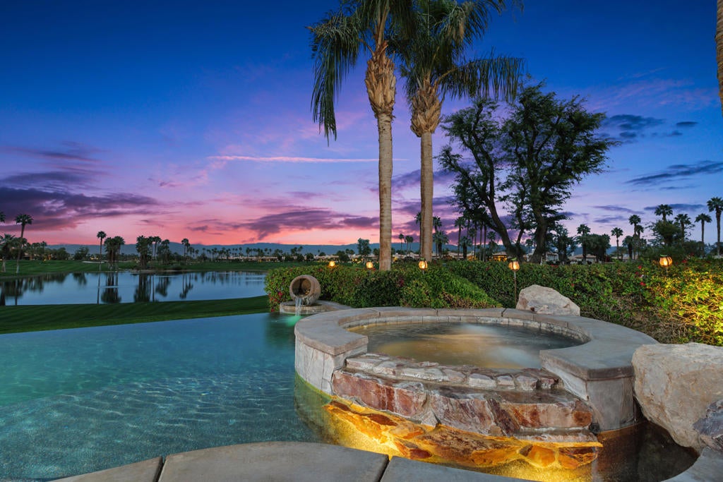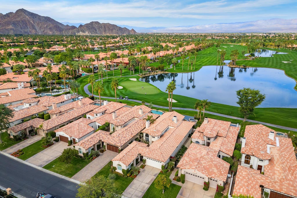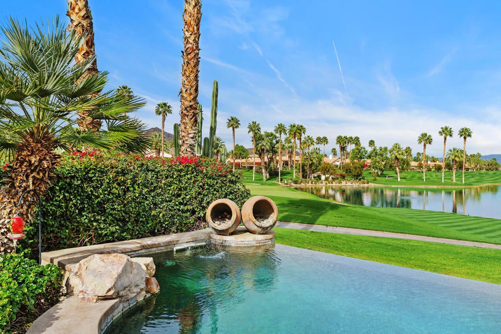 Perfectly positioned on one of the most coveted view lots in Rancho La Quinta Country Club, this exceptional Encanto II residence is situated to enjoy uninterrupted views of the golf course, lake, and surrounding mountains. Designed for seamless indoor-outdoor living, a dramatic infinity-edge pool appears to spill directly into the golf course landscape, creating a resort-style experience that feels both tranquil and expansive. A tanning shelf, built-in barbecue, outdoor dining area, fire pit, heaters, and thoughtfully arranged seating invite everything from quiet mornings overlooking the water to unforgettable evenings under the desert sky. Inside, the home is light-filled and welcoming, with soaring ceilings and a dramatic sightline that draws your eye straight through to the views beyond. The open living areas are ideal for entertaining, anchored by a warm fireplace in both the living room and family room and complemented by rich wood flooring and warm finishes throughout. The kitchen features a new gas cooktop, new dishwasher, new refrigerator, double ovens, a wine refrigerator, and generous island--perfect for casual gatherings or more formal occasions. The primary suite offers a calm retreat, complete with a spacious bath featuring dual vanities, soaking tub, and walk-in shower. Guest accommodations include a private detached casita with its own separate living space, bathroom, and kitchenette--ideal for visitors seeking comfort and independence. A gated entry courtyard features a gas fireplace and provides a private, welcoming outdoor retreat connecting the detached casita to the main residence. This home is sold furnished allowing a buyer to enjoy the home's lifestyle from day one. HOA dues provide 24-hour guard-gated security, high-speed internet, cable tv, landscape maintenance, and trash service. Also included is a sports membership offering access to the soon-to-be renovated clubhouse , tennis and pickleball courts, resort-style pools, and a state-of-the-art fitness center.With a premier location & iconic views, this is a rare opportunity to own a truly special desert retreat in one of La Quinta's most sought-after communities. This listing includes a selection of virtually staged images featuring digitally altered wall colors and contemporary furnishings, offered simply to illustrate the home's design versatility and creative potential.