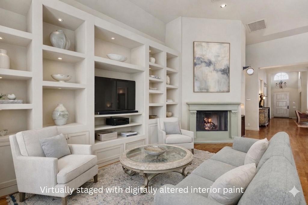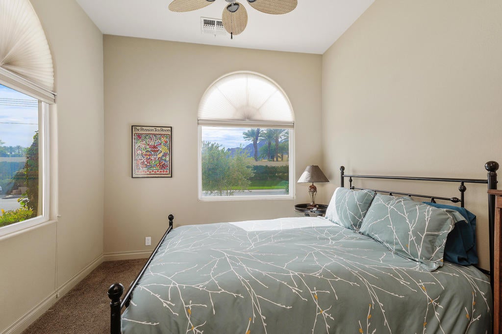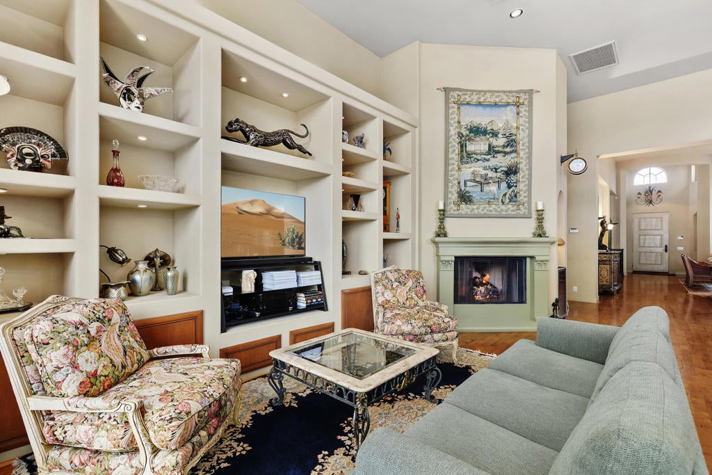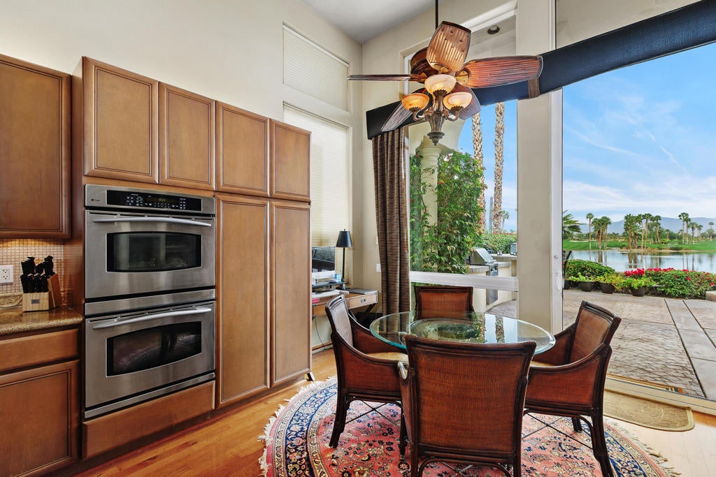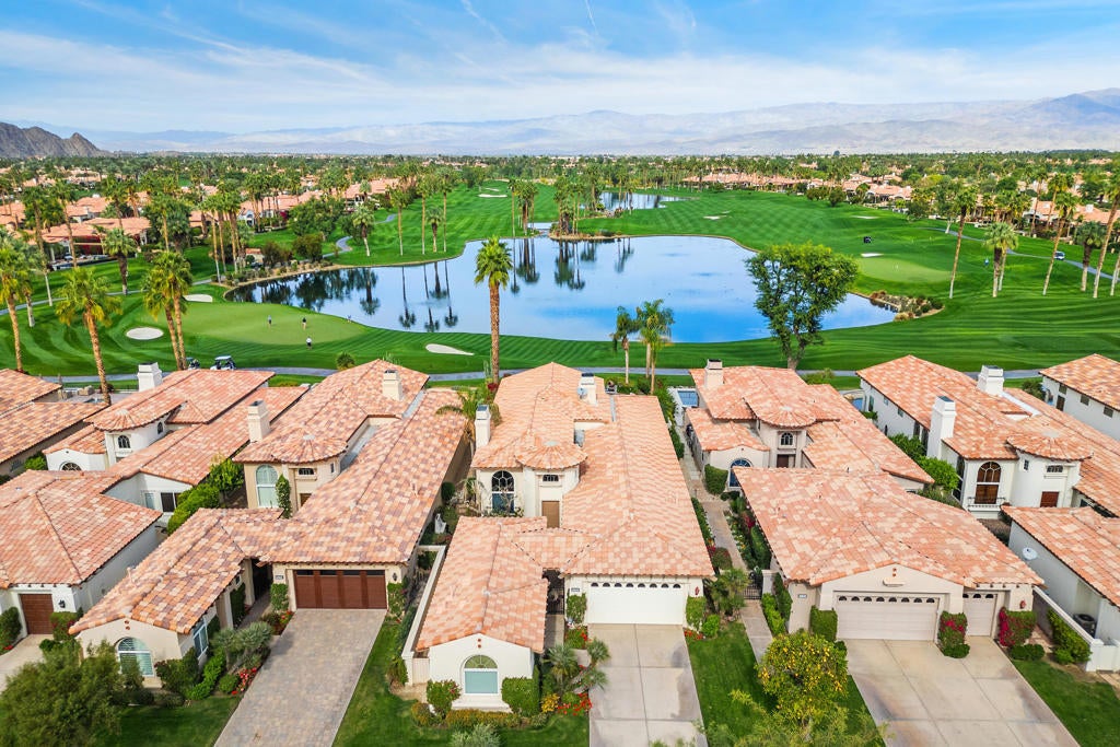 Perfectly positioned on one of the most coveted view lots in Rancho La Quinta Country Club, this exceptional Encanto II residence is situated to enjoy uninterrupted views of the golf course, lake, and surrounding mountains. Designed for seamless indoor-outdoor living, a dramatic infinity-edge pool appears to spill directly into the golf course landscape, creating a resort-style experience that feels both tranquil and expansive. A tanning shelf, built-in barbecue, outdoor dining area, fire pit, heaters, and thoughtfully arranged seating invite everything from quiet mornings overlooking the water to unforgettable evenings under the desert sky. Inside, the home is light-filled and welcoming, with soaring ceilings and a dramatic sightline that draws your eye straight through to the views beyond. The open living areas are ideal for entertaining, anchored by a warm fireplace in both the living room and family room and complemented by rich wood flooring and warm finishes throughout. The kitchen features a new gas cooktop, new dishwasher, new refrigerator, double ovens, a wine refrigerator, and generous island--perfect for casual gatherings or more formal occasions. The primary suite offers a calm retreat, complete with a spacious bath featuring dual vanities, soaking tub, and walk-in shower. Guest accommodations include a private detached casita with its own separate living space, bathroom, and kitchenette--ideal for visitors seeking comfort and independence. A gated entry courtyard features a gas fireplace and provides a private, welcoming outdoor retreat connecting the detached casita to the main residence. This home is sold furnished allowing a buyer to enjoy the home's lifestyle from day one. HOA dues provide 24-hour guard-gated security, high-speed internet, cable tv, landscape maintenance, and trash service. Also included is a sports membership offering access to the soon-to-be renovated clubhouse , tennis and pickleball courts, resort-style pools, and a state-of-the-art fitness center.With a premier location & iconic views, this is a rare opportunity to own a truly special desert retreat in one of La Quinta's most sought-after communities. This listing includes a selection of virtually staged images featuring digitally altered wall colors and contemporary furnishings, offered simply to illustrate the home's design versatility and creative potential.