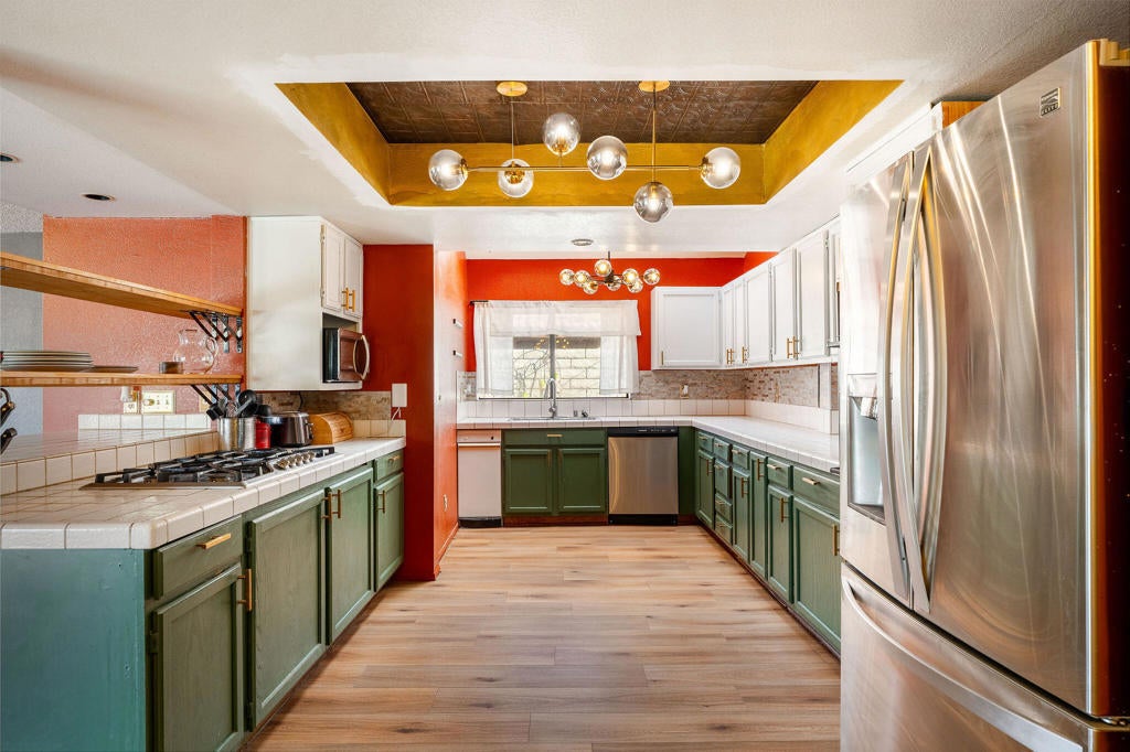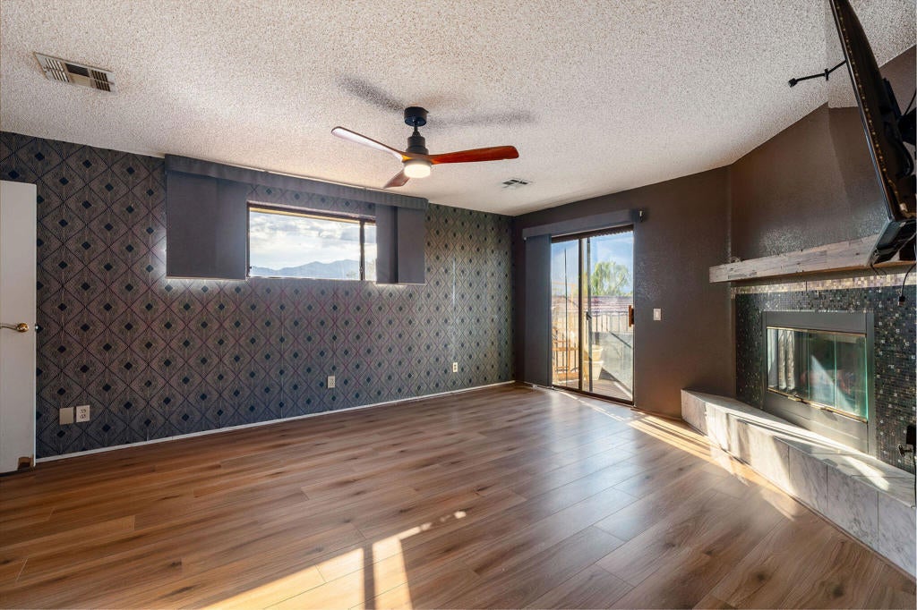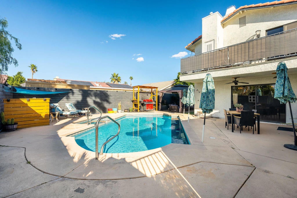 Resort-style living meets smart upgrades in this beautifully improved Panorama home in Cathedral City. With 4 bedrooms, 4 baths, and 2,388 sq ft, this flexible floor plan offers dual primary suites (one upstairs with private balcony and mountain views, one on the main level) plus two additional bedrooms, making it ideal for multi-generational living, guests, or work-from-home needs.The backyard is a true entertainer's retreat featuring a fully tiled pool and spa, all new pool heater, pump, and filter, and a custom-built gazebo complete with gas grill, lighting, and a gas firepit set on a stone patio. A dedicated dog run with doggy door adds convenience for pet lovers, while mature lime, lemon, tangerine, and prickly pear trees enhance the desert landscape.Inside, the home has been thoughtfully refreshed with brand new luxury vinyl laminate flooring throughout (except bathrooms), freshly painted kitchen cabinets with new hardware, updated light fixtures and ceiling fans in every room, and dual Nest thermostats for zoned comfort. The kitchen offers generous prep space and storage, skylights for natural light, a breakfast bar, and a brand new dishwasher, all opening to the family and dining areas with multiple sliders connecting indoor and outdoor living.Major system upgrades provide peace of mind: solar system owned with newer inverters, one furnace is newer, one A/C system was replaced approximately 3 years ago while the other is regularly serviced, plus a newer water heater, new water softener, and new garage door and opener. A brand new washer and dryer and four mounted flat-screen TVs are included.Located in the desirable Panorama neighborhood with no HOA, close to parks, shopping, and Palm Springs, this move-in ready home combines energy efficiency, comfort, and true indoor-outdoor desert living.