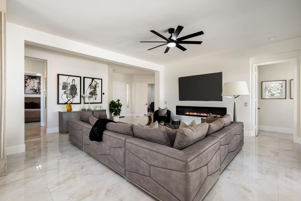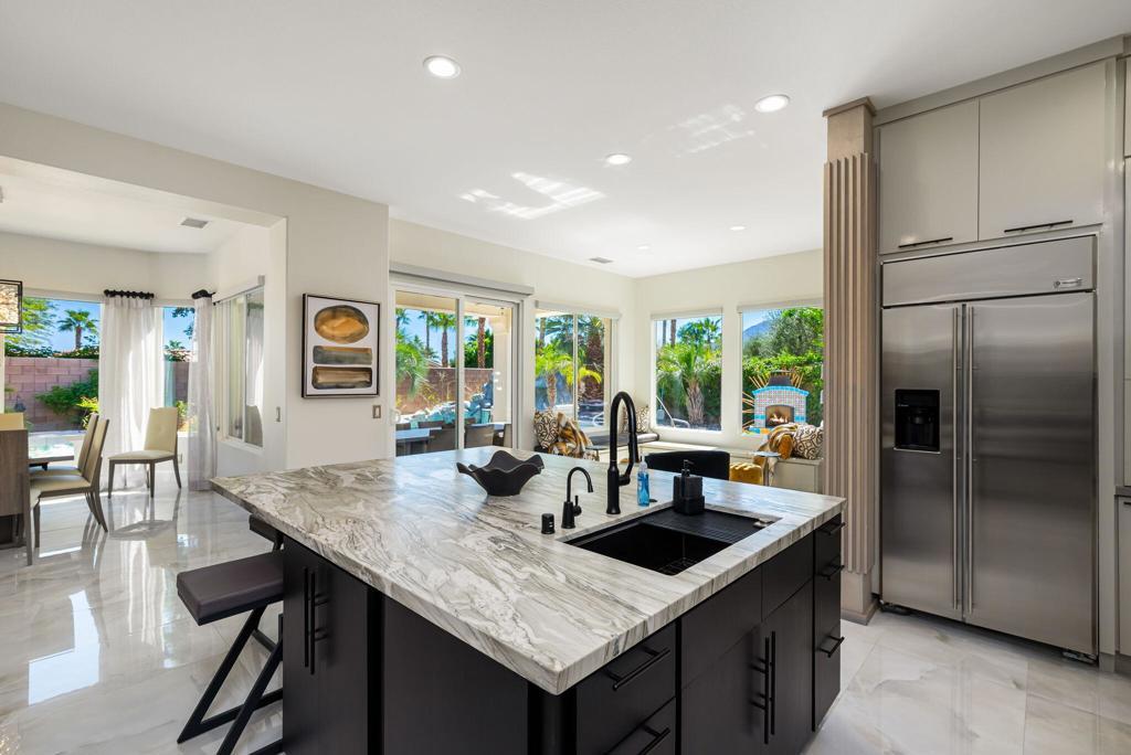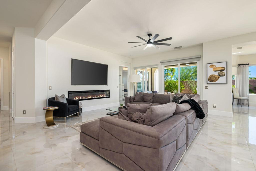 Experience the pinnacle of desert living in this rare Tamarisk model with detached casita, ideally situated on a private cul-de-sac within Trilogy La Quinta. Set on an expansive .35-acre homesite, this exceptional residence offers a beautifully landscaped front lawn, an inviting courtyard with ornate entry gate, three covered patios, an outdoor fireplace, and a resort-style pool and spa highlighted by a dramatic stone waterfall. Encompassing approximately 2,726 sq. ft. of refined single-level living, the home showcases 4 bedrooms, 4 bathrooms, a formal dining room with bay window, and a spacious great room with custom media niche. Recent upgrades include fresh interior and exterior paint (including the casita), new porcelain tile flooring with 7-inch baseboards, shutters, shades, and a custom-designed TV and electric fireplace wall. The gourmet kitchen is a true showpiece, boasting all-new cabinetry, quartz Gucci stone island, stainless steel sink, Monogram cooktop, built-in double ovens, designer accent walls and wall sconces, and a charming breakfast nook with custom bench seating and dry bar. The primary suite impresses with a tray ceiling, bay-window sitting area, walk-in closet, updated shutters, and a luxurious bathroom with separate shower. Additional enhancements include new toilets and faucets throughout, upgraded ceiling fans, custom built-ins, and a split 3-car garage. A rare offering of style, space, and upgrades, this home is not to be missed.