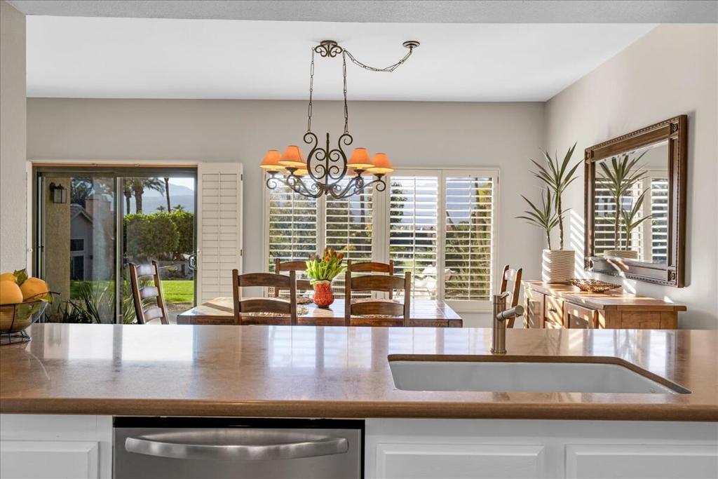 An exceptional find in the heart of Palm Desert. RARE unobstructed view home--designed with a unique blend of modern elegance and desert luxury. Experience elevated, panoramic greenbelt and mountain views. Property is infused with natural light. High ceilings accentuate the airy open feel--resulting in a floorplan that works as well for group entertaining as intimate get togethers. Private courtyard entry is perfect for outdoor dining--window pass-thru to interior wet bar with beverage fridge, extensive cabinetry & countertop space--even a built-in BBQ station! Area enhanced by lush, yet low-maintenance plantings. Welcoming double door entry. Bricked atrium with slider access lends an extra indoor/outdoor feeling. High ceiling soars over large living room and dining area. Focal point fireplace with unique wood mantle is flanked by walls of glass that frame stunning greenbelt views and invite to outdoor seating areas. Spacious, gourmet eat-in kitchen with bay window boasts stainless appliances & extended bar top seating. Tons of cabinetry, storage and prep space! Primary suite with spa-like light-filled bath. Updated bathrooms offer newer counter tops, modern sinks, hardware and custom tile showers. Interior laundry closet. Countless upgrades enhance the living experience. Recessed lighting, Plantation-style shutters, oversized 'on the diagonal' neutral tile flooring & carpet in bedrooms. Both patios feature automatic shade awnings. Newer hot water tank and HVAC system. Attached 2-car garage. Location of home is ideal--near a community pool and spa! Be a part of Silver Sands Racquet Club--an active community of 256 condos surrounded by beautiful landscape, offset by the San Jacinto Mountains. A vast array of resident activities available including 15 community pools/spas, lit tennis & pickleball courts. Clubhouse w/fitness center. HOA includes gated entry, cable, internet, trash, exterior maintenance & roof coverage. Truly move-in ready. Designer furnishing package available for separate negotiation. Stop searching and START living!