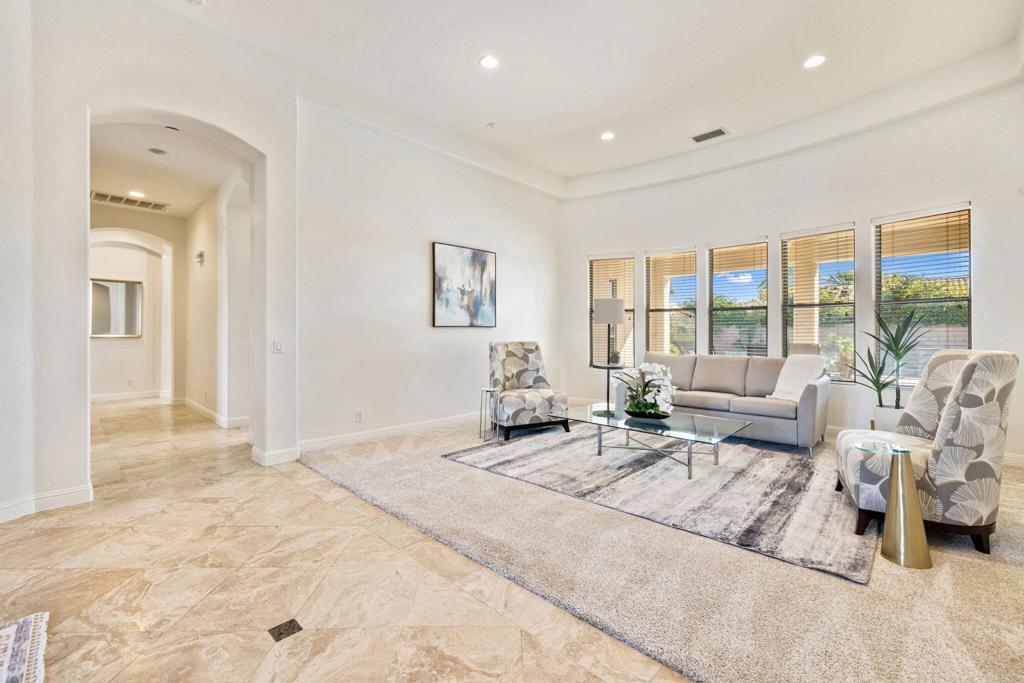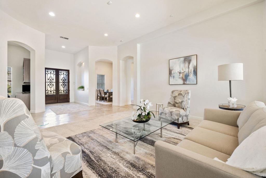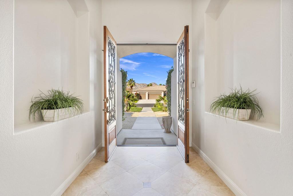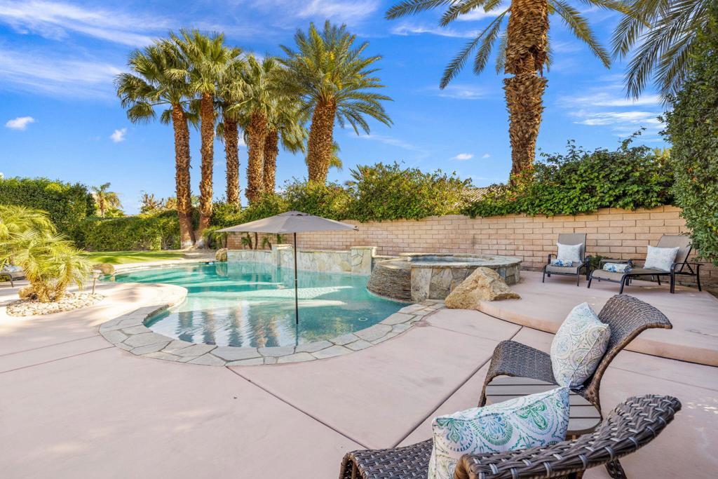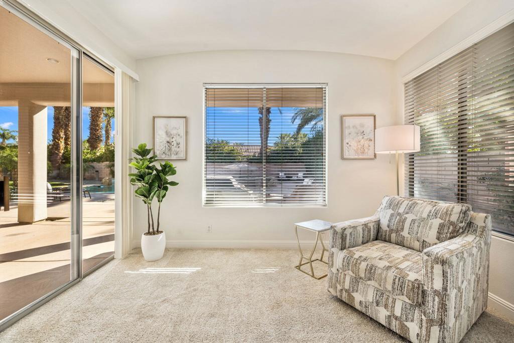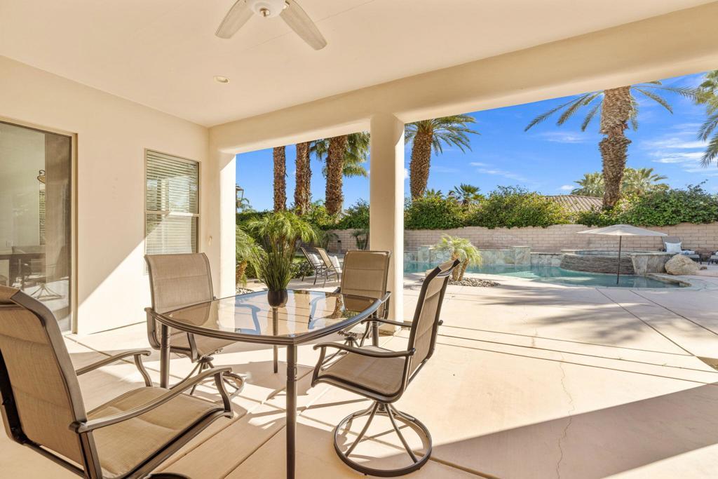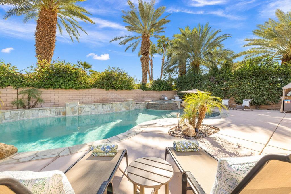 Welcome to Talante Retreat, a luxury seasonal or long-term rental home in the gated community of Talante in La Quinta! Spacious and beautifully appointed, this private desert retreat offers approximately 3,640 square feet on a single level with 4 bedrooms, each with its own en suite bathroom and walk-in closet, plus a dedicated den/office with custom built-in cabinetry and a formal dining room. Ideally located just minutes from the Empire Polo Grounds, Indian Wells Tennis Garden, world-class golf courses, shopping, dining, and entertainment, this home places you in the heart of La Quinta while still offering a peaceful, private sanctuary.Enter through the grand wrought-iron double doors to an elegant interior featuring travertine flooring, coffered ceilings, and expansive living areas designed for both entertaining and relaxing. The spacious layout offers ideal separation and privacy with a highly sought-after split floorplan, creating a comfortable retreat for family and guests alike. The primary suite serves as its own private haven, complete with a sunroom perfect for morning coffee, reading, or unwinding at the end of the day.The generous living spaces are perfect for gathering with friends or enjoying quiet time at home. The formal dining room anchors the main living space, while the thoughtfully designed layout flows seamlessly throughout the home.Step outside to your own private desert oasis set on a spacious cul-de-sac lot. The backyard features a newly constructed pool surrounded by lush landscaping, creating a tranquil space to relax, soak up the sun, and enjoy the La Quinta lifestyle year-round.Additional highlights include a three-car garage, low HOA dues, and fresh interior paint throughout. Offered furnished or unfurnished and move-in ready, this exceptional Talante home delivers the perfect blend of luxury, comfort, and privacy in one of La Quinta's most desirable gated communities. Variable seasonal rates apply.