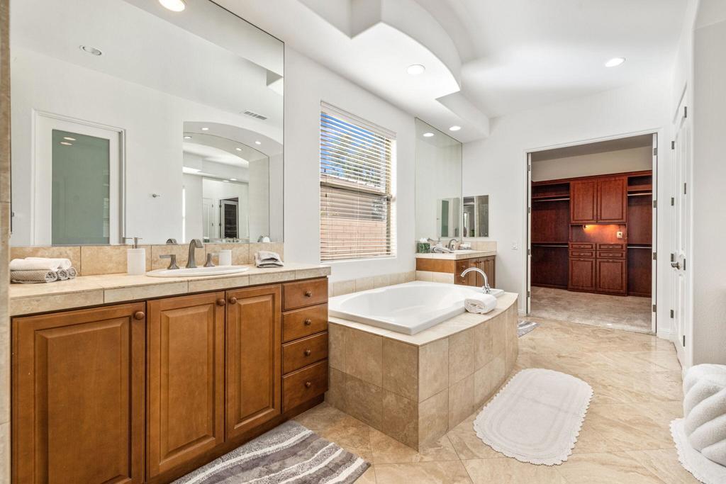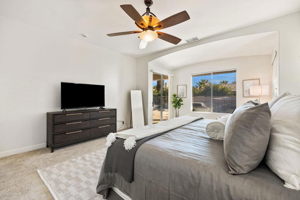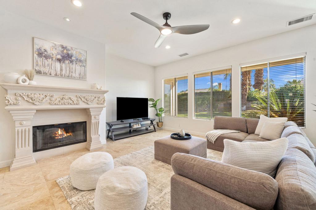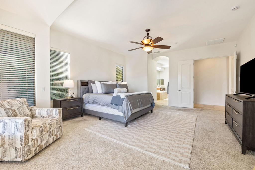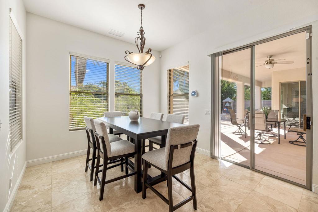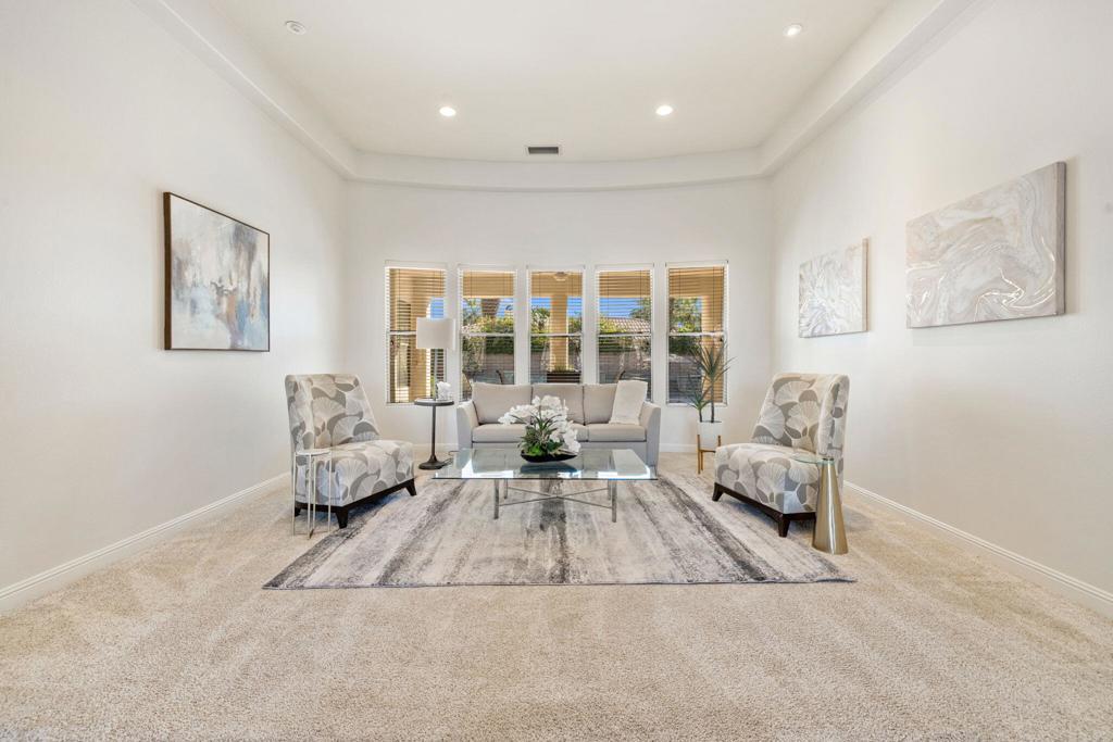 Welcome to Talante Retreat, a luxury seasonal or long-term rental home in the gated community of Talante in La Quinta! Spacious and beautifully appointed, this private desert retreat offers approximately 3,640 square feet on a single level with 4 bedrooms, each with its own en suite bathroom and walk-in closet, plus a dedicated den/office with custom built-in cabinetry and a formal dining room. Ideally located just minutes from the Empire Polo Grounds, Indian Wells Tennis Garden, world-class golf courses, shopping, dining, and entertainment, this home places you in the heart of La Quinta while still offering a peaceful, private sanctuary.Enter through the grand wrought-iron double doors to an elegant interior featuring travertine flooring, coffered ceilings, and expansive living areas designed for both entertaining and relaxing. The spacious layout offers ideal separation and privacy with a highly sought-after split floorplan, creating a comfortable retreat for family and guests alike. The primary suite serves as its own private haven, complete with a sunroom perfect for morning coffee, reading, or unwinding at the end of the day.The generous living spaces are perfect for gathering with friends or enjoying quiet time at home. The formal dining room anchors the main living space, while the thoughtfully designed layout flows seamlessly throughout the home.Step outside to your own private desert oasis set on a spacious cul-de-sac lot. The backyard features a newly constructed pool surrounded by lush landscaping, creating a tranquil space to relax, soak up the sun, and enjoy the La Quinta lifestyle year-round.Additional highlights include a three-car garage, low HOA dues, and fresh interior paint throughout. Offered furnished or unfurnished and move-in ready, this exceptional Talante home delivers the perfect blend of luxury, comfort, and privacy in one of La Quinta's most desirable gated communities. Variable seasonal rates apply.