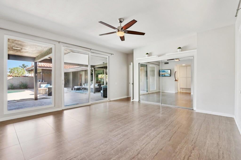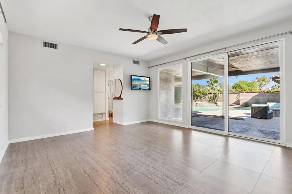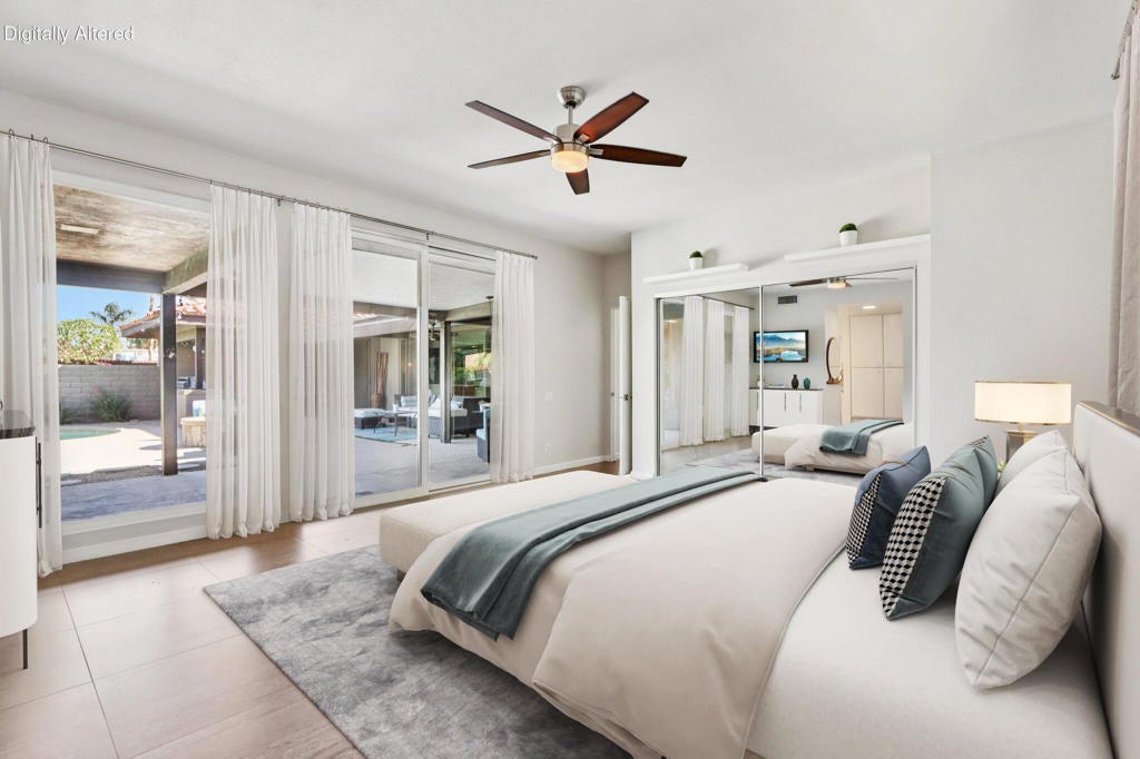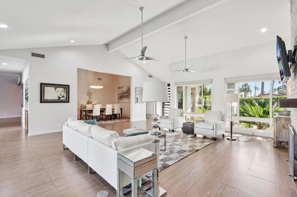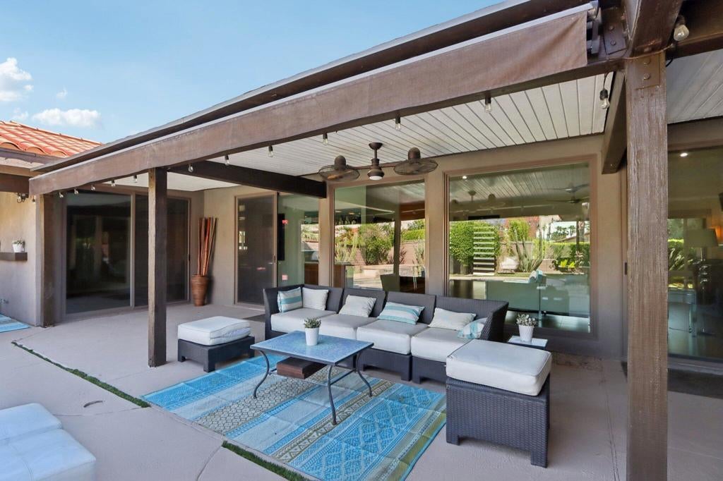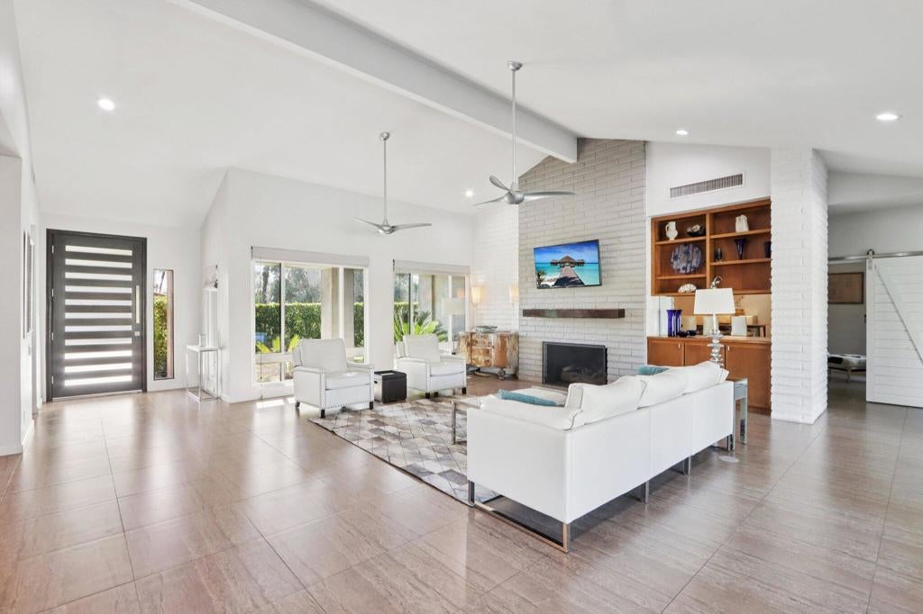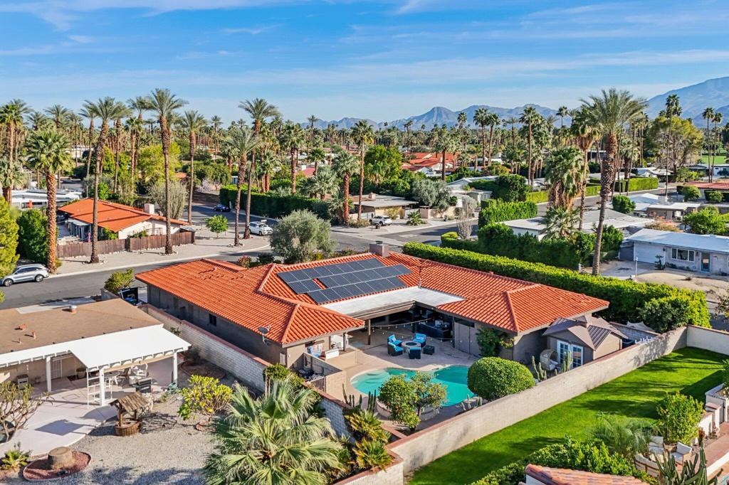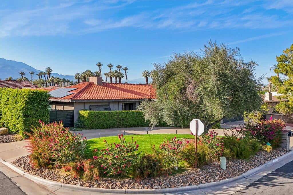 MOTIVATED SELLER INVITES YOU to experience an environment where every day feels extraordinary in this classic contemporary Rancho Mirage home. Be inspired by the dramatic living area with soaring ceilings, natural gas fireplace, and a stunning block-stone chimney--resulting in an atmosphere of limitless possibility. Recent renovations include luxurious porcelain tile throughout the entire home, all new double-pane windows and sliding doors, updated kitchen, bathrooms and more. Imagine hosting joyful celebrations in the spacious dining area, where laughter and good company fill the air. Entertain with confidence in your stylish family/TV room, complete with a sleek cocktail/wine bar--ready for unforgettable evenings. The chef's kitchen, a vision in white quartz, is more than a place to cook; it's a launchpad for creativity, connection, and culinary adventure, featuring top-tier appliances for every ambition. Embrace indoor-outdoor living as you open the doors to a generous covered loggia--perfect for movie nights, al fresco dining, or simply soaking in the serene desert air. Recharge in your private backyard oasis boasting a sparkling pool with soothing raised spa framed with magical starlit evenings by the fire pit, all of which awaits your next moment of inspiration. Let your passions thrive in the versatile 'Hoby Hut'--ideal for yoga, art, and personal growth. At day's end, retreat to the primary suite, where direct patio access and a spa-like bathroom offer relaxation and renewal. Two more bedrooms and a second updated bathroom provide comfort for loved ones and guests. With energy-efficient windows, water-saving synthetic turf, and a powerful 48-panel solar system, your future here is as sustainable as it is bright. Make every day motivating in this ideally situated, wind-protected area of Rancho Mirage's desirable 'Tamarisk Heights' hamlet which is known for well-maintained mid-century and custom homes featuring private pools, mature landscaping, and mountain views. Even though the community offers a quintessential, relaxed desert experience in a prime central location, the cherry on top with this home is the fee-simple (owned) land, and a secluded corner lot with no HOA.