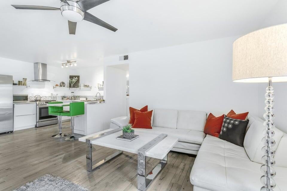 Biggest floor plan in Sunrise Palms... this recently remodeled, furnished condo features two bedrooms and two full bathrooms, solar panels, a state of the art Bosch air conditioner, and upgraded windows and sliders throughout. Walls have been removed to create an open living space with a modern kitchen, extended dining area, high ceilings, and a built-in LED fireplace. The master bedroom has a large walk-in closet that could also be used as a dressing area. The entire property was recently re-plumbed as well. There is a walled-in yard with mountain views plus, you have your own attached 1-car garage. Sunrise Palms is a gated community close to downtown Palm Springs with 8 pools and spas, tennis and sport courts, walking trails, greenbelt areas, and big mountain views!