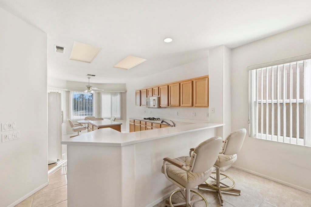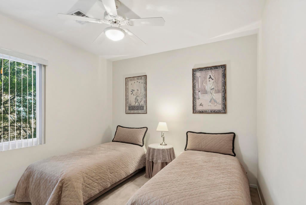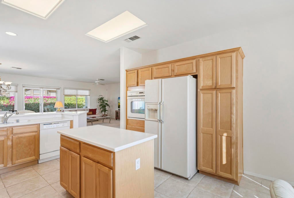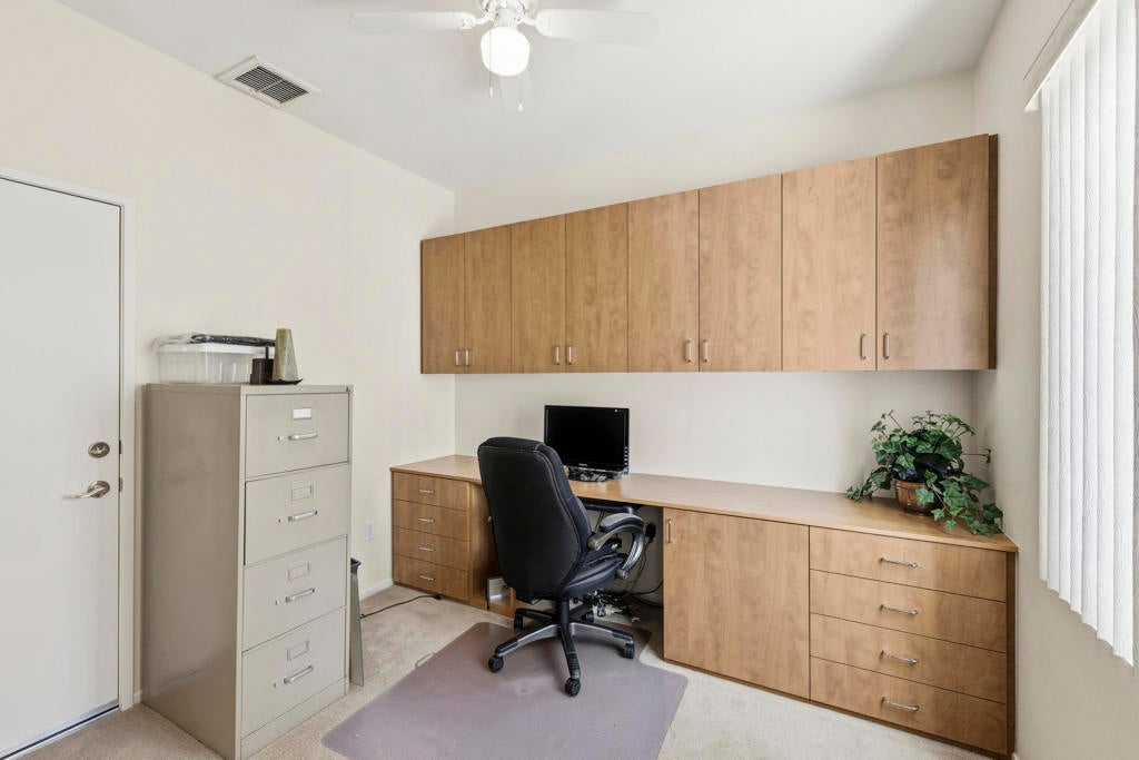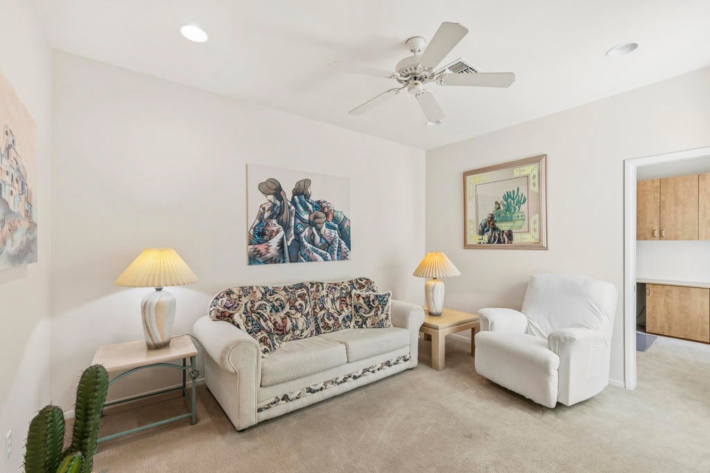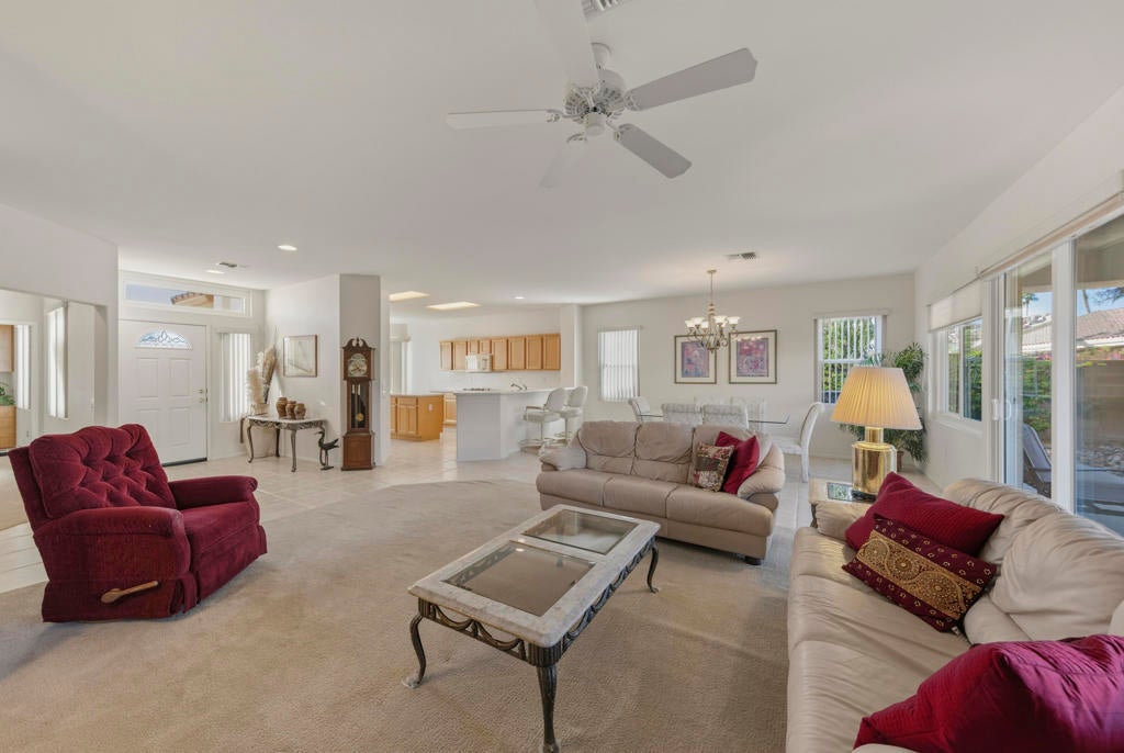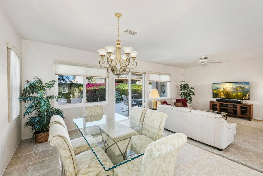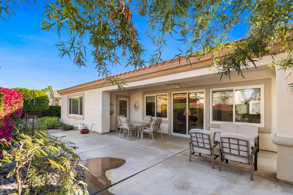 Lovingly cared for St. Croix floor plan located in the highly desirable Sun City Palm Desert, a premier 55+ gated community. This well-maintained 2 bedroom, 2 bathroom home features a den along with a separate office area with custom cabinetry. Approximately 2,102 sq. ft. of comfortable living space includes a bright, open layout ideal for everyday living and entertaining. The kitchen features a center island, gas cooktop, ample cabinetry, and opens to the family room and dining area. The spacious primary suite includes a sitting area, dual vanities, and a walk-in closet. Enjoy the covered patio and low-maintenance desert landscaping, perfect for relaxing and outdoor enjoyment. Additional highlights include a 2-car garage with golf cart bay and storage. Home is offered furnished, including a golf cart. Sun City Palm Desert residents enjoy two championship golf courses, clubhouses, fitness centers, pickleball and tennis courts, walking paths, and an abundance of clubs and activities. All information provided is deemed reliable but is not guaranteed and should be independently verified by the buyer.