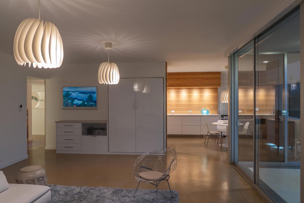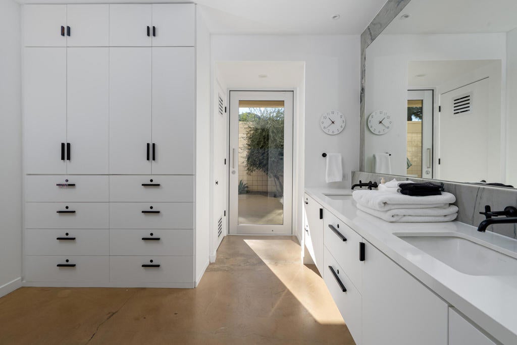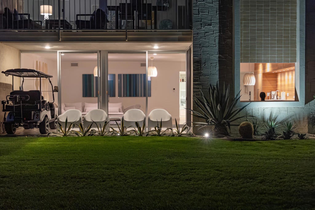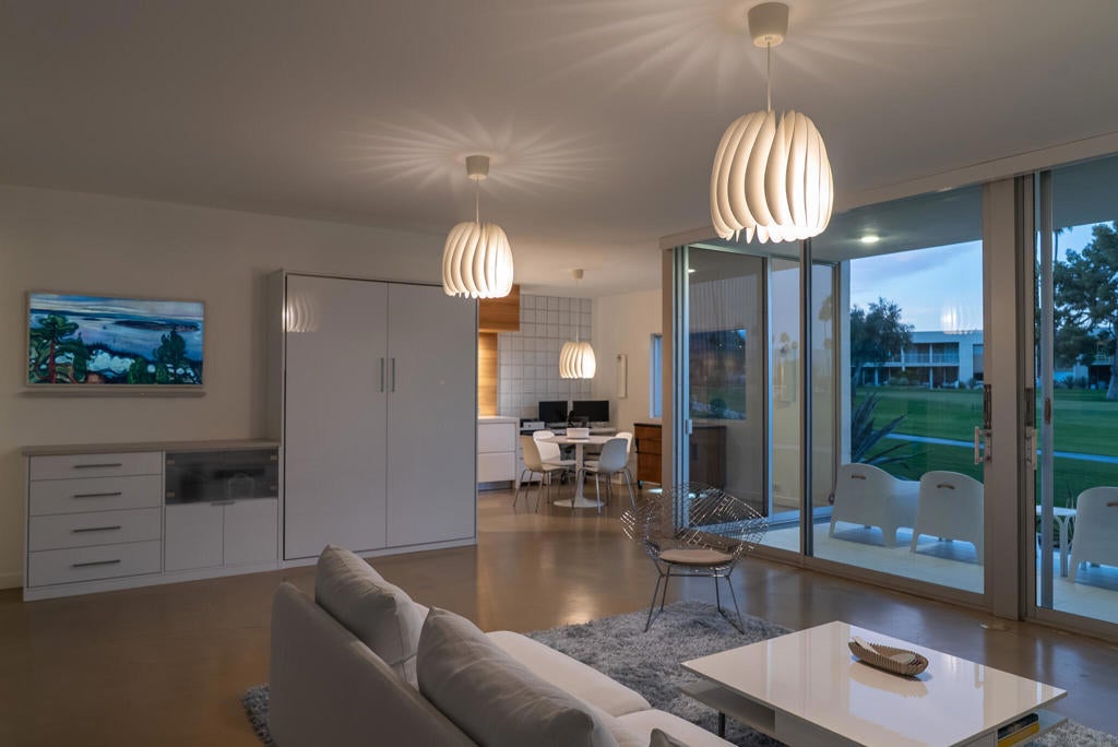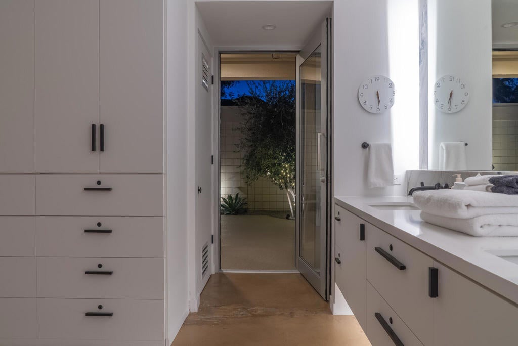 One of the most unique homes at Seven Lakes Country Club, this gorgeous 1 bedroom + 2 bathroom home was discerningly restored and renovated incorporating 21st century state-of-the-art tech into this late-century modern property. By day, enjoy Palm Springs' mountain views across the golf course and the iconic 13th green where in 1968 President Eisenhower sunk his only hole-in-one. The state-of-the-art chef's kitchen is clad with Swedish Chicory installed by a master European craftsman, Absoluto Bianca quartz waterfall countertops, illuminated cabinet drawers, a pair of 27'' Sub-Zero French door refrigerators with pinnacle wood fronts complete with four French freezer drawers, stainless Wolf dual-fuel range, KitchenAid dishwashers, integrated wine cooler, ultra-steam oven, water filtration system, espresso machine, and undercounter inductive phone charging. A beautifully reimagined and expanded Primary Bath offers direct access to the private enclosed courtyard. Ten-foot floor-to-ceiling sliders. Out your door, the largest of 7 Lakes' 15 tranquil pools is just steps away. Past the 24-hour guarded gate, 'The Gem of the Desert' offers a unique elevated lifestyle with its Ted Robinson-designed 18-hole executive golf course and the lively William Cody designed clubhouse waiting to welcome you to its formal dining room, casual cocktail lounge, and a terrace overlooking the waterfall-fountain. Welcome home!