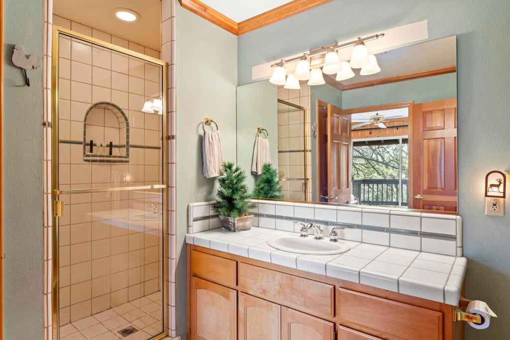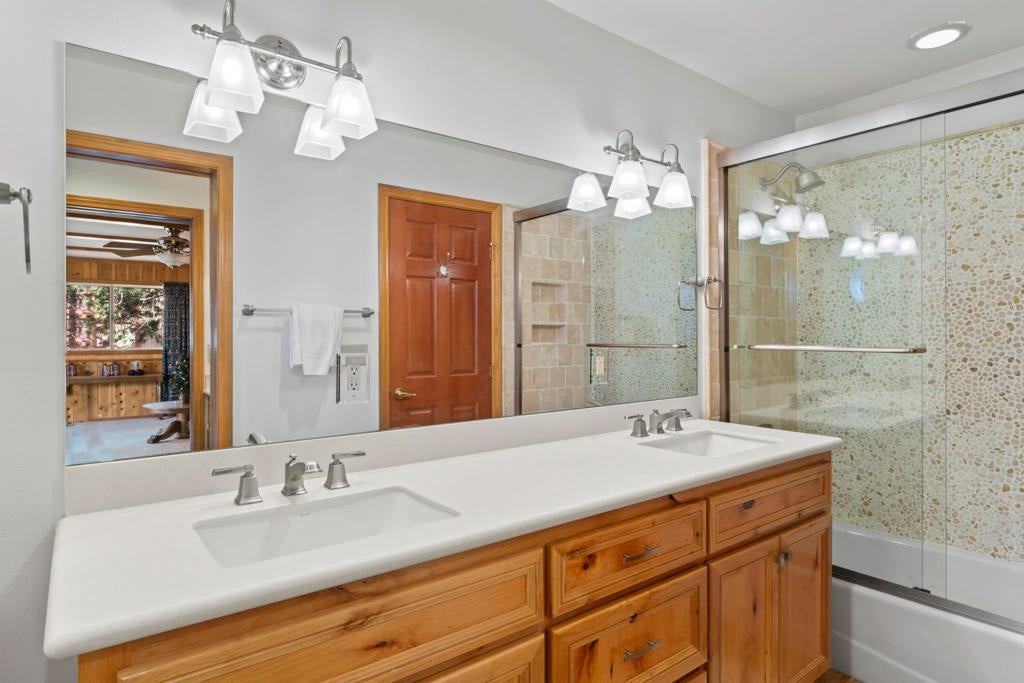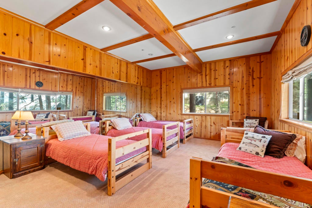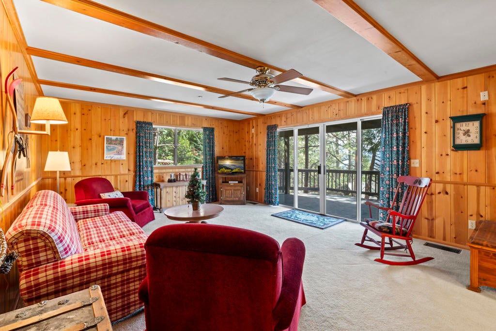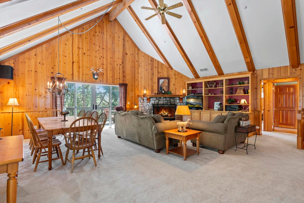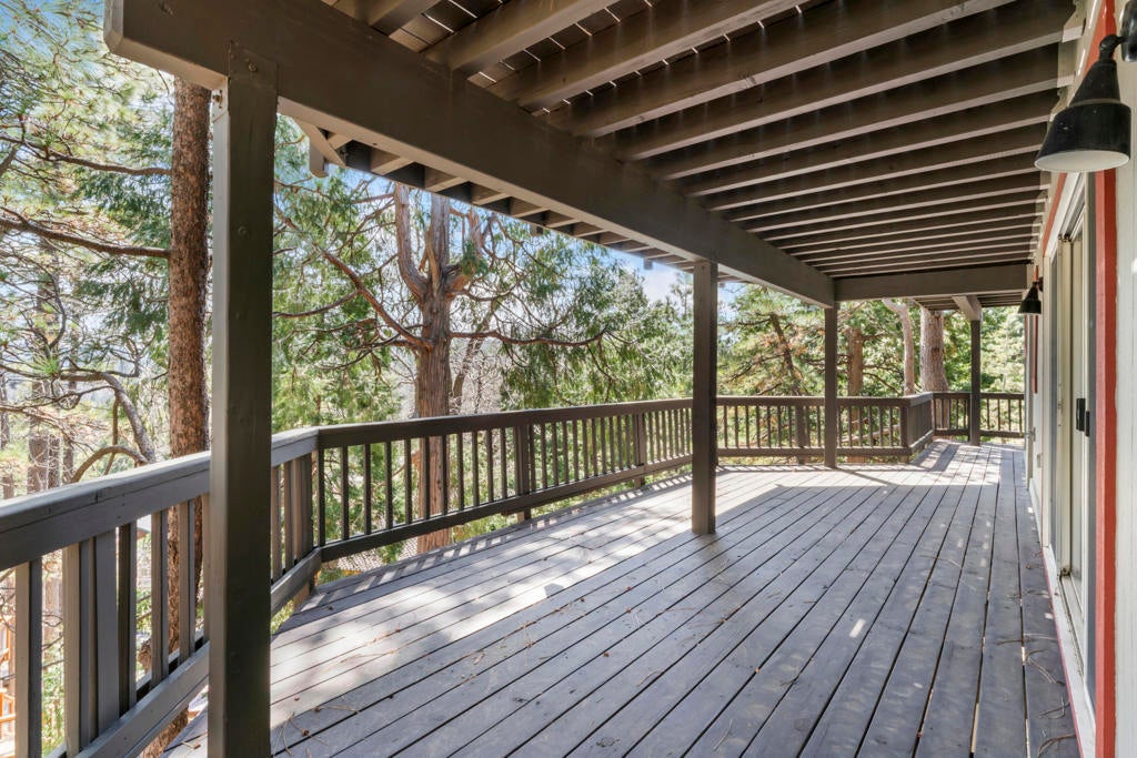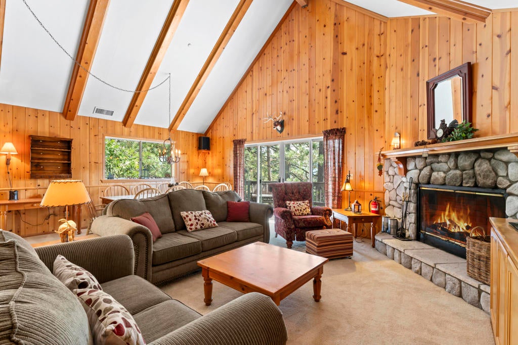 Experience mountain living in this beautifully remodeled Lake Arrowhead retreat with lake rights. Designed to blend luxury, comfort, and natural beauty, this lodge-style home offers five bedrooms--including an impressive bunk room--and four bathrooms. Offered fully furnished and move-in ready, it's an exceptional turnkey opportunity for full-time living, second-home enjoyment, or investment. Level entry provides easy year-round access with an oversized two-car garage and generous driveway, on an paved and maintained county road. Inside, soaring cathedral ceilings and an open-concept great room create a dramatic yet inviting atmosphere, anchored by a striking river rock fireplace. The chef's kitchen features granite countertops, a center island, and breakfast bar seating for five, flowing into a dining area that comfortably seats ten--ideal for entertaining and gatherings. A spacious Trex deck extends the living space outdoors for relaxing or hosting under the pines. The main level includes a well-appointed bedroom with deck access and a full bath. Downstairs, two separate family rooms offer flexible living spaces, along with a luxurious primary suite with its own fireplace and three additional bedrooms. The expansive bunk room features beds, ample storage, and a newly remodeled bath, with potential for alternative use as a gym, studio, or maybe even a separate apartment to help offset your mortgage payments. Multiple decks provide private outdoor retreats, while a fire suppression system adds peace of mind. Previously celebrity-owned and located just minutes from The Village, this home offers convenient access to dining, shopping, and year-round recreation. Only 1.5 hours from Los Angeles, Newport Beach, or Palm Springs--this is a rare opportunity to own a refined mountain getaway in the heart of Lake Arrowhead.