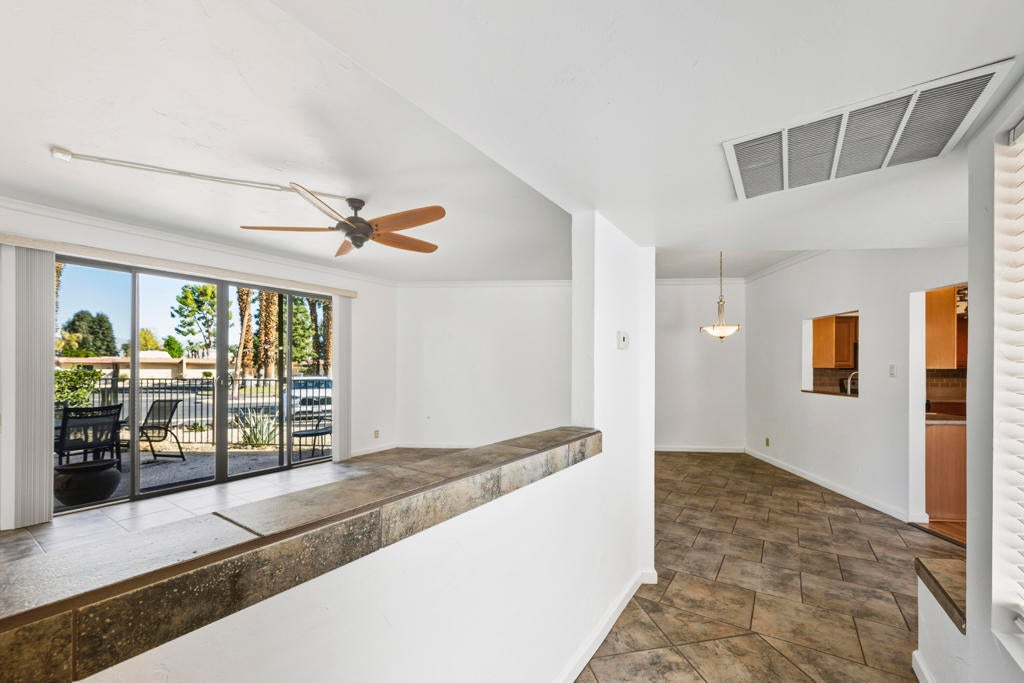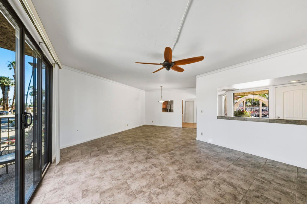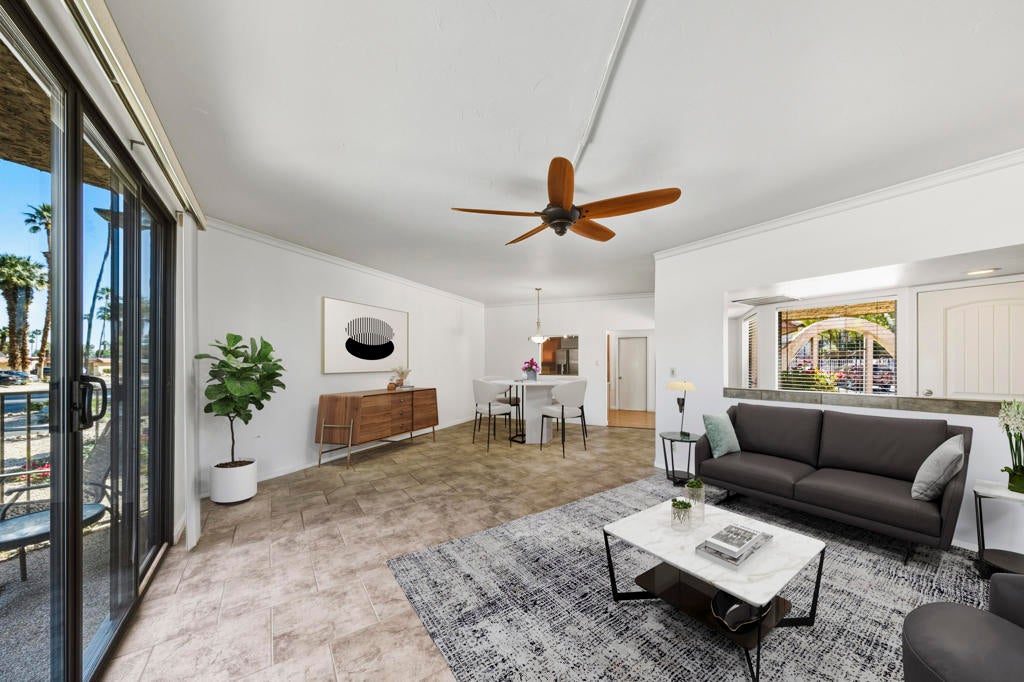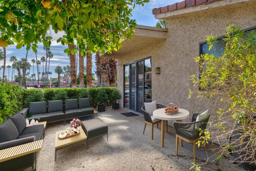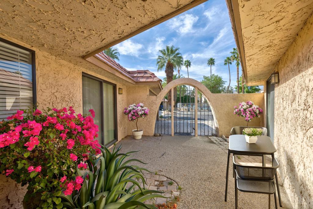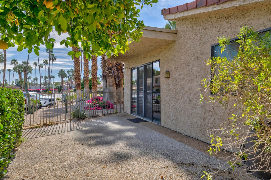 Located in the desirable, gated Cathedral Canyon Country Club, this beautifully maintained single-level 2-bedroom/2-bath condo offers 1,406 sq ft of comfortable living space with tasteful upgrades throughout, no stairs required! Each bedroom features its own bathroom, providing ideal separation and privacy. One bedroom includes a walk-in closet and a spacious walk-in shower.The home features a gated entry patio as well as a generously sized back patio, perfect for outdoor dining and relaxation, with nearby fruit trees adding a touch of desert charm. Additional highlights include interior laundry, an attached 2-car garage and a convenient location close to two community pools and guest parking.Ideally situated near local restaurants, shopping, and the Agua Caliente Casino, this home offers comfort, convenience, and resort-style living.