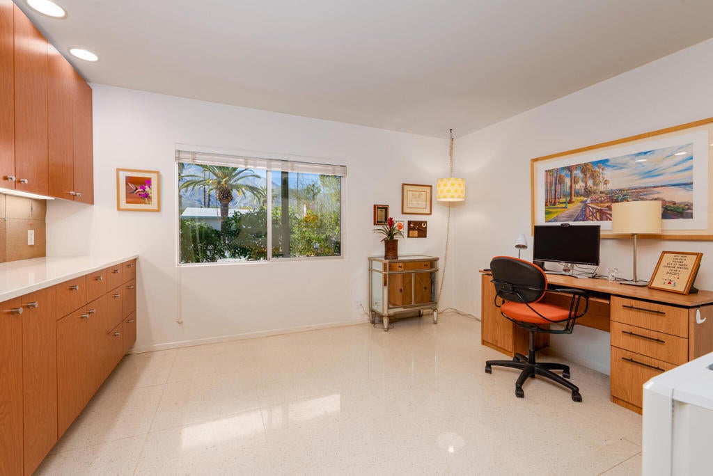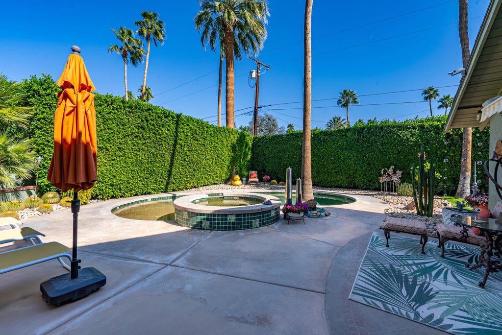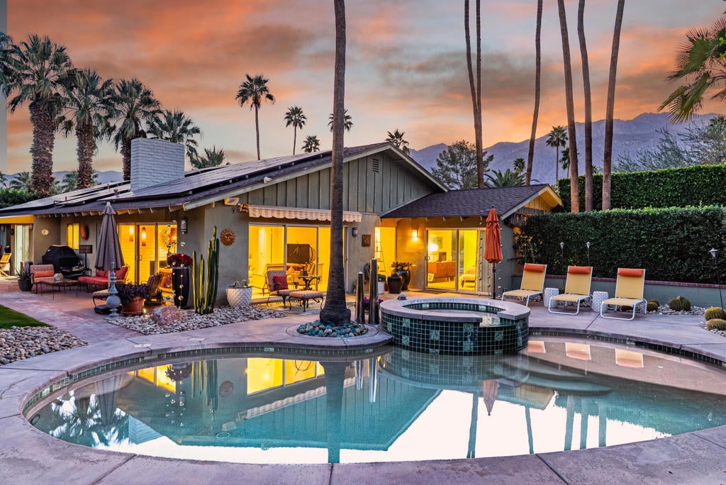 New Price! Check out the 3D Virtual Proposed kitchen Design Upgrade option. True Palm Springs awaits at this 4bm, 3ba property with its Mid-Century flair and a true resort style back yard experience. Immediately, the tone is set by an exquisite terrazzo tile throughout. An open living and dining area for 6 showcases a MCM fireplace and glass doors which frame the pool and lush back yard. The functional kitchen, accompanied by a charming breakfast room, opens directly to a meticulously manicured backyard and outdoor gazebo with dining table and multiple seating areas. The primary suite is unto itself on one wing, generous in size with its own TV den, with dual vanities and large walk-in shower, and direct access to the back yard. On the other wing, two additional guest bedrooms offer comfortable accommodations, one featuring an elegant en suite bathroom and private backyard access with views of the pool. The 4th bedroom now serves as an office with great mountain views. Outside, mature ficus encloses the plant-filled yard ensuring leisure time at this property is truly undisturbed and completely private. Among this home's many improvements are an array of SMART devices, a garage finished with epoxy flooring and built-in storage, and a leased Solar System. Not only is this Sunrise Park home superbly located, it comes without an HOA, on Fee Land (You own the land), and within a neighborhood where short term vacation rentals are permitted. Take advantage of this opportunity today.