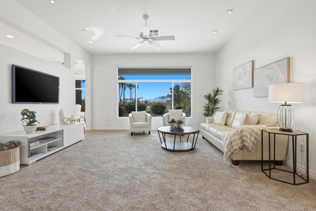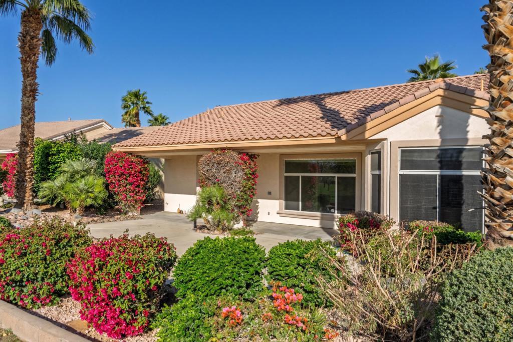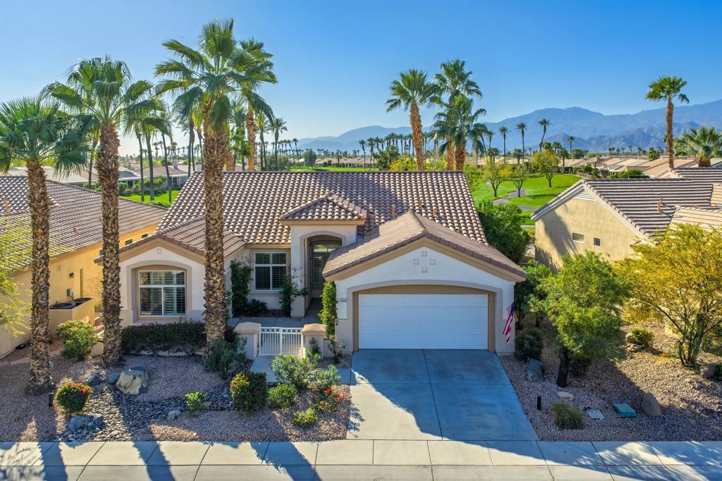 Sun City Palm Desert - Tangier. Located a short distance to the Lakeview Recreation Center, , this extended Tangier floorplan offers one of those views that stops you in your tracks. Positioned to capture spectacular south facing vistas down the long par-5 7th fairway, the setting delivers sweeping panoramas of the golf course, surrounding mountains, and over 100 palm trees. The rear yard is designed for relaxed desert living, featuring a spacious patio with multiple seating areas--perfect for entertaining or simply soaking in the scenery. Out front, a gated courtyard with patio adds both curb appeal and function, surrounded by lush desert landscaping accented with mature palms. Inside, 10-foot ceilings and transom windows create a light, open feel throughout. Diagonal-laid tile flooring is used extensively, enhancing the home's clean, cohesive design. The kitchen is well appointed with extensive raised-panel cabinetry, inset glass accents, pull-out shelves, corian countertops, a breakfast bar, and charming recipe windows. A large eating area with sliding glass doors connects seamlessly to the rear patio. The spacious living room enjoys uninterrupted fairway views, while double doors off the main hallway lead to a flexible den or office. The primary suite features a bay window, generous walk-in closet, and ensuite bath with dual sinks, cultured marble surfaces, and a stall shower. An extended guest bedroom offers French doors to the front courtyard and a nearby bath with tub/shower. Shutters accent the guest bedroom and den for added style and comfort. Additional highlights include indoor laundry with extra storage, a two-car garage with golf cart parking nook, new A/C (2019), and new water heater (2022). A rare combination of floorplan, upgrades, and unforgettable views--this is Sun City living at its finest.