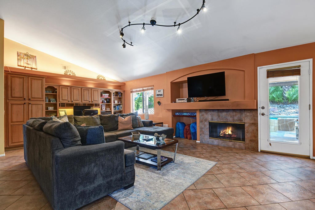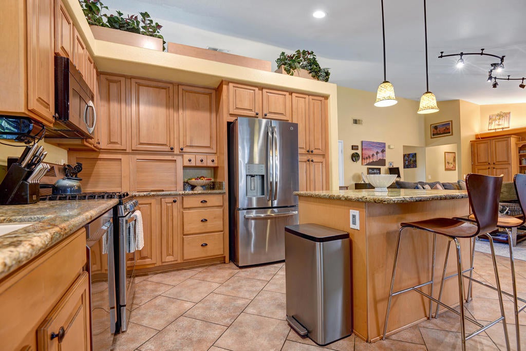 Highly sought-after, charming home in the Topaz neighborhood with no HOA, ideally located within walking distance to Amelia Earhart Elementary, John Glenn Middle School, and La Quinta High School. Designed for entertaining and everyday enjoyment, the backyard features a saltwater pool and spa, custom gas fire pit with stone seating, built-in BBQ island, patio covers, shade sails, and lush landscaping with privacy hedges--creating a private outdoor retreat. Both front and rear yards are low maintenance with artificial turf and drip irrigation.The interior offers diagonal tile flooring throughout and a thoughtfully designed layout ideal for both comfort and functionality. The kitchen features ample cabinetry, generous counter space, a center island, breakfast nook, and stainless steel appliances, opening seamlessly to the living and dining area. The living spaces showcase vaulted ceilings, a cozy fireplace, built-in office cabinetry, and ample natural light, making the home perfect for relaxing or hosting guests.Additional highlights include an indoor laundry room, automated pool equipment with app-based controls, and a home equipped with solar. This property offers a rare combination of location, lifestyle, and outdoor living in one of La Quinta's most desirable neighborhoods.Home may be sold furnished or unfurnished. Schedule your private showing today to experience all this home has to offer.