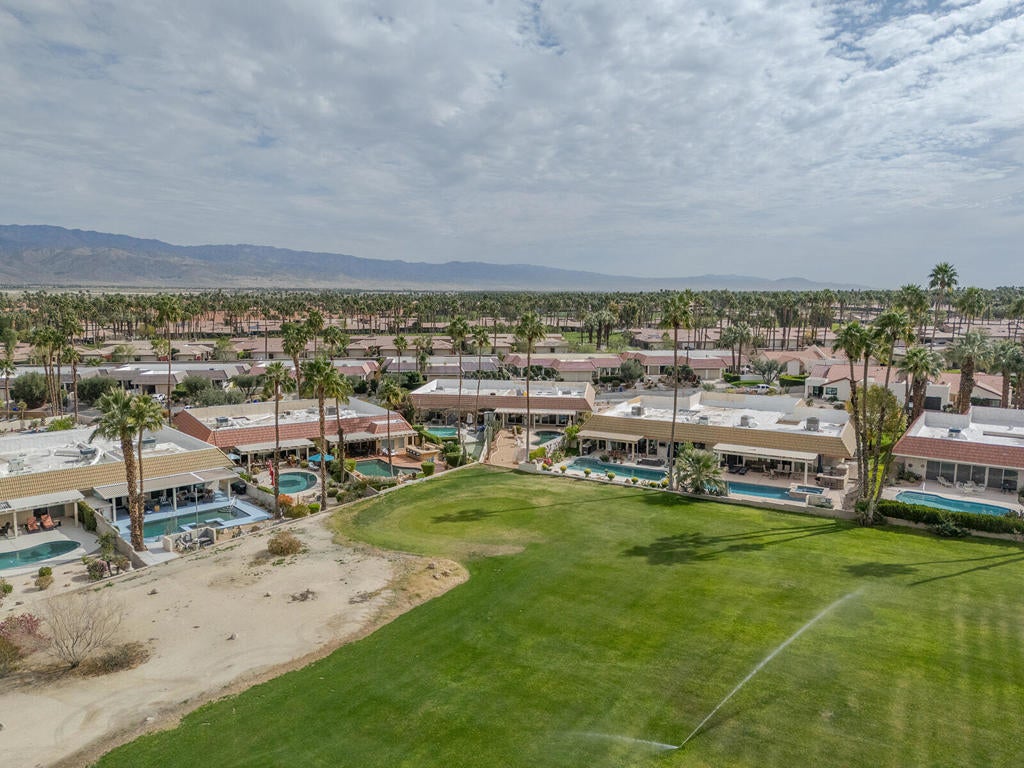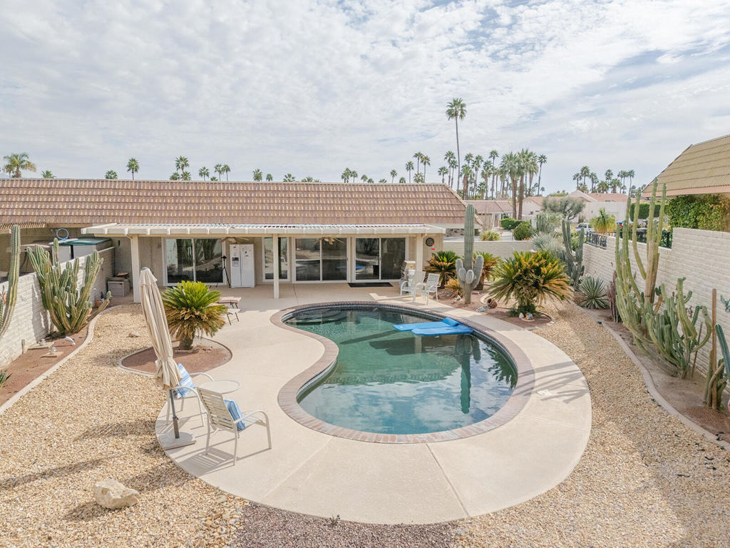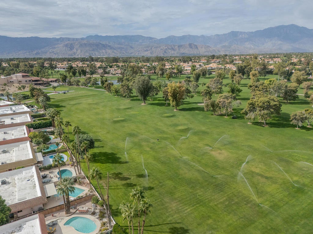 Avondale Golf Club is a very special community that is a private club with new golf course ownership that has put will over one million dollars into the beautiful new club house remodel and upgrade. That is just the beginning. The golf course is like no other in the desert - a midwestern layout that it challenging, but a joy to play every day of the year. This condo sits far down on the driving range well out of golf ball range with gorgeous western mountain views as well as views of the first and six and seventh fairways from a large and very comfortable backyard with an inviting pool and lounge area. The home features an updated and new look kitchen with room to cook and counter top; spacious living room, den with fireplace, three bedrooms all with en-suites and the Primary bedroom and en-suite has been tastefully upgraded with fireplace and the home has a new roof and new heat pump units, new sliders installed 2 yrs ago, 4 stage water filter under the kitchen sink, 2 50 bottle wine coolers, tankless water heater, all caned lights in the kitchen and bathroom that are adjustable, new ceiling fans in the outside patio, soft water system. The home has been well cared for and it show the pride of homeownership. This is one of a kind attached singe family home is in the most wonderful community in Palm Desert. A community where the HOA monthly dues include social membership that gives you not only a lot of actives to the stunning Club House, Fitness Center with updated equipment, some golf privileges, tennis and pickle-ball, dog park and meeting some of the most socially active new friends from all over the world. Avondale is very proud of the ''family'' atmosphere that blends neighbors and friends season after season and year after year. Come take a look at this very large 2,640 home with the wonderful views and gorgeous back yard. This is a warm and spacious home, not just a house. A home that makes you feel comfortable and happy when you walk thru the front door and realize... you are walking into to your wonderful home and living the desert live style that you deserve. Come take a look and this beautiful home...You will be glad you did.