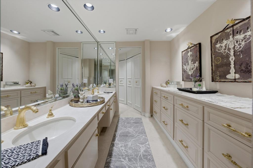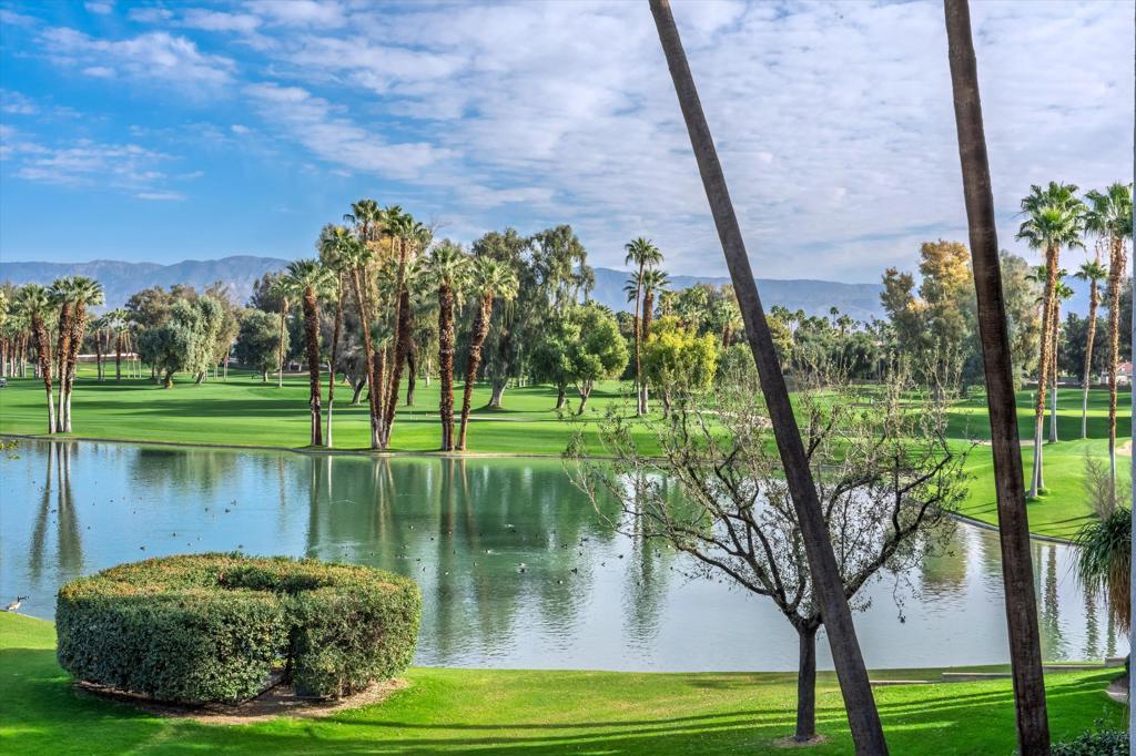 Rare spacious 3-bedroom, 3-bath condo at Desert Island with impressive views of the lake, golf course, and mountains. Features a formal mirrored entry, large living room with custom built-ins, gas fireplace, crown moldings, custom draperies and expansive 9-ft high windows leading to a huge, covered terrace perfect for entertaining or just relaxing. Remodeled kitchen offers oak cabinets, granite counters and stainless-steel appliances. With over 2,600 square feet of interior space, all rooms are generously sized. Altogether this home provides a blend of comfort with extraordinary views and a carefree lifestyle. Desert Island stands as a distinctive high-rise condominium community on a lush, 25-acre private island encircled by a sparkling lake and a lush green 18-hole championship golf course. Residents enjoy beautifully landscaped park-like grounds with walking paths, fruit trees, seating areas, tennis and pickleball courts, heated swimming pools and spas, pedal boats, fishing facilities, and secure 24-hour guard-gated entry. The HOA fees cover on-site management, central air-conditioning, water, gas, trash, Spectrum cable TV, Wi-Fi Internet, and the maintenance of landscaping and common areas, providing a low-maintenance, carefree lifestyle. Conveniently located close to shopping, dining, theaters, galleries, and casinos, with easy access to Eisenhower Medical Center. Schedule your showing today and discover why this home is not just a property, but a place to create lasting memories!