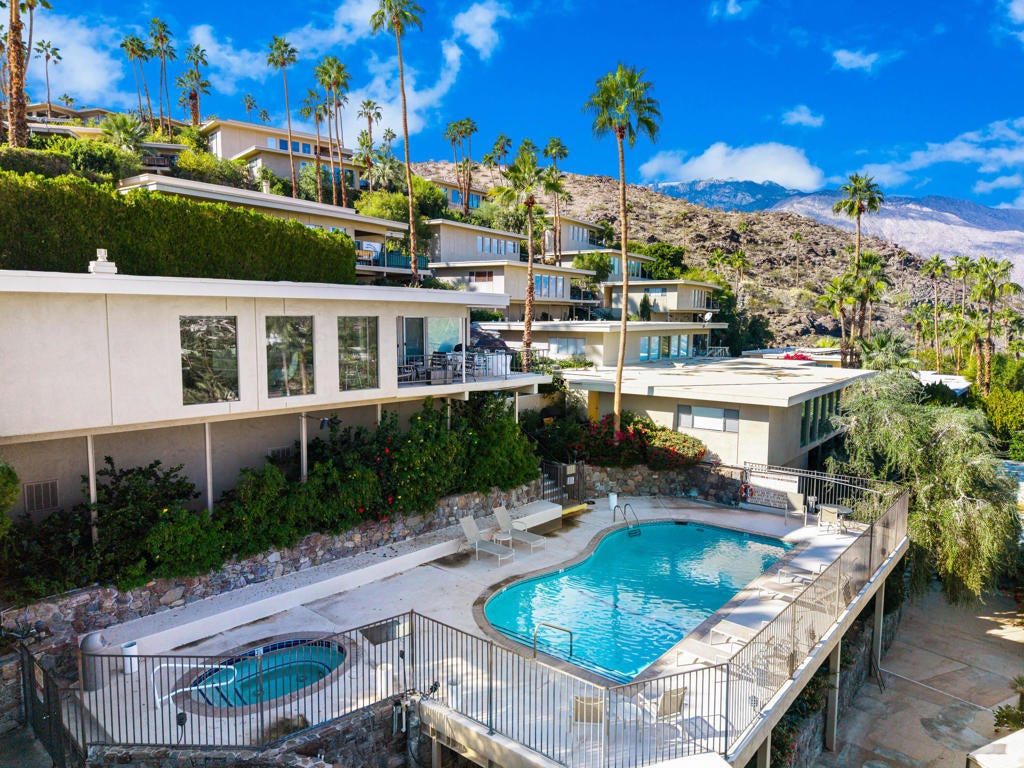 PRICED TO SELL! Great midcentury fixer with huge upside in iconic Rimcrest. This light-filled 2 bedroom, 2 bath condo (plus den) sits on the Southridge hill with sweeping Coachella Valley views and a spacious private terrace perfect for sunset evenings and entertaining. The classic mid-century bones are here: walls of glass, open living spaces, and connection to the outdoors. Renovate and modernize the kitchen and baths to unlock true value, or convert the generous den into a third bedroom for added rental or resale appeal (confirm permits). Residents enjoy two pools and three spas, native rock landscaping, shaded walking paths, and some of the best panoramic views in Palm Springs. Located just below the famed Hope Residence on Southridge and a short drive to downtown Palm Springs, dining and shopping on Palm Canyon Drive, this is a rare opportunity to own in a historic mid-century enclave.