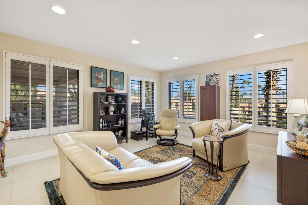 Great corner location with mountain views and private gated patio. Popular 2 bedroom 2 bath floorplan with fireplace and added office plus family room/den. Attached double car garage has epoxy flooring, built-in cabinets, laundry + newer HVAC & water heater. Great living spaces with beautiful kitchen, stainless appliances & quartz counters. Kitchen is open to Living room & Family Room. Primary bath has walk-in tiled shower Guest suite has attached bath and added office with skylights. All sliding doors and windows are updated. Enjoy sunrise and moonrise over Mt Eisenhower from the spacious patio. Great views and privacy. Patio is tiled and walled for privacy. Walkway & driveway are interlocking paver stones. Impressive desert landscaping is beautifully maintained. Some items of furnishings are included. Located in the heart of the Club just a short walk to clubhouse & tennis/fitness facilities. Ironwood is a private Member-owned golf community. Access to facilities (golf, tennis, fitness, dining is by membership only).