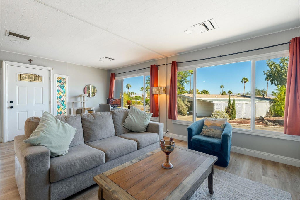 Welcome to your newly remodeled home in the sunny city of Palm Desert--all ages welcomed! Situated on a desirable corner lot with extra privacy and amazing mountain views, this charming residence offers 2 bedrooms, 2 bathrooms, and just over 1,300 sq. ft. of living space, surrounded by beautiful desert scenery.Thoughtfully updated throughout, the home showcases new interior and exterior paint, updated flooring, brand-new appliances, and modern finishes. Step inside to discover stylish laminate flooring, recessed lighting, and a bright open-concept layout that seamlessly connects the living room and kitchen.The spacious living area provides plenty of room for relaxing or entertaining, highlighted by large windows that fill the home with natural light and frame stunning mountain views. The beautifully updated kitchen features white cabinetry, sleek gray countertops, and new stainless-steel appliances, creating a clean and contemporary feel. Just off the kitchen, the convenient laundry room allows for easy multitasking while preparing meals or hosting guests.Both bedrooms are generously sized with large windows and recessed lighting, while the remodeled bathrooms showcase new vanities and updated shower/tub surrounds for a fresh, modern touch.Ideally located close to the heart of Palm Desert, you'll enjoy being just minutes from El Paseo, premier shopping, dining, and entertainment--right in your backyard.Don't miss the opportunity to own this beautifully updated Palm Desert home--schedule your private tour today!