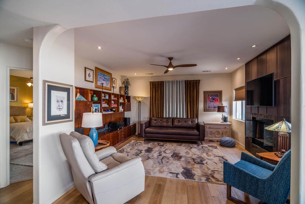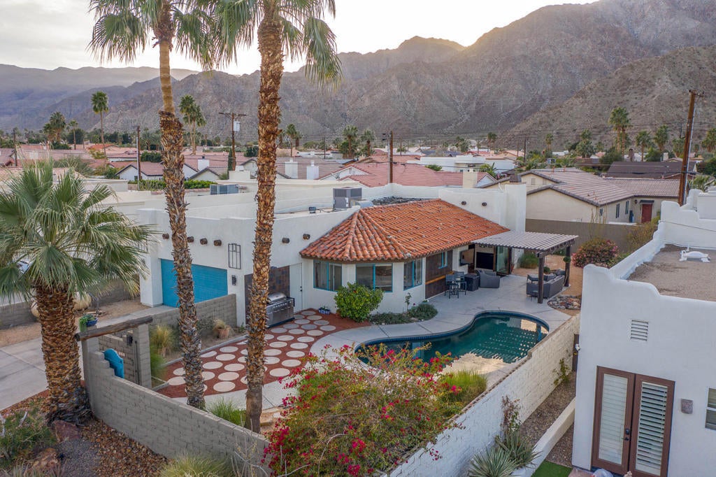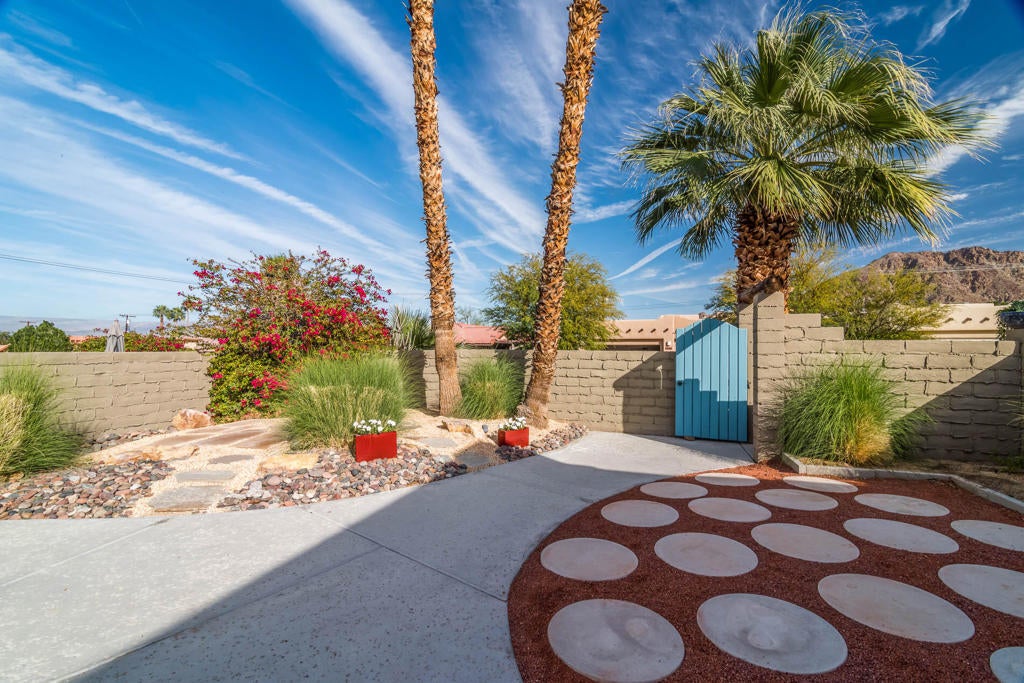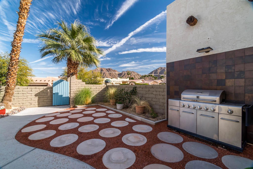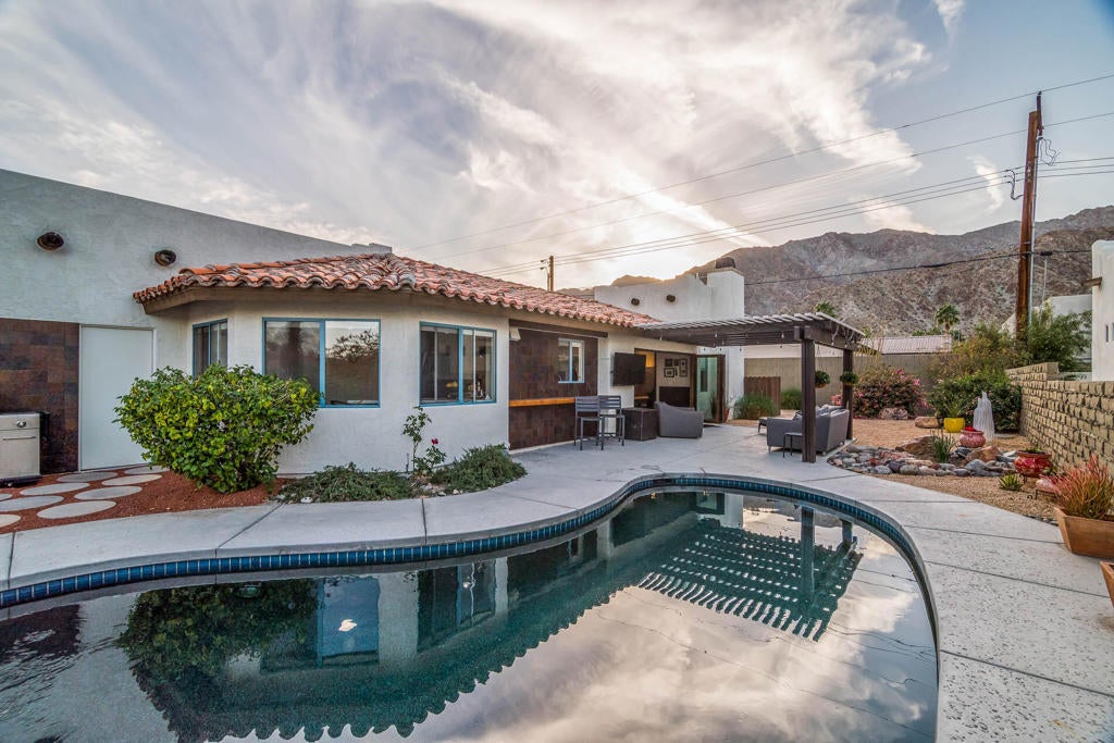 A Pueblo-Contemporary Gem with an expanded outdoor living space in the LQ Cove. This home is a must see! Recently remodeled 3 years ago, this 3BR 2 BA 1,564 Ft pool home on an oversized lot offers an amazing number of design features. From the moment you enter the front patio gate, you are transformed to a relaxed, elegant desert setting, perfect for BBQs and enjoying beverages at the seated drink counter by the heated saline, pebble-tech kidney shaped pool or the shaded pergola. The front door was transformed to a NanaWall Glass Wall with a 12 ft opening for indoor-outdoor living space on those many perfect weather days! Other luxury home features include: new luxury white oak vinal and carpet floors, Dining room w custom display cabinets, custom accent paneled walls in the Dining, Living and primary BRs, porcelain counters and walnut cabinets in the kitchen, morning room with counter space for 4, large cabinet pantry, custom entertainment center, bookshelves and fireplace in the LR, New bathroom updates, has coat and linen closets, Laundry room built-ins include shoe, coat and hat storage, plus so much more! The 2 car garage is fully insulated and finished with a work bench, the propane tank is for heating the pool. The City of La Quinta is currently upgrading parks and schools. Within 1 mile of ''Old Town'' and many hiking trails, this is a wonderful place to live, work and play! Make your appointment to see this special home right away!