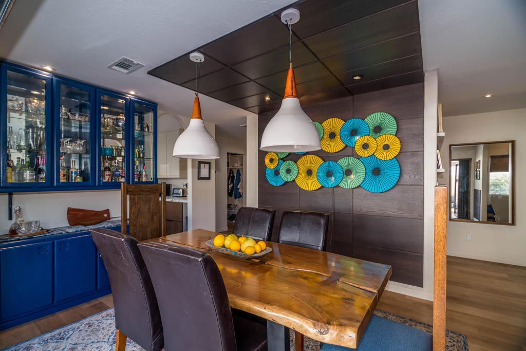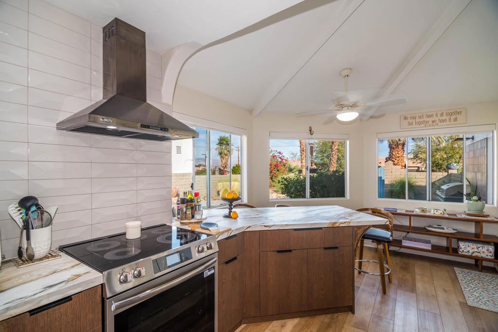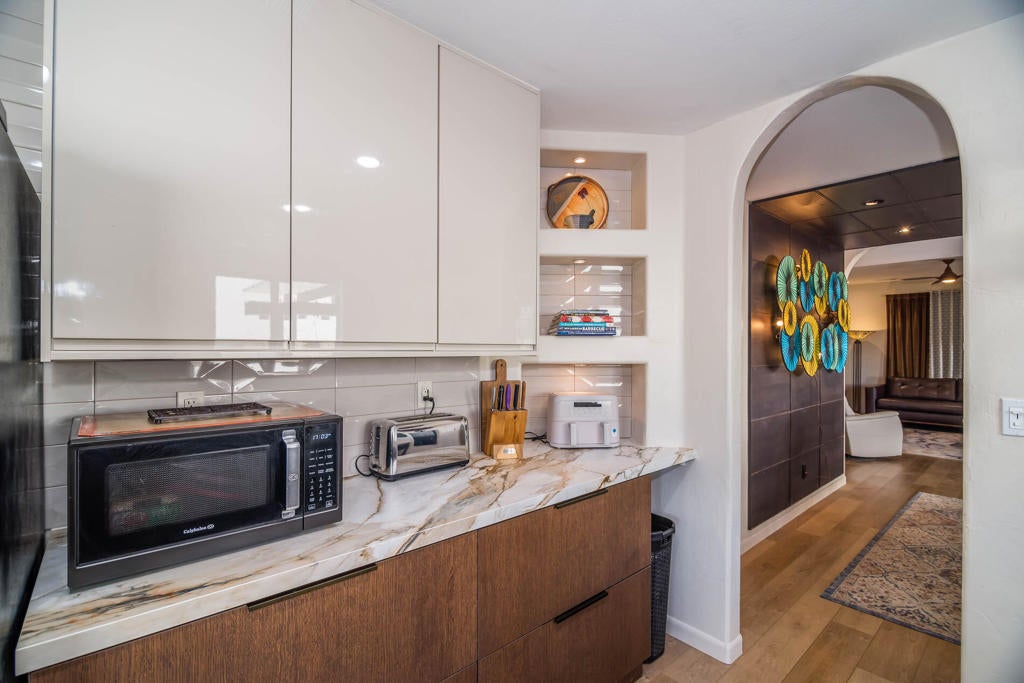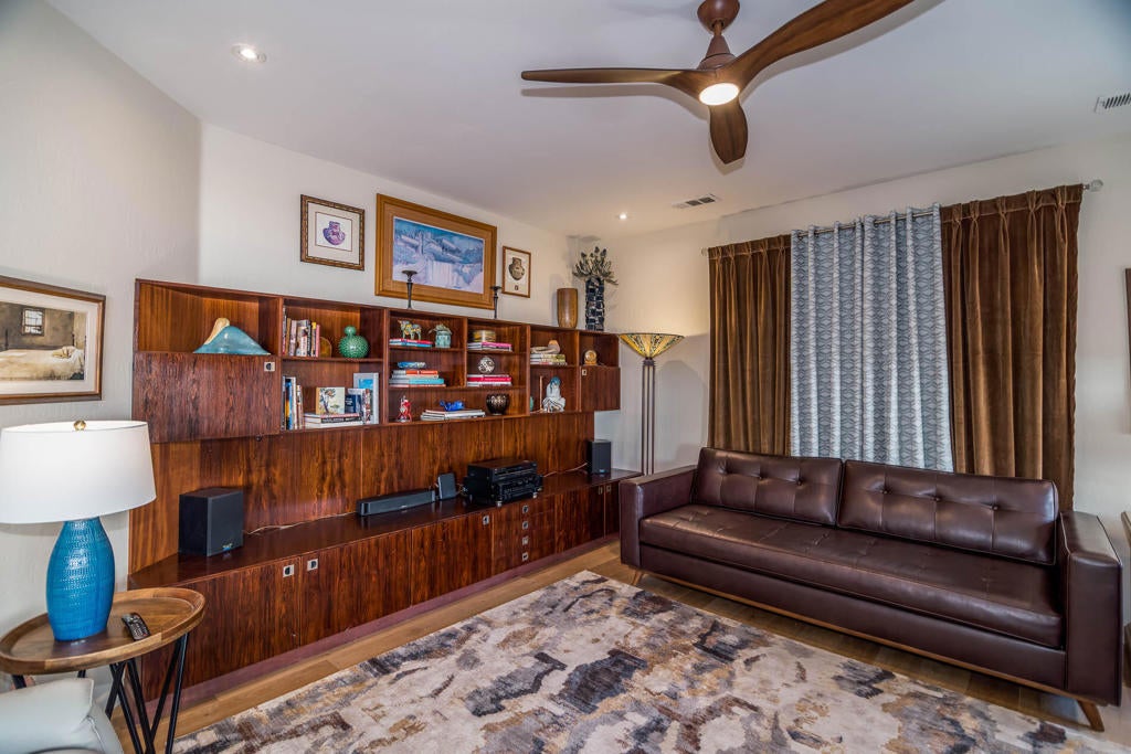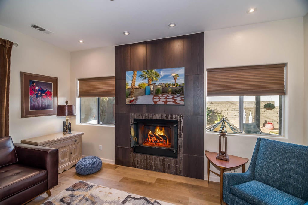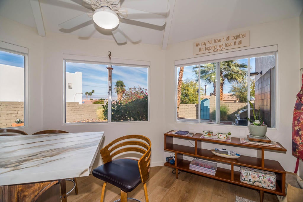 A Pueblo-Contemporary Gem with an expanded outdoor living space in the LQ Cove. This home is a must see! Recently remodeled 3 years ago, this 3BR 2 BA 1,564 Ft pool home on an oversized lot offers an amazing number of design features. From the moment you enter the front patio gate, you are transformed to a relaxed, elegant desert setting, perfect for BBQs and enjoying beverages at the seated drink counter by the heated saline, pebble-tech kidney shaped pool or the shaded pergola. The front door was transformed to a NanaWall Glass Wall with a 12 ft opening for indoor-outdoor living space on those many perfect weather days! Other luxury home features include: new luxury white oak vinal and carpet floors, Dining room w custom display cabinets, custom accent paneled walls in the Dining, Living and primary BRs, porcelain counters and walnut cabinets in the kitchen, morning room with counter space for 4, large cabinet pantry, custom entertainment center, bookshelves and fireplace in the LR, New bathroom updates, has coat and linen closets, Laundry room built-ins include shoe, coat and hat storage, plus so much more! The 2 car garage is fully insulated and finished with a work bench, the propane tank is for heating the pool. The City of La Quinta is currently upgrading parks and schools. Within 1 mile of ''Old Town'' and many hiking trails, this is a wonderful place to live, work and play! Make your appointment to see this special home right away!