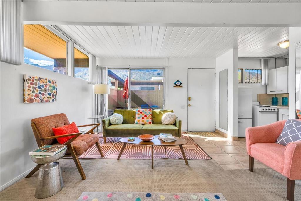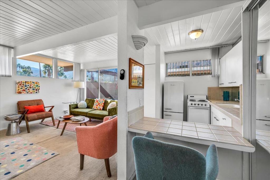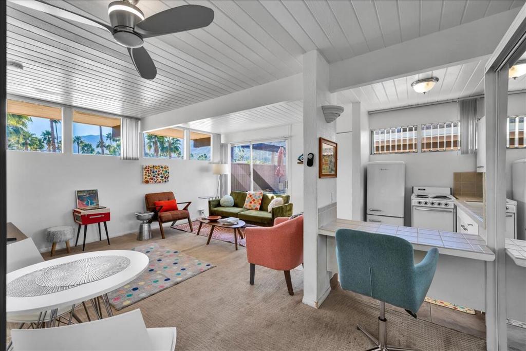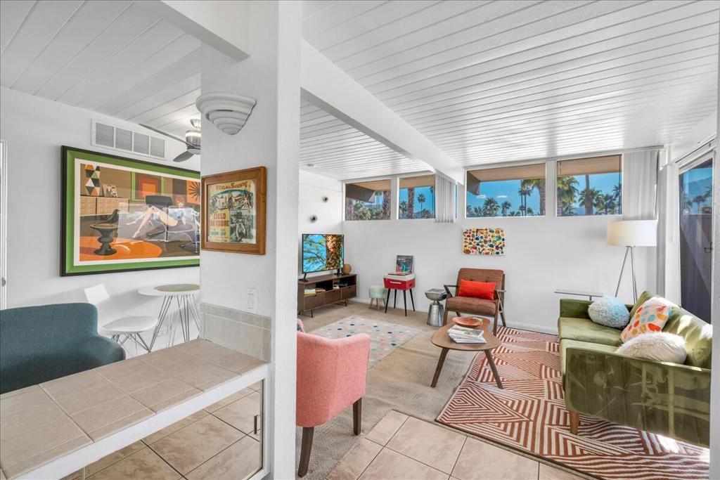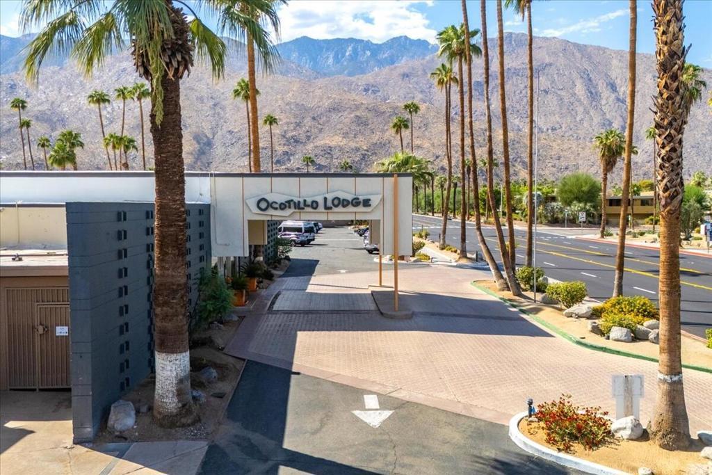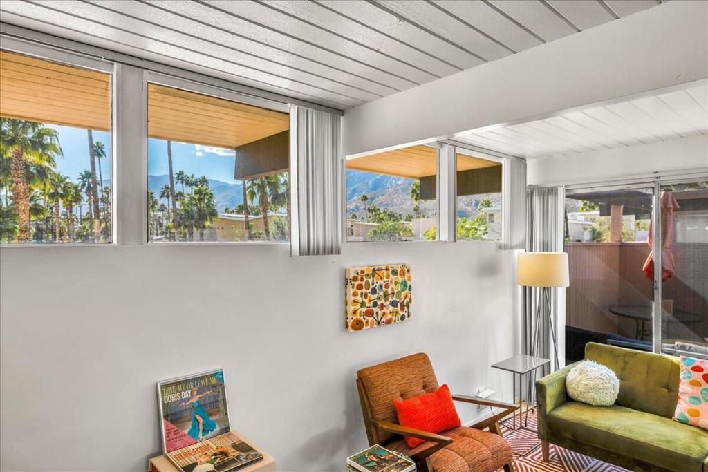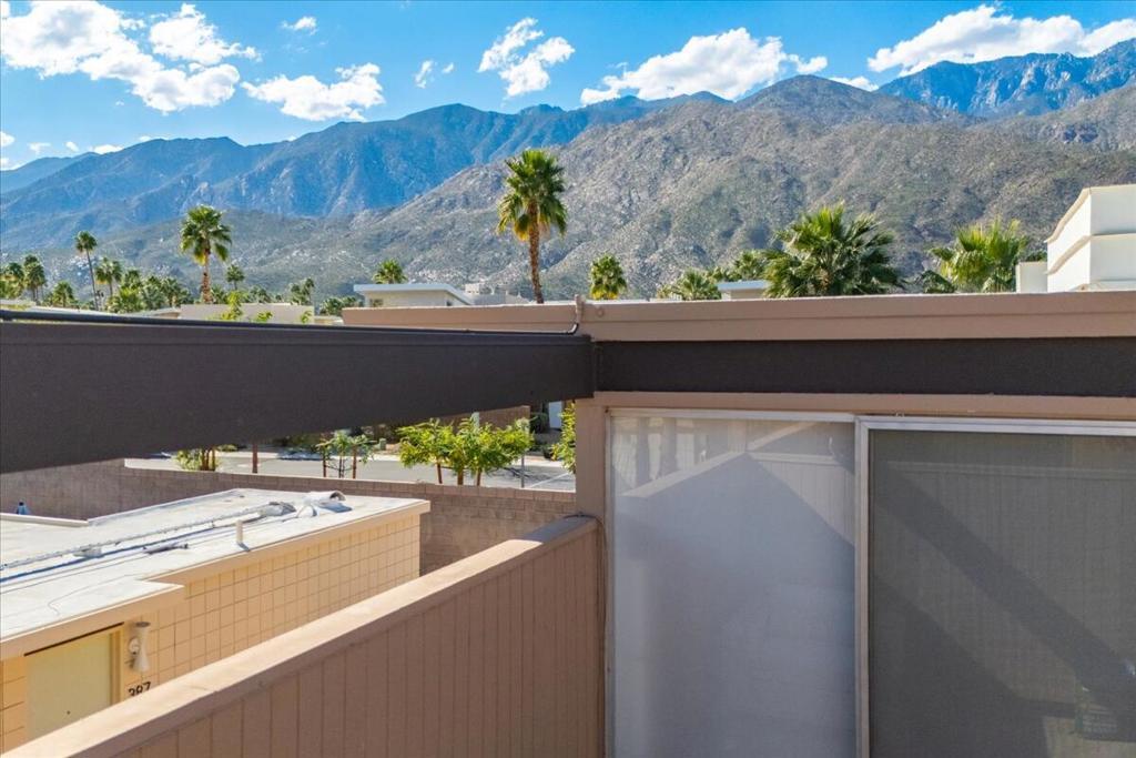 Own a piece of Palm Springs history! The HOA dues include everything: water, electric, WiFi, internet, cable, trash, pool, spa, clubhouse, and gym. It's all about the breathtaking, unobstructed views from this top floor unit in Ocotillo Lodge, the iconic landmark community in South Palm Springs. This unit is on the inner side of the 2nd floor, away from the traffic of E Palm Canyon Drive. From inside, the clerestory windows offer poster-perfect views of palm trees, mountains, sunrises, sunsets, and the fabulous midcentury architecture of the complex and adjacent Twin Palms neighborhood. This unit has tons of the original 1957 charm along with some thoughtful updates. The huge skylight over the double sinks in the bathroom keeps this room light and bright. There's a semi-private outdoor deck area perfect for taking in the views while enjoying the amazing desert climate. This iconic building, situated on 10 acres of prime Palm Springs land, was completed by the Alexander Company in 1957 and designed by renowned architects William Krisel and Dan Palmer as their first Palm Springs project to showcase and market their second venture, the Twin Palms neighborhood.