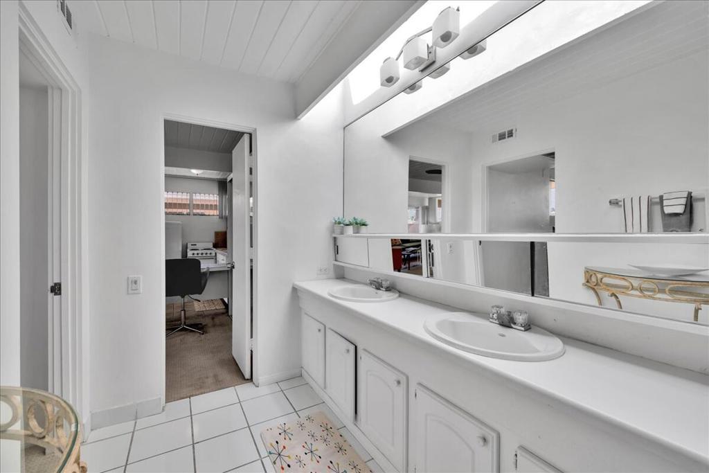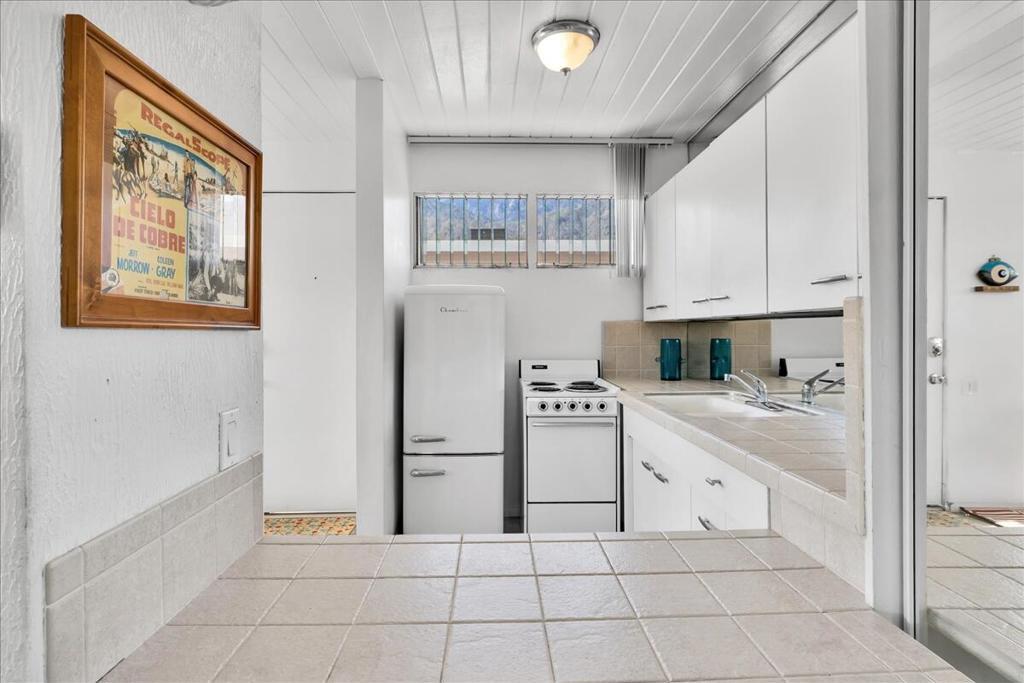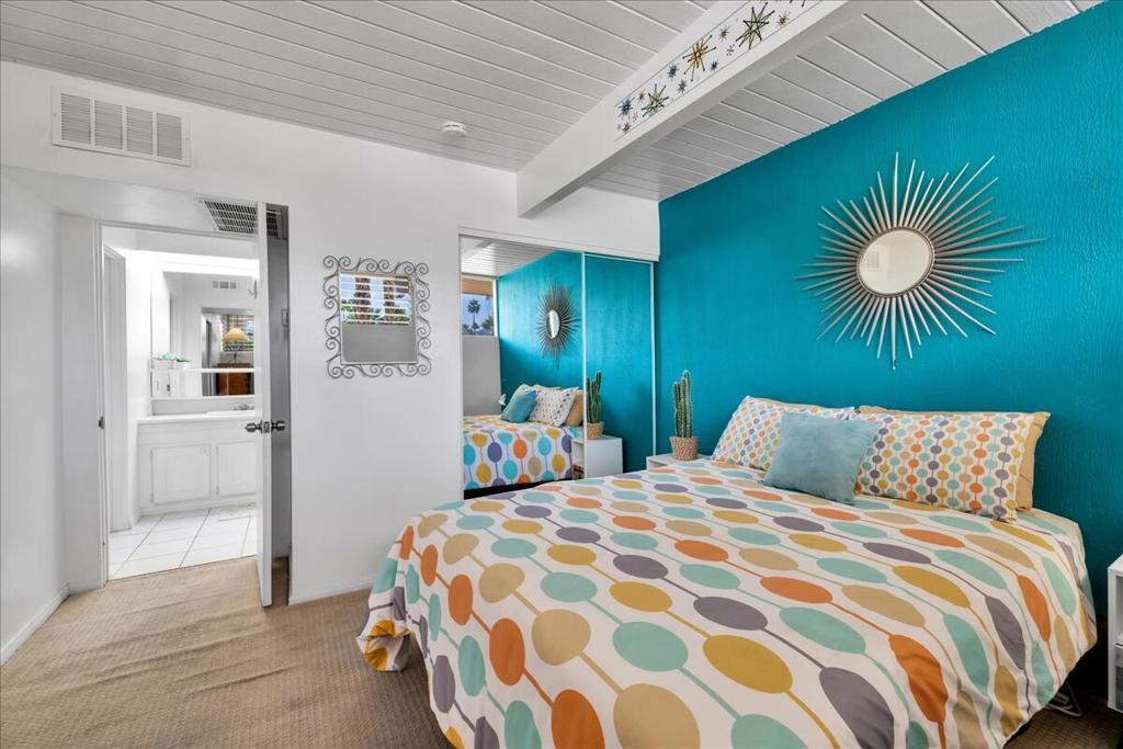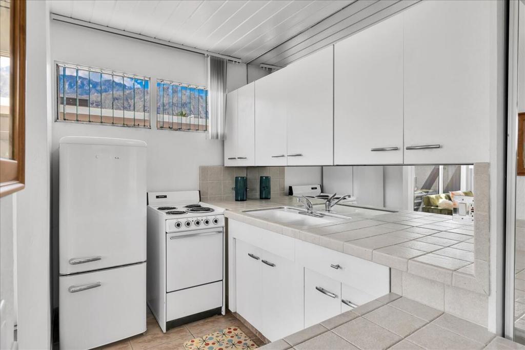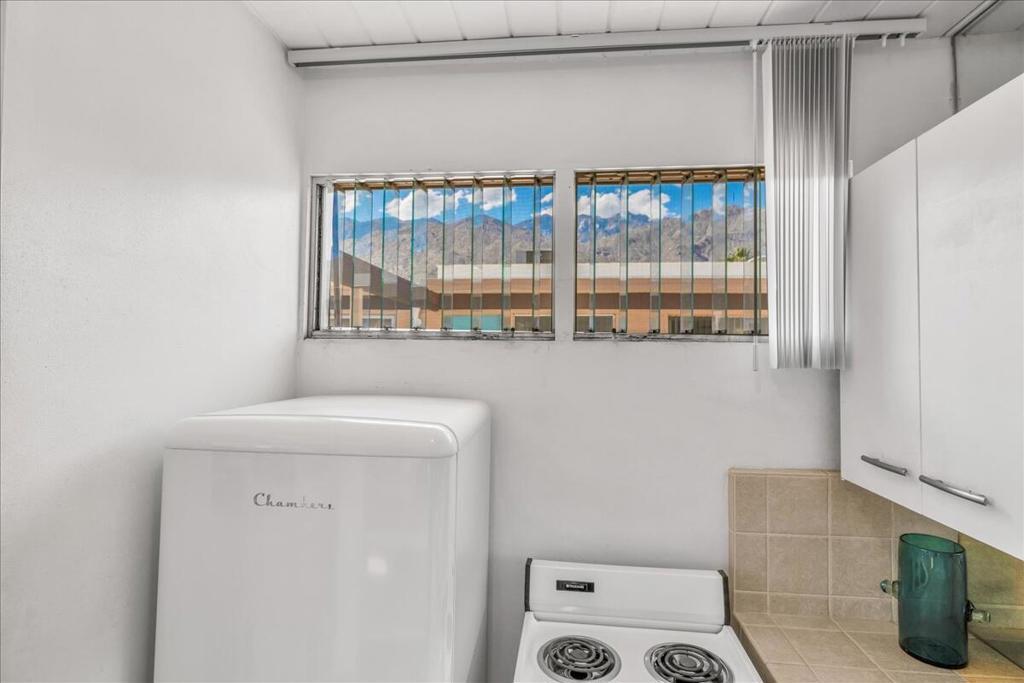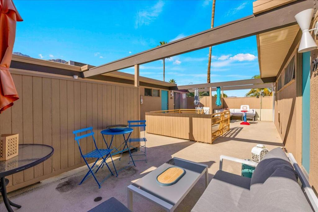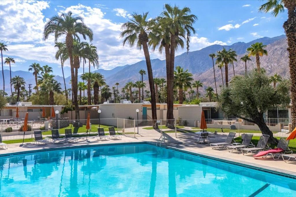 Own a piece of Palm Springs history! The HOA dues include everything: water, electric, WiFi, internet, cable, trash, pool, spa, clubhouse, and gym. It's all about the breathtaking, unobstructed views from this top floor unit in Ocotillo Lodge, the iconic landmark community in South Palm Springs. This unit is on the inner side of the 2nd floor, away from the traffic of E Palm Canyon Drive. From inside, the clerestory windows offer poster-perfect views of palm trees, mountains, sunrises, sunsets, and the fabulous midcentury architecture of the complex and adjacent Twin Palms neighborhood. This unit has tons of the original 1957 charm along with some thoughtful updates. The huge skylight over the double sinks in the bathroom keeps this room light and bright. There's a semi-private outdoor deck area perfect for taking in the views while enjoying the amazing desert climate. This iconic building, situated on 10 acres of prime Palm Springs land, was completed by the Alexander Company in 1957 and designed by renowned architects William Krisel and Dan Palmer as their first Palm Springs project to showcase and market their second venture, the Twin Palms neighborhood.