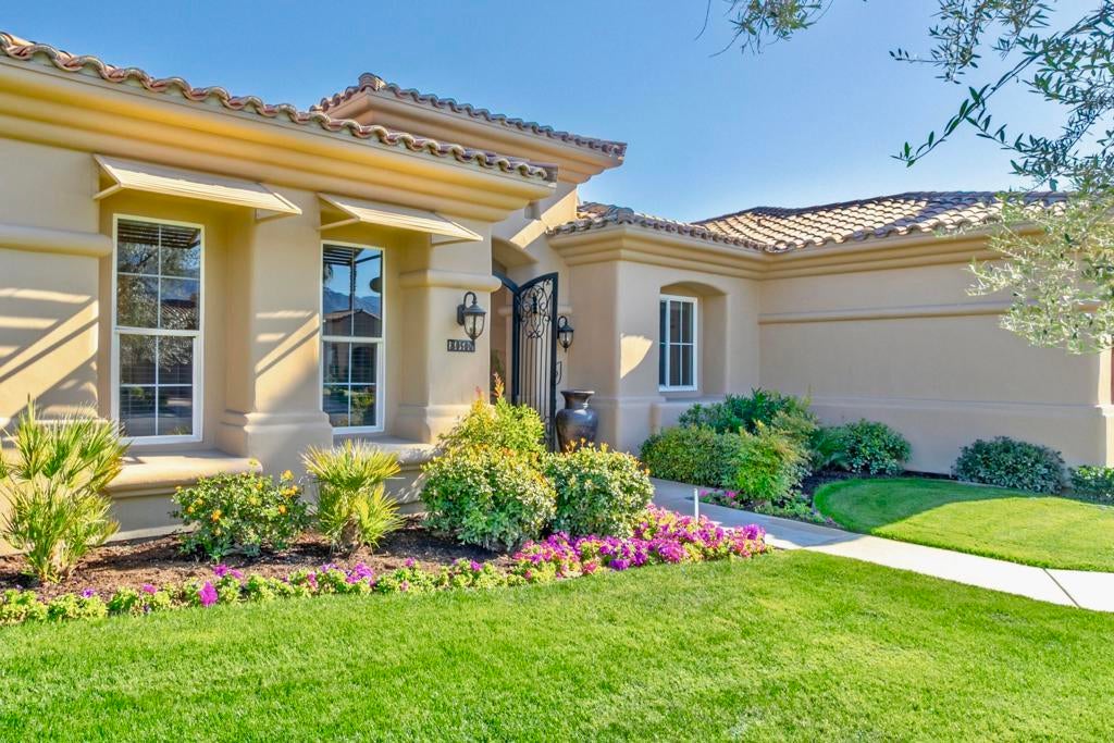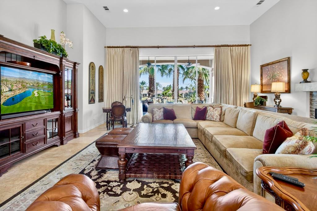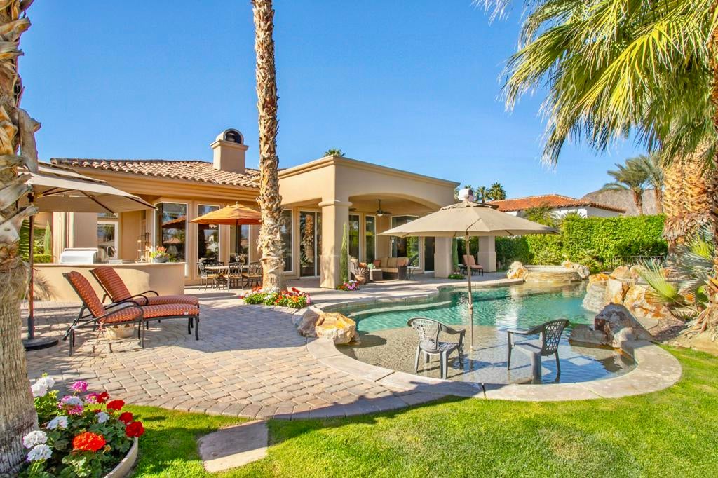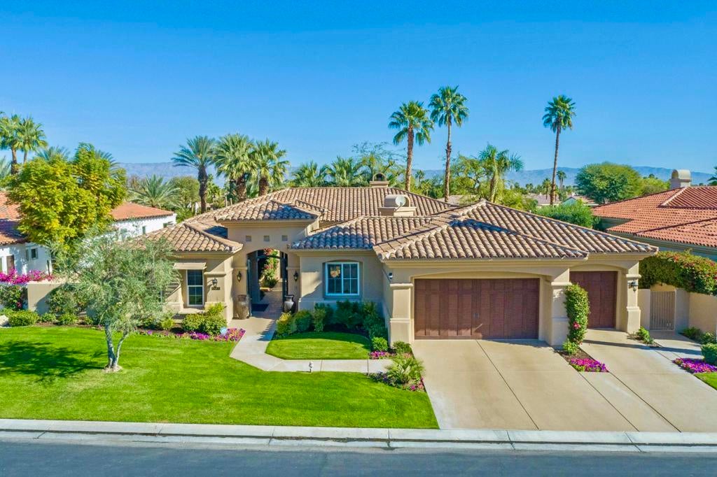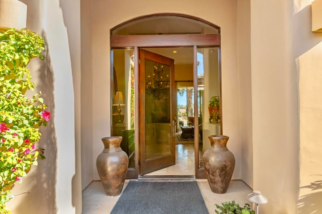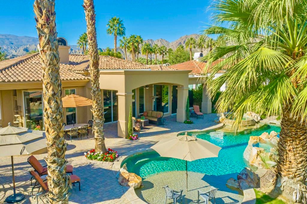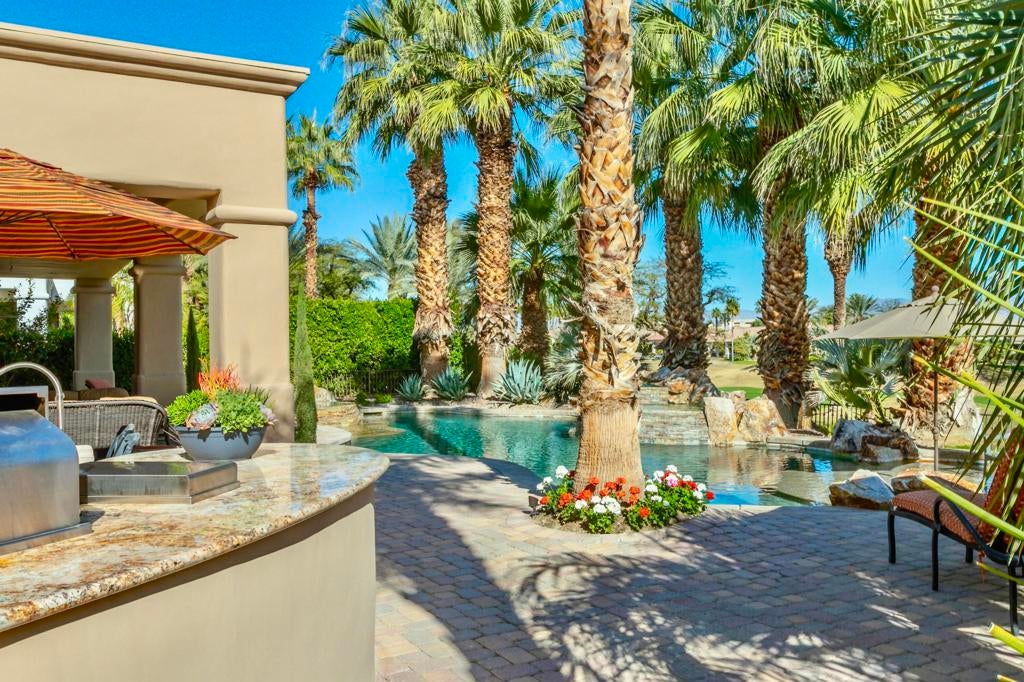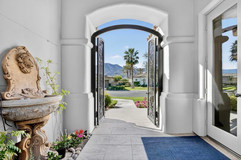 Nestled on the 10th hole of the Nicholas tournament course in PGA WEST this 4 bedroom 5 bath masterpiece blends Mediterranean charm with modern luxury. A coveted street to live on Weiskoff, this home is a masters 1 floor plan. Stunning entrance, as you step through an enchanted courtyard lush and inviting. The Formal entry welcomes you into a grand open great room, impeccably decorated, featuring travertine and mosaic tile floors, a see-through fireplace that separates the living and breakfast areas. A formal dining room illuminated by an elegant chandelier. The gourmet kitchen boasts beautiful cabinetry, granite countertops, a center Island, and stainless steel high-end appliances. There are 2 wine refrigerators, one being extra large in the Butler's pantry, and the other in the entertainer's wet bar. There is a place for everyone in this home! The spacious primary retreat has a large walk-in closet, beautiful granite showers, separate water closets, and a bonus room that can be used as an office or fitness room. There are gorgeous views. gorgeous views of the pool and golf course. There are panoramic Mountain views from all aspects on this property. The owners have done several upgrades from new A/C , new roof tiles, adding vintage lush, palms, citrus, fruit trees, new sound system and upgraded salt water pool unit for waterfall. A spa, tanning deck, fire pit, new built-in barbecue, new artificial turf. The covered patio allows plenty of space for dining and entertaining and privacy provided by multiple fruit trees. The Casita has a separate entrance from the main house. The home is close to Shopping, dining, World class Tennis BNP, festivals, and home to American Express PGA tournament. A true desert oasis comes turnkey furnished. Don't miss this opportunity. Welcome home!