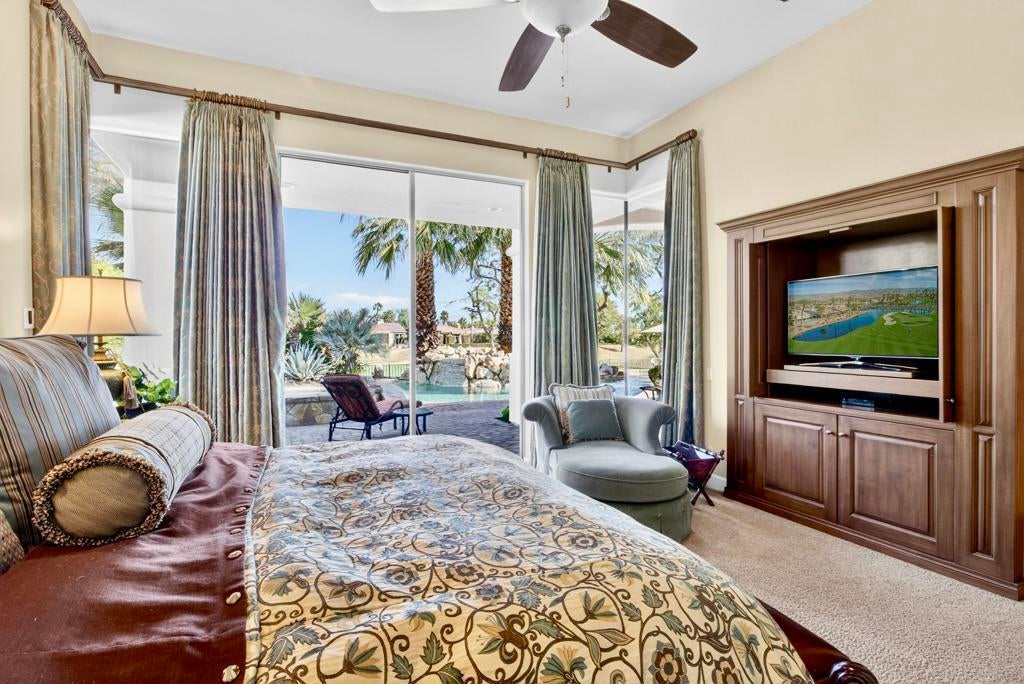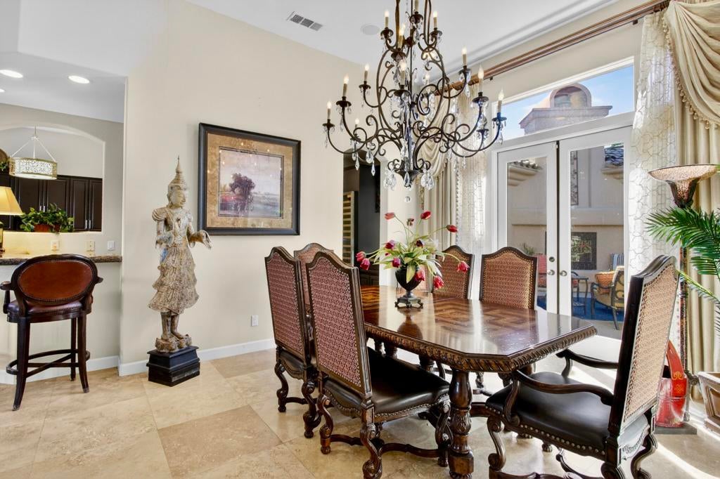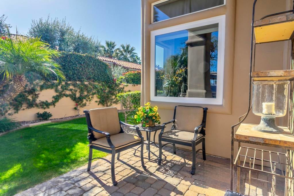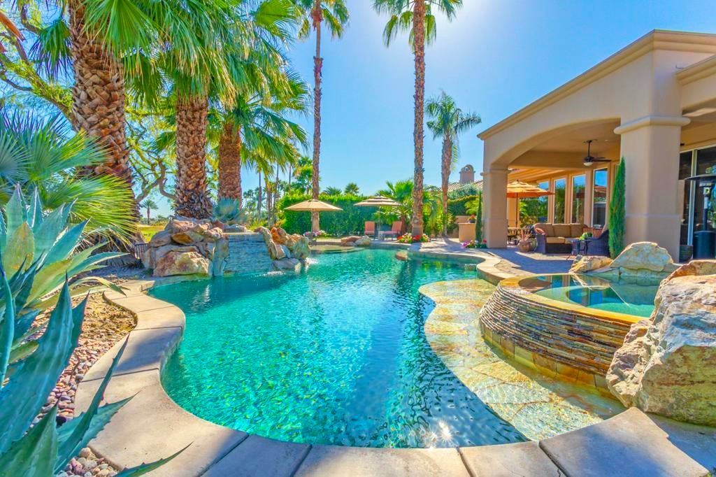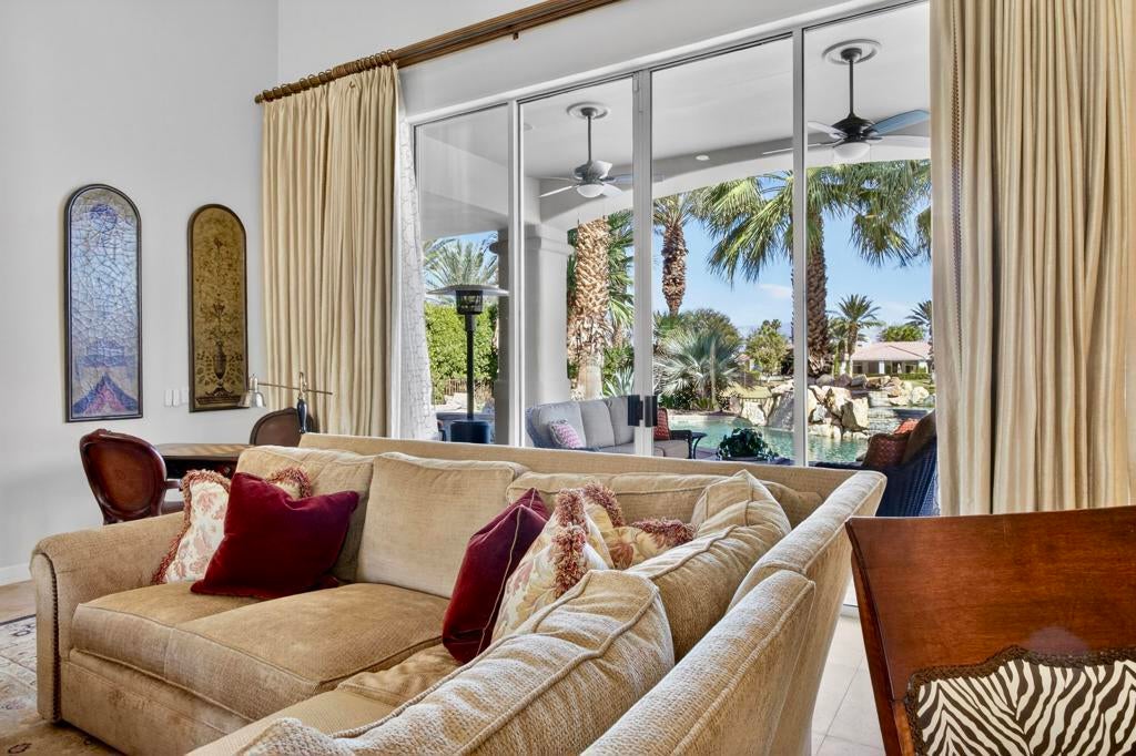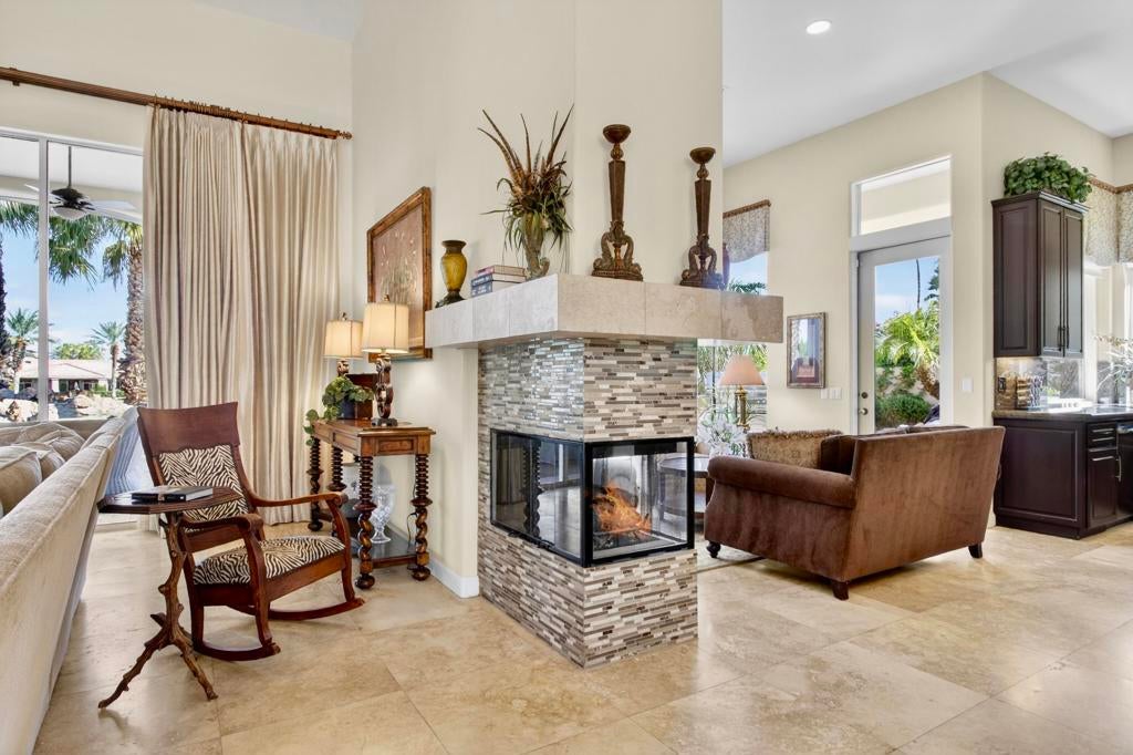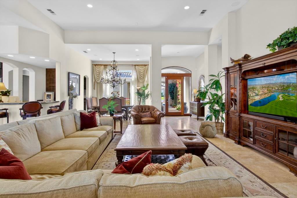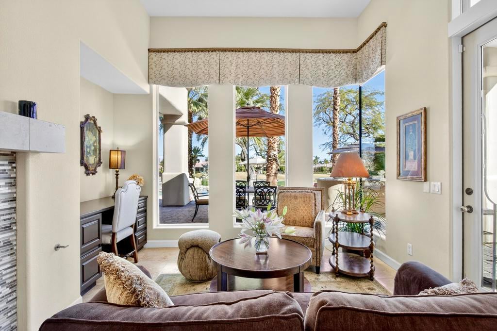 Nestled on the 10th hole of the Nicholas tournament course in PGA WEST this 4 bedroom 5 bath masterpiece blends Mediterranean charm with modern luxury. A coveted street to live on Weiskoff, this home is a masters 1 floor plan. Stunning entrance, as you step through an enchanted courtyard lush and inviting. The Formal entry welcomes you into a grand open great room, impeccably decorated, featuring travertine and mosaic tile floors, a see-through fireplace that separates the living and breakfast areas. A formal dining room illuminated by an elegant chandelier. The gourmet kitchen boasts beautiful cabinetry, granite countertops, a center Island, and stainless steel high-end appliances. There are 2 wine refrigerators, one being extra large in the Butler's pantry, and the other in the entertainer's wet bar. There is a place for everyone in this home! The spacious primary retreat has a large walk-in closet, beautiful granite showers, separate water closets, and a bonus room that can be used as an office or fitness room. There are gorgeous views. gorgeous views of the pool and golf course. There are panoramic Mountain views from all aspects on this property. The owners have done several upgrades from new A/C , new roof tiles, adding vintage lush, palms, citrus, fruit trees, new sound system and upgraded salt water pool unit for waterfall. A spa, tanning deck, fire pit, new built-in barbecue, new artificial turf. The covered patio allows plenty of space for dining and entertaining and privacy provided by multiple fruit trees. The Casita has a separate entrance from the main house. The home is close to Shopping, dining, World class Tennis BNP, festivals, and home to American Express PGA tournament. A true desert oasis comes turnkey furnished. Don't miss this opportunity. Welcome home!