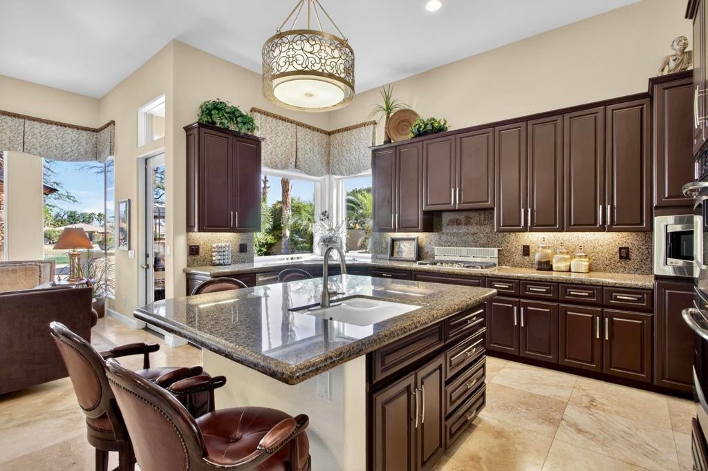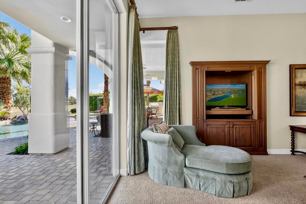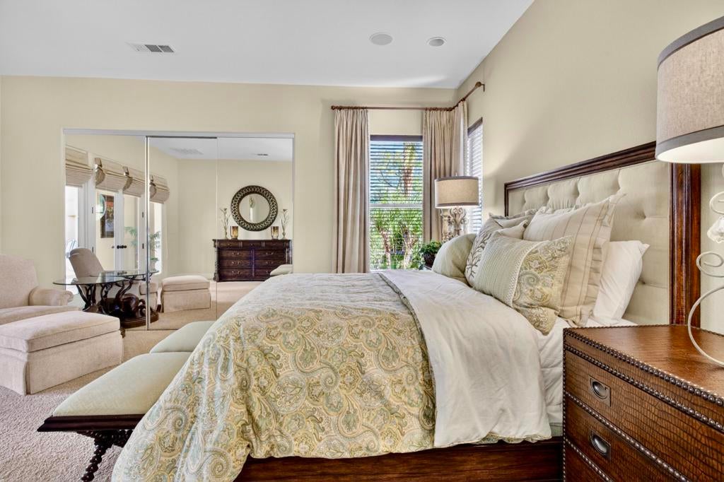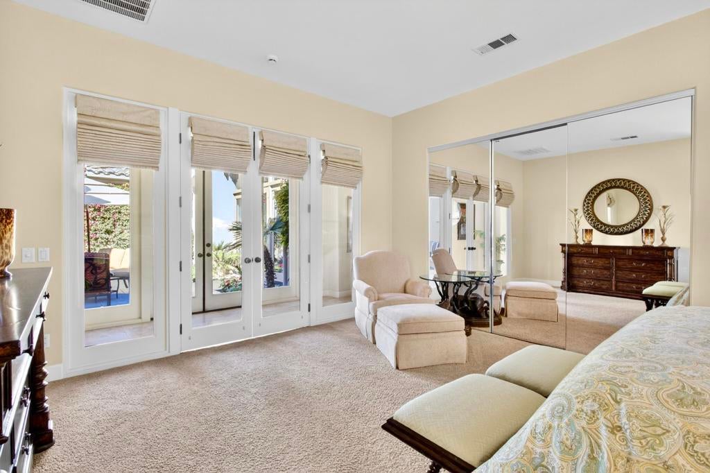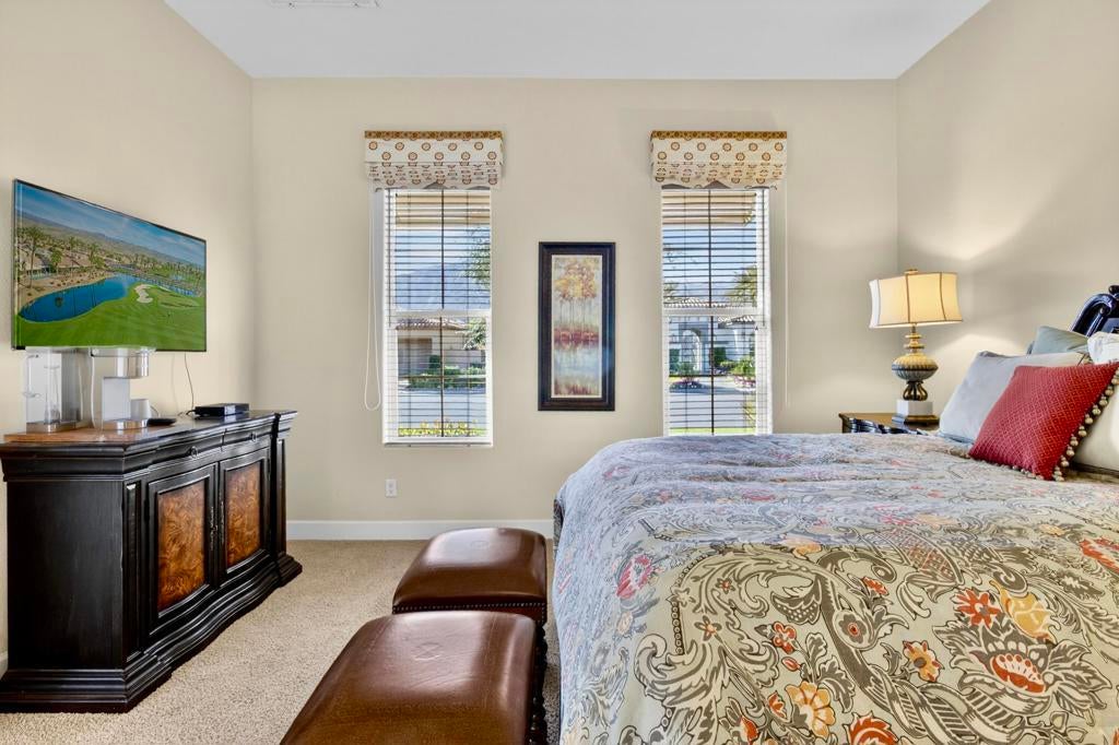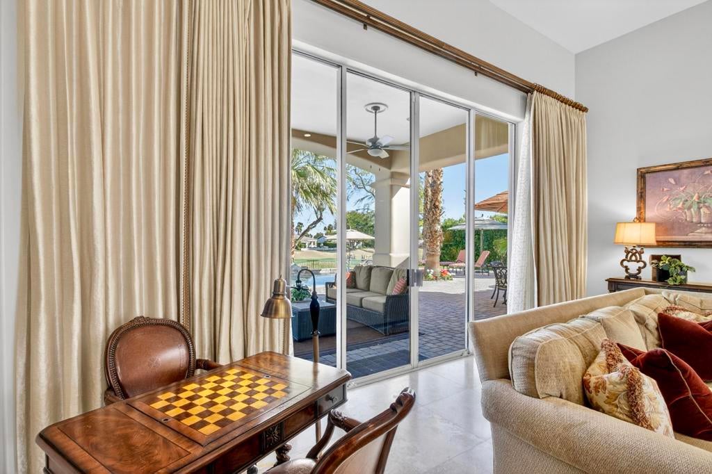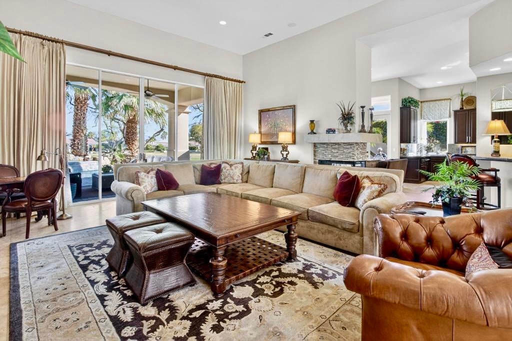 Nestled on the 10th hole of the Nicholas tournament course in PGA WEST this 4 bedroom 5 bath masterpiece blends Mediterranean charm with modern luxury. A coveted street to live on Weiskoff, this home is a masters 1 floor plan. Stunning entrance, as you step through an enchanted courtyard lush and inviting. The Formal entry welcomes you into a grand open great room, impeccably decorated, featuring travertine and mosaic tile floors, a see-through fireplace that separates the living and breakfast areas. A formal dining room illuminated by an elegant chandelier. The gourmet kitchen boasts beautiful cabinetry, granite countertops, a center Island, and stainless steel high-end appliances. There are 2 wine refrigerators, one being extra large in the Butler's pantry, and the other in the entertainer's wet bar. There is a place for everyone in this home! The spacious primary retreat has a large walk-in closet, beautiful granite showers, separate water closets, and a bonus room that can be used as an office or fitness room. There are gorgeous views. gorgeous views of the pool and golf course. There are panoramic Mountain views from all aspects on this property. The owners have done several upgrades from new A/C , new roof tiles, adding vintage lush, palms, citrus, fruit trees, new sound system and upgraded salt water pool unit for waterfall. A spa, tanning deck, fire pit, new built-in barbecue, new artificial turf. The covered patio allows plenty of space for dining and entertaining and privacy provided by multiple fruit trees. The Casita has a separate entrance from the main house. The home is close to Shopping, dining, World class Tennis BNP, festivals, and home to American Express PGA tournament. A true desert oasis comes turnkey furnished. Don't miss this opportunity. Welcome home!