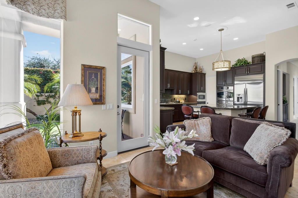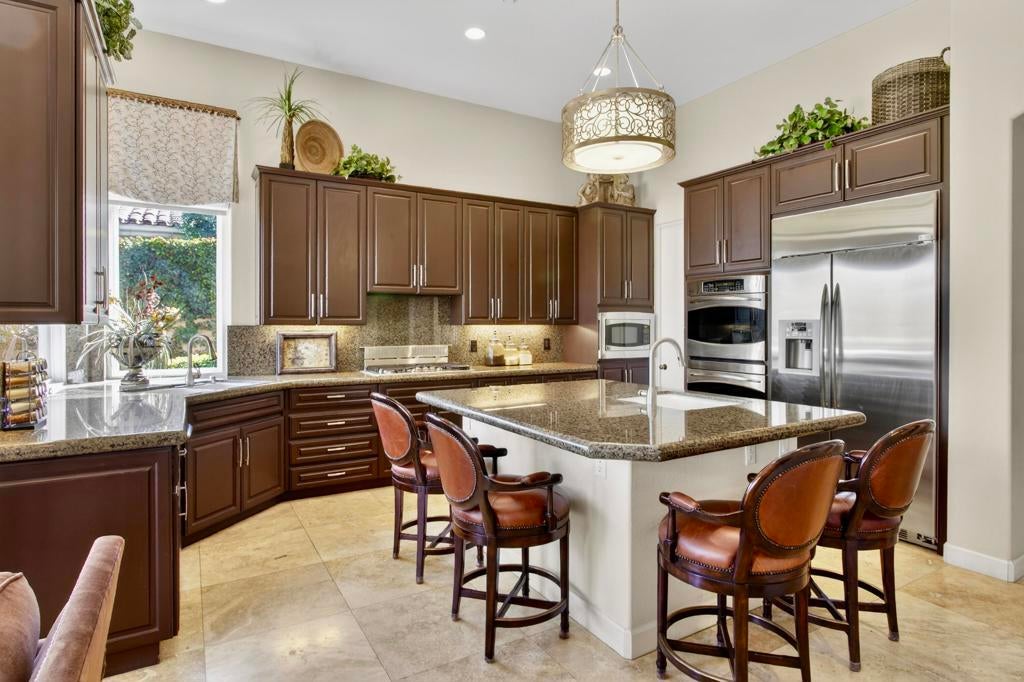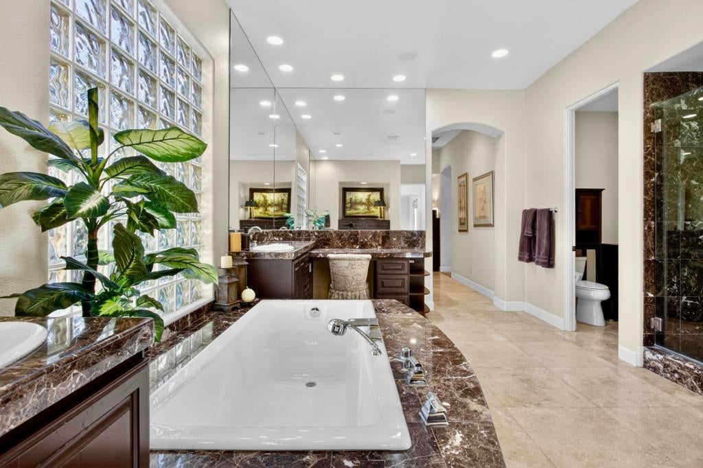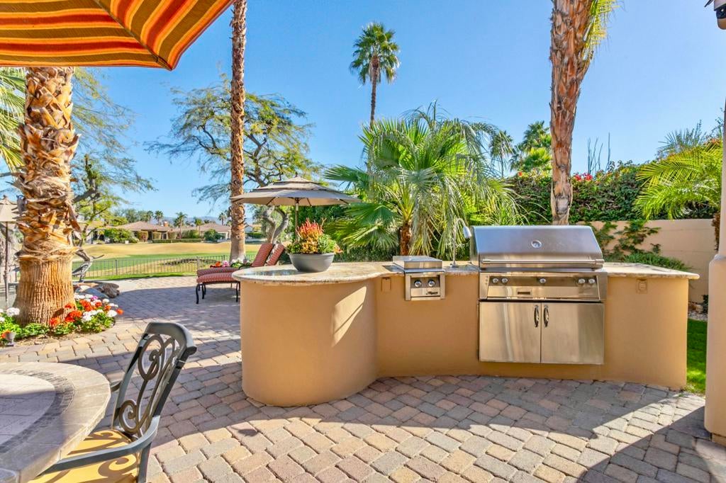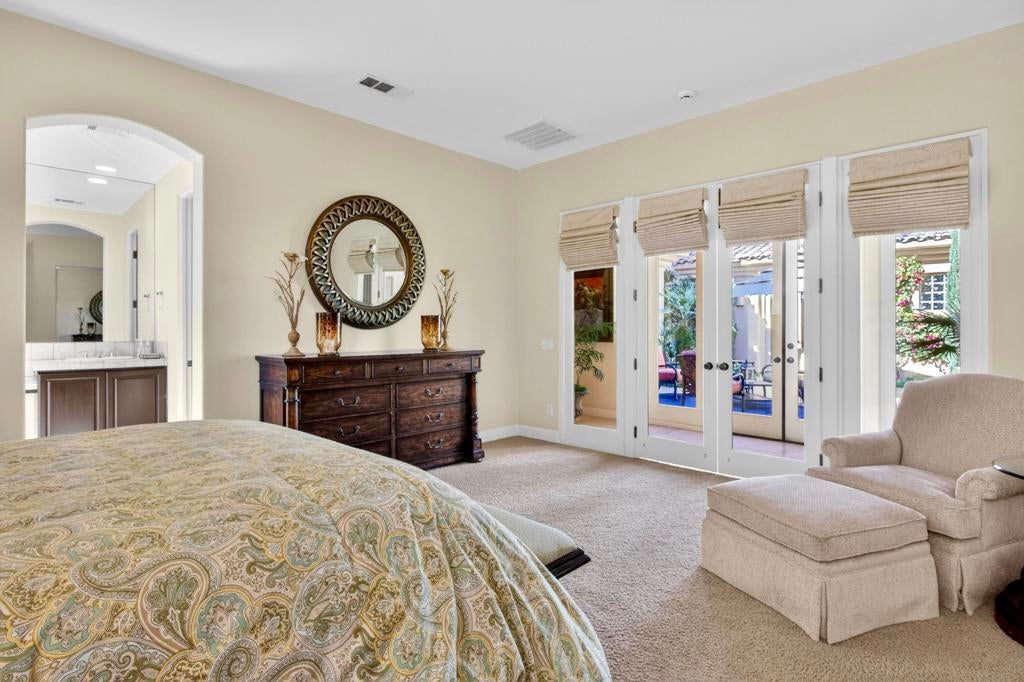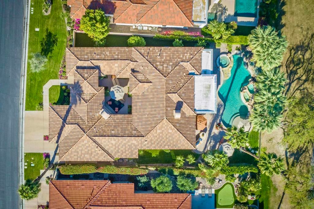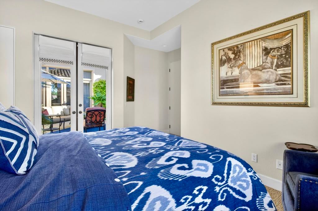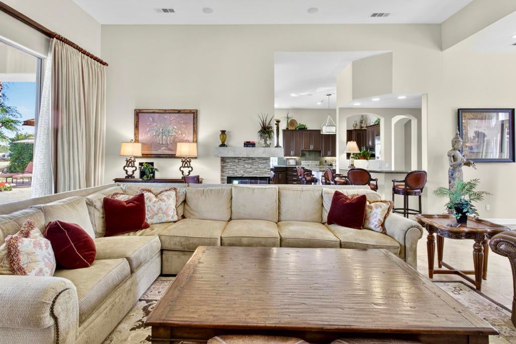 Nestled on the 10th hole of the Nicholas tournament course in PGA WEST this 4 bedroom 5 bath masterpiece blends Mediterranean charm with modern luxury. A coveted street to live on Weiskoff, this home is a masters 1 floor plan. Stunning entrance, as you step through an enchanted courtyard lush and inviting. The Formal entry welcomes you into a grand open great room, impeccably decorated, featuring travertine and mosaic tile floors, a see-through fireplace that separates the living and breakfast areas. A formal dining room illuminated by an elegant chandelier. The gourmet kitchen boasts beautiful cabinetry, granite countertops, a center Island, and stainless steel high-end appliances. There are 2 wine refrigerators, one being extra large in the Butler's pantry, and the other in the entertainer's wet bar. There is a place for everyone in this home! The spacious primary retreat has a large walk-in closet, beautiful granite showers, separate water closets, and a bonus room that can be used as an office or fitness room. There are gorgeous views. gorgeous views of the pool and golf course. There are panoramic Mountain views from all aspects on this property. The owners have done several upgrades from new A/C , new roof tiles, adding vintage lush, palms, citrus, fruit trees, new sound system and upgraded salt water pool unit for waterfall. A spa, tanning deck, fire pit, new built-in barbecue, new artificial turf. The covered patio allows plenty of space for dining and entertaining and privacy provided by multiple fruit trees. The Casita has a separate entrance from the main house. The home is close to Shopping, dining, World class Tennis BNP, festivals, and home to American Express PGA tournament. A true desert oasis comes turnkey furnished. Don't miss this opportunity. Welcome home!