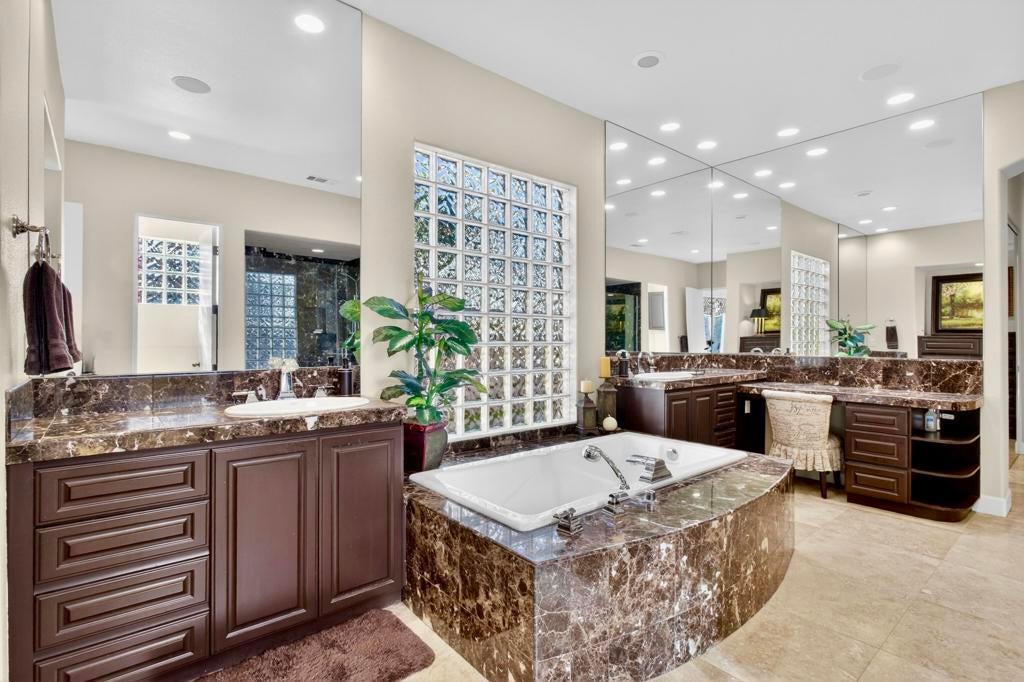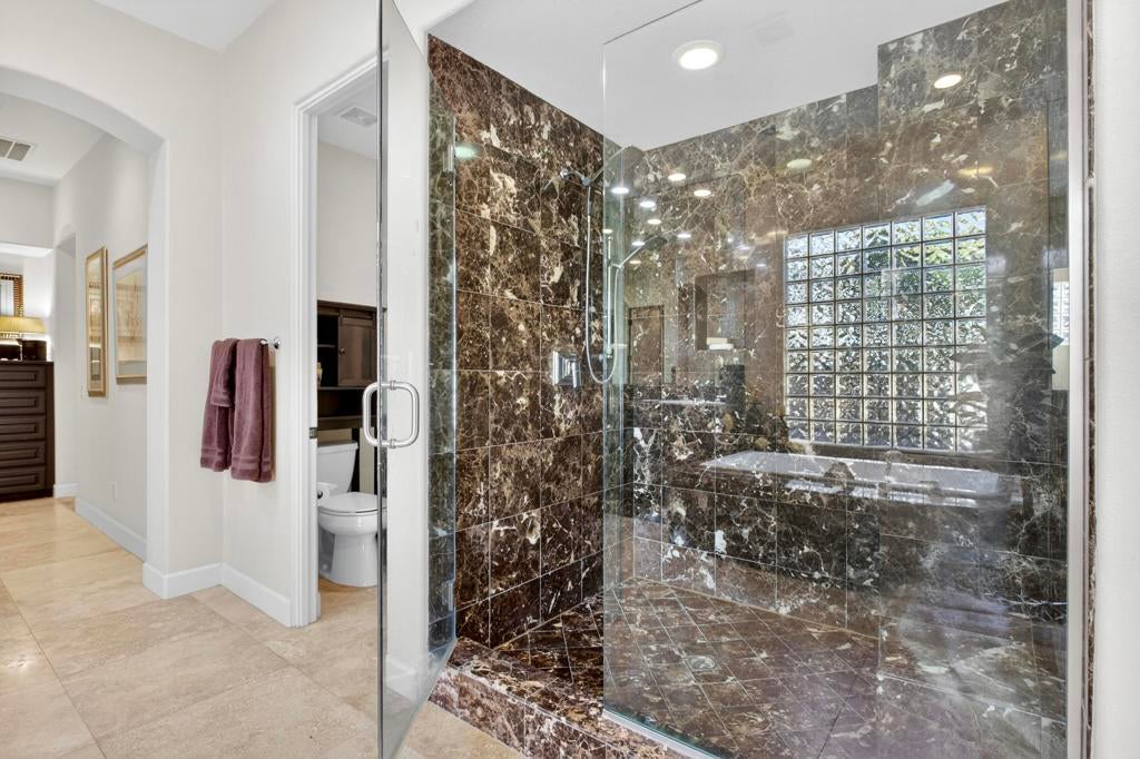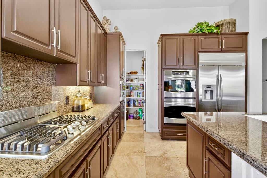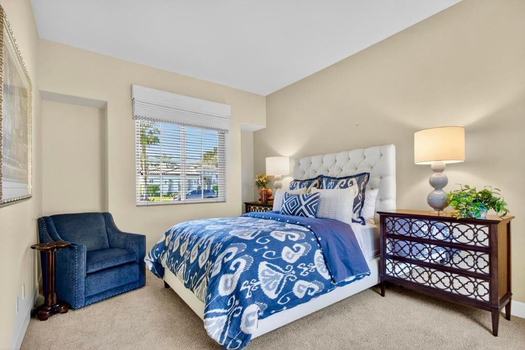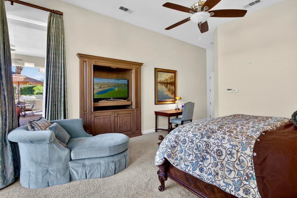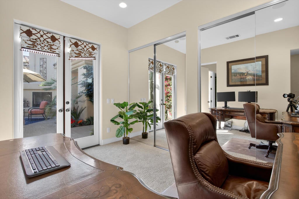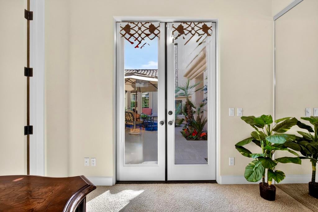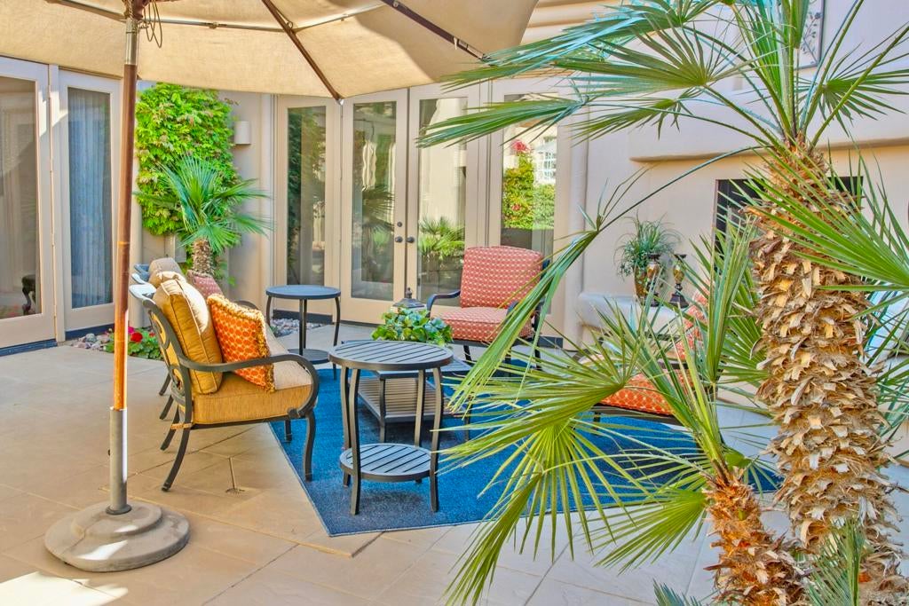 Nestled on the 10th hole of the Nicholas tournament course in PGA WEST this 4 bedroom 5 bath masterpiece blends Mediterranean charm with modern luxury. A coveted street to live on Weiskoff, this home is a masters 1 floor plan. Stunning entrance, as you step through an enchanted courtyard lush and inviting. The Formal entry welcomes you into a grand open great room, impeccably decorated, featuring travertine and mosaic tile floors, a see-through fireplace that separates the living and breakfast areas. A formal dining room illuminated by an elegant chandelier. The gourmet kitchen boasts beautiful cabinetry, granite countertops, a center Island, and stainless steel high-end appliances. There are 2 wine refrigerators, one being extra large in the Butler's pantry, and the other in the entertainer's wet bar. There is a place for everyone in this home! The spacious primary retreat has a large walk-in closet, beautiful granite showers, separate water closets, and a bonus room that can be used as an office or fitness room. There are gorgeous views. gorgeous views of the pool and golf course. There are panoramic Mountain views from all aspects on this property. The owners have done several upgrades from new A/C , new roof tiles, adding vintage lush, palms, citrus, fruit trees, new sound system and upgraded salt water pool unit for waterfall. A spa, tanning deck, fire pit, new built-in barbecue, new artificial turf. The covered patio allows plenty of space for dining and entertaining and privacy provided by multiple fruit trees. The Casita has a separate entrance from the main house. The home is close to Shopping, dining, World class Tennis BNP, festivals, and home to American Express PGA tournament. A true desert oasis comes turnkey furnished. Don't miss this opportunity. Welcome home!