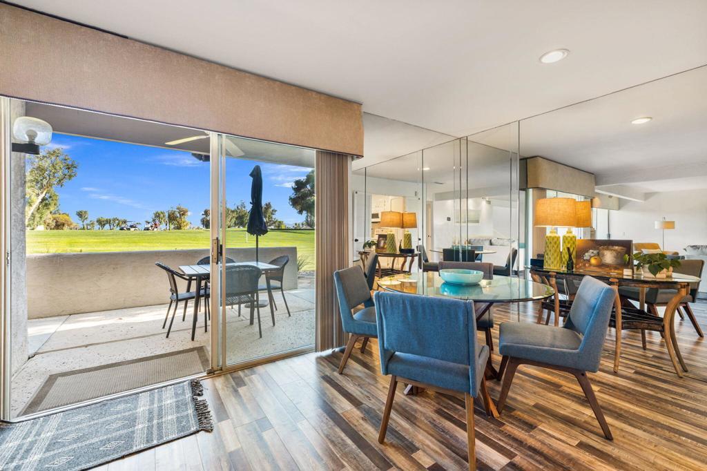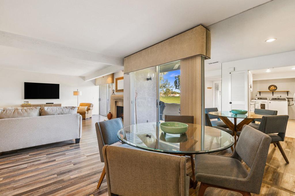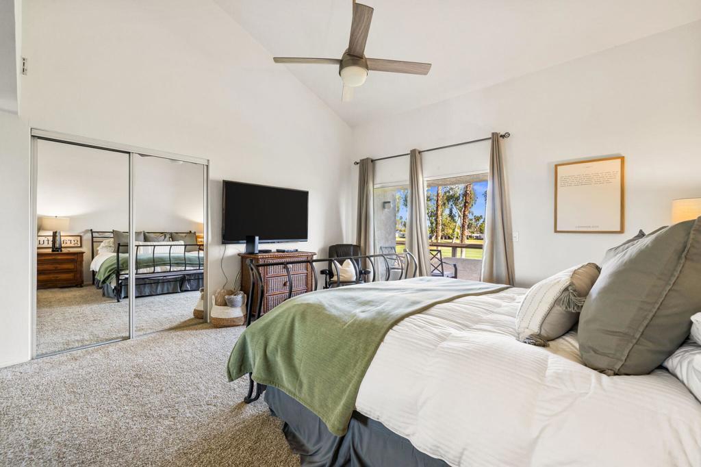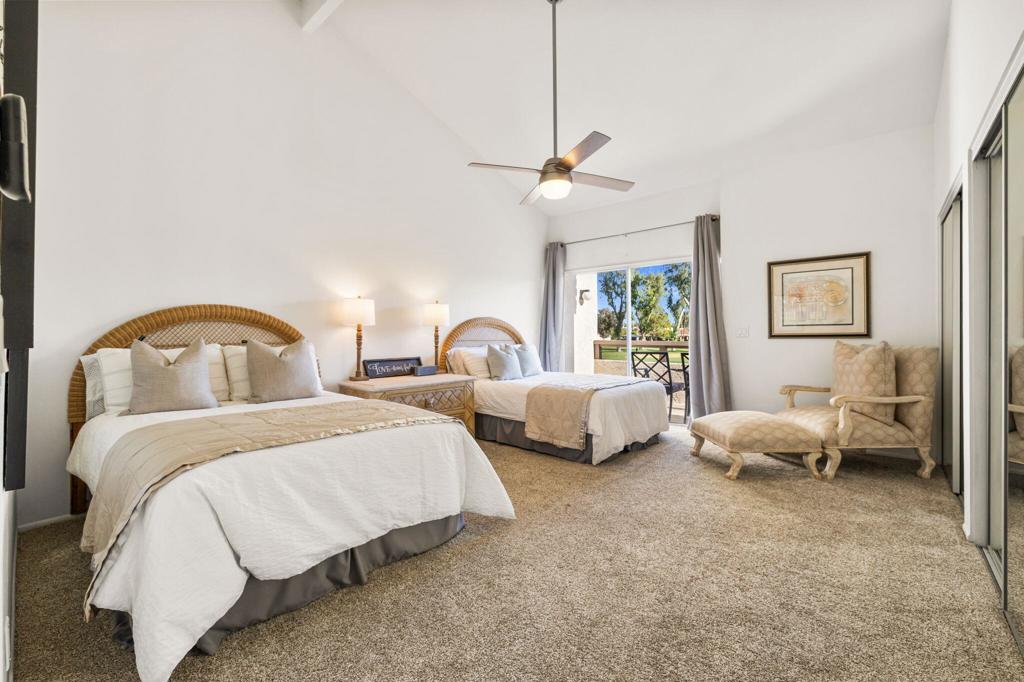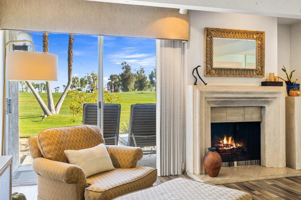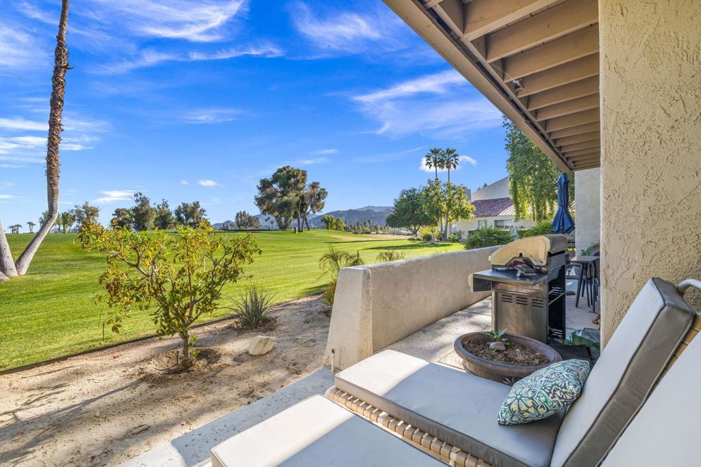 MOTIVATED SELLER! Set within the gates of Mission Hills Country Club, this TURNKEY FURNISHED Villas 3 residence enjoys sweeping views of the 17th hole on the Dinah Shore Tournament Course. The main living level features generous, light-filled living and dining spaces designed for both everyday comfort and effortless entertaining. A fireplace and bar elevate the space, while sliders extend the living area outdoors to two separate patios overlooking the fairway. The home has been thoughtfully updated with a newer air-conditioning system, water heater, and remodeled upstairs bathroom. Near the entry, the galley kitchen offers ample storage and includes a washer and dryer for added convenience. The upper level hosts two well-sized bedrooms, each opening to its own balcony with expansive golf course views and beautiful morning light. An additional west-facing deck provides a private retreat to enjoy mountain sunsets and desert evenings. Quietly positioned away from traffic, the property offers covered parking just steps from the front door along with secure, private storage. Purchasing a Social Membership offers privileges such as, access to Mission Hills' fitness center, tennis and pickleball courts, croquet lawns, and the recently enhanced clubhouse with multiple dining options. Optional golf memberships are available for those wishing to enjoy the legendary courses associated with the Bob Hope Classic and Dinah Shore LPGA events. Ideally located near Palm Springs International Airport, El Paseo, gaming, dining, and entertainment, this home is well suited as a primary residence, seasonal escape, or investment property. Land lease extended through 2121!
